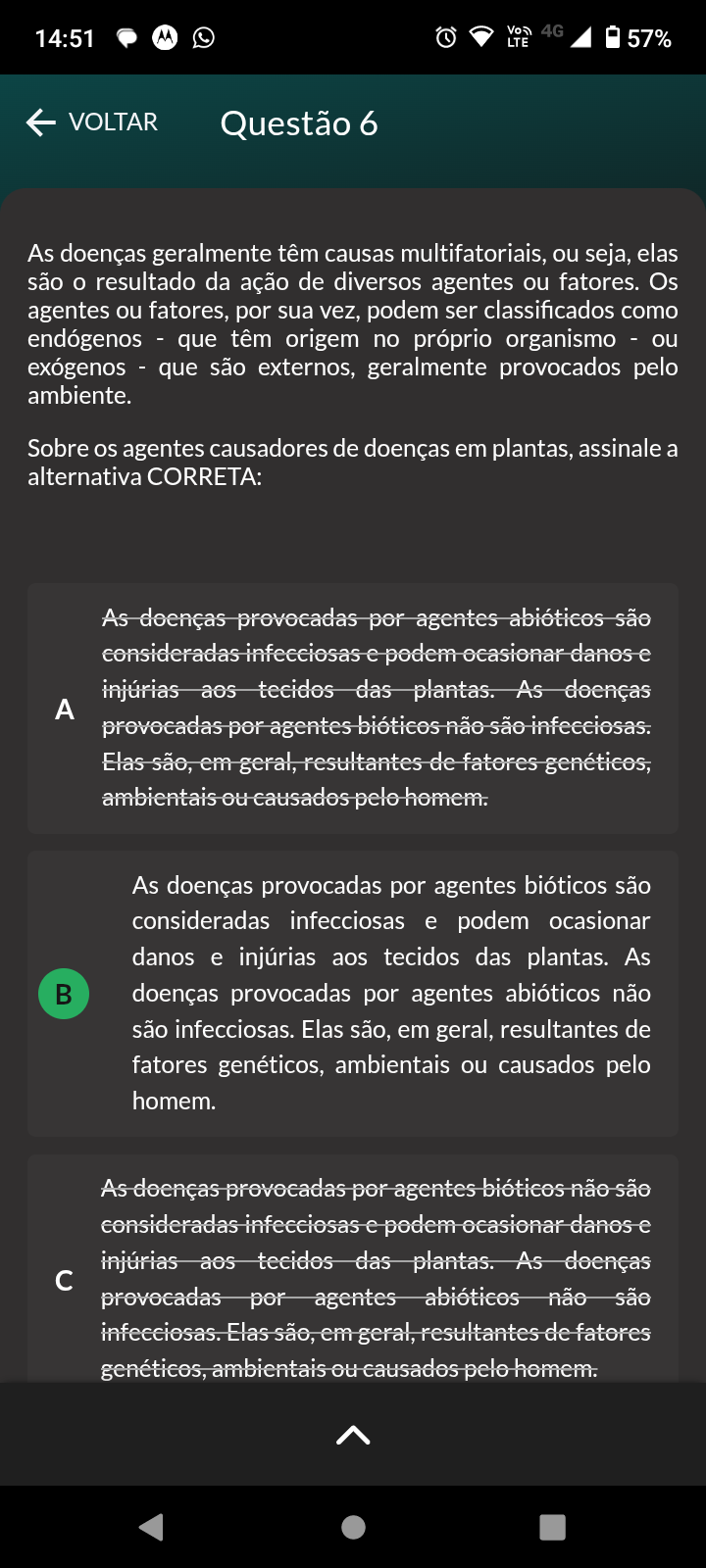 4G 14:51 LTE 57% VOLTAR Questão 6 As doenças geralmente têm causas multifatoriais, ou seja, elas são O resultado da ação de diversos agentes ou fatores. Os agentes ou fatores, por sua vez, podem ser classificados como endógenos - que têm origem no próprio organismo - ou exógenos - que são externos, geralmente provocados pelo ambiente. Sobre os agentes causadores de doenças em plantas, assinale a alternativa CORRETA: As doenças provocadas agentes abióticos são consideradas infecciosas e podem ocasionar danos e injúrias aos tecidos das plantas. As doenças A provocadas por agentes não são infecciosas. em geral, resultantes de fatores genéticos, ambientais ou causados pelo homem. As doenças provocadas por agentes bióticos são consideradas infecciosas e podem ocasionar danos e injúrias aos tecidos das plantas. As doenças provocadas por agentes abióticos não são infecciosas. Elas são, em geral, resultantes de fatores genéticos, ambientais ou causados pelo homem. As doenças provocadas agentes bióticos não são consideradas infecciosas e podem ocasionar danos e injúrias aos tecidos das As doenças provocadas por agentes abióticos não são infecciosas. Elas são, em geral, resultantes de fatores genéticos, ambientais ou causados pelo