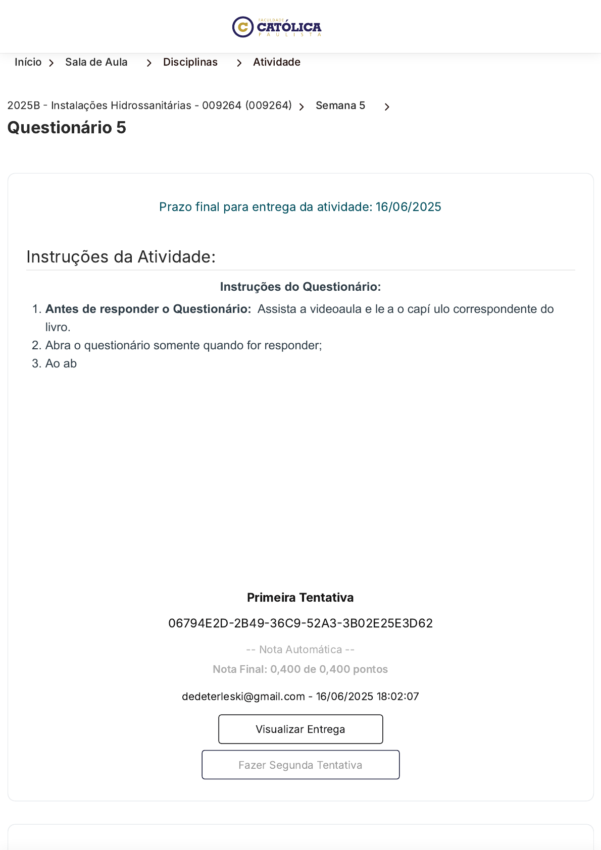 Início 〉 Sala de Aula 〉 Disciplinas 〉 Atividade 2025B - Instalações Hidrossanitárias - 009264 (009264) 〉 Semana 5 〉 Questionário 5 Instruções da Atividade: Prazo final para entrega da atividade: 16/06/2025 Instruções do Questionário: 1. Antes de responder o Questionário: Assista a videoaula e leia o capítulo correspondente do livro. 2. Abra o questionário somente quando for responder; 3. Ao abrir o questionário você terá 4 questões para responder; 4. Leia com calma todas as questões e entenda o que pede a questão: se pede a incorreta, a correta e qual o tema da questão; 5. Lembre-se de Clicar no botão "Enviar"; 6. Você tem duas tentativas para fazer o teste, a segunda tentativa é opcional; 7. Lembre-se que as respostas mudam de lugar em cada tentativa; 8. As respostas corretas só aparecem após o envio da segunda tentativa; 9. O sistema considera a maior nota entre as duas tentativas; 10. Lembre-se que na segunda tentativa zera TODAS as questões, inclusive as que você acertou na primeira tentativa. Bons estudos! Primeira Tentativa 06794E2D-2B49-36C9-52A3-3B02E25E3D62 -- Nota Automática -- Nota Final: 0,400 de 0,400 pontos dedeterleski@gmail.com - 16/06/2025 18:02:07 Visualizar Entrega Fazer Segunda Tentativa https://ava.uca.edu.br/aluno/sala-de-aula/disciplina/modulo/atividade/390893 https://ava.uca.edu.br/aluno/sala-de-aula/disciplina/modulo/atividade/390893 https://ava.uca.edu.br/aluno/sala-de-aula/disciplina https://ava.uca.edu.br/aluno/sala-de-aula/disciplina/modulo/atividade/:id/:nome javascript:void(0); Perguntas Pergunta 1. Pergunta 2. Pergunta 3. Pergunta 4. pontos: 0,100Pergunta 1. O projeto de instalações prediais de águas pluviais tem como objetivo conduzir as águas provenientes de precipitação, ou seja, chuvas por meio de tubulações até o seu destino final. Portanto, este projeto deve contemplar: Múltipla Escolha: A. Projeto executivo, memorial descritivo, especificações técnicas, quantificação e orçamento B. Projeto executivo, memorial descritivo, especificações técnicas e orçamento C. Projeto executivo, memorial descritivo, quantificação e orçamento D. Projeto executivo, memorial descritivo, especificações técnicas e quantificação E. Projeto executivo, memorial descritivo, quantificação e orçamento Avaliação Nota Avaliada: 0,100 de 0,100 javascript:void(0); pontos: 0,100Pergunta 2. Para dimensionamento de calhas considera-se área molhada, coeficiente de rugosidade, raio hidráulico e declividade. Dessa forma, é correto afirmar: Múltipla Escolha: A. O raio hidráulico é a razão entre o perímetro molhado e a área molhada B. A declividade mínima das calhas deve ser de 1% C. O coeficiente de rugosidade é uma constante D. A declividade mínima das calhas deve ser de 0,5% E. Para dimensionamento das calhas considera-se que ela sempre trabalha em seção inteira pontos: 0,100Pergunta 3. Avaliação Nota Avaliada: 0,100 de 0,100 javascript:void(0); Para a elaboração de um projeto de instalações prediais de águas pluviais, inicialmente deve-se conhecer os principais conceitos que compõem este projeto para facilitar a sua execução. Contudo, é correto afirmar: Múltipla Escolha: A. Intensidade pluviométrica: número médio de anos em que para a mesma duração de precipitação, uma determinada intensidade pluviométrica é igualada ou ultrapassada apenas uma vez B. Calha de beiral: Calha instalada na linha de encontro da cobertura com a platibanda C. Calha: canal que recolhe a água de coberturas, terraços e similares, e a conduz a um ponto destino D. Período de retorno: quociente entre a altura pluviométrica precipitada num intervalo de tempo E. Calha de água furtada: calha instalada na linha de beiral da cobertura pontos: 0,100Pergunta 4. Considera-se uma calha prismática com 20 cm de base e 10 cm de altura, trabalhando em meia seção com coeficiente de rugosidade de 0,012 e inclinação de 0,5%. Diante do exposto, a sua vazão equivale a: Avaliação Nota Avaliada: 0,100 de 0,100 javascript:void(0); Múltipla Escolha: A. 296,85 L/min B. 486,80 L/min C. 150 L/min D. 137,50 L/min E. 356,85 L/min Fechar Visualização 〈 Voltar aos Módulos 〈 Anterior Avaliação Nota Avaliada: 0,100 de 0,100 Próxima 〉 javascript:void(0); Faculdade Católica Paulista Contato Endereço Avenida Cristo Rei, 305 – Banzato Marília, São Paulo – CEP: 17515-200 Horário De Funcionamento Segunda a quinta, das 8:00 às 20:00 horas As sextas, das 8:00 às 18:00 horas. WhatsApp : (14) 9.8826-3000 Telefone Sede: (14) 3422-1815 Central de Atendimento: 0800 664 5583 E-mail : secretaria@uca.edu.br https://www.instagram.com/faculdadecatolicaead/ https://facebook.com/ucaead https://www.youtube.com/@UcaEduBr https://www.linkedin.com/school/faculdade-catolica-paulista/?originalSubdomain=br https://maps.app.goo.gl/wWsD9QX5fVPa3h6PA https://api.whatsapp.com/send?phone=5514988263000&text=Suporte tel:14-3422-1815 tel:14-3422-1815 tel:0800-664-5583 tel:0800-664-5583 mailto:secretaria@uca.edu.br javascript:void(0);