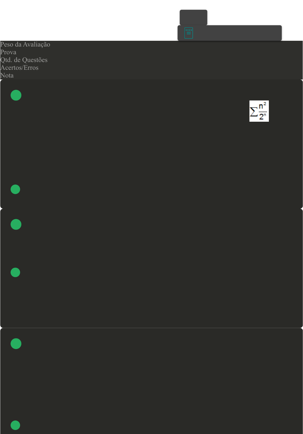 Prova Impressa GABARITO | Avaliação Final (Objetiva) - Individual (Cod.:1019477) Peso da Avaliação 4,00 Prova 101262049 Qtd. de Questões 10 Acertos/Erros 9/1 Nota 9,00 O teste da razão é utilizado para avaliar a convergência de uma série numérica. Utilize este teste e verifique se a série a seguir é convergente. Depois, assinale a alternativa CORRETA: A Como o limite calculado no teste é igual a 1, então nada podemos afirmar quanto à convergência da série. B Como o limite calculado no teste é maior que 1, então a série é divergente. C Como o limite calculado no teste é maior que 0 (zero), então a série é convergente. D Como o limite calculado no teste é menor que 1, então a série é convergente. Muitas vezes, para utilizarmos a demonstração por indução, é necessário primeiramente concluir o termo geral da sequência ou série que se está trabalhando. Assinale a alternativa CORRETA que apresenta o termo geral da série gerada pela soma dos números naturais ímpares: A n(n+2)/2 B n² C (n²+n)/2n D n(n²+2)/2n Um corpo em matemática é um conjunto de elementos os quais podemos realizar operações cujos resultados possuem algumas propriedades. Esta definição é fundamental para a demonstração de diversas outras propriedades numéricas. As operações que são definidas pelo conceito de corpo, são a adição e a multiplicação. A partir das propriedades da multiplicação a serem provadas para definir um corpo, assinale a alternativa CORRETA: A Existência de elemento oposto. B Princípio da Indução. C Associatividade. VOLTAR A+ Alterar modo de visualização 1 2 3 13/06/2025, 16:19 Avaliação Final (Objetiva) - Individual about:blank 1/4 D Existência de elemento com critério de divisibilidade. Um conjunto é dito compacto se toda sequência contida em X possui uma sub-sequência que converge para algum ponto de X. Informalmente falando, conjunto compacto é aquele que está condensado em algum lugar, e que podemos cobrir com quantidades finitas de outros conjuntos. Baseado nos conjuntos compactos, classifique V para as sentenças verdadeiras e F para as falsas: ( ) Todo conjunto fechado e limitado é compacto. ( ) Para mostrar que um determinado conjunto é compacto precisamos provar que para toda cobertura aberta existe subcobertura finita. ( ) O conjunto (0,1) é compacto. ( ) O conjunto [0,1] é compacto. Assinale a alternativa que apresenta a sequência CORRETA: A F - V - F - V. B V - V - F - V. C F - V - V - V. D V - V - F - F. Georg Cantor, matemático russo, denominou de conjuntos enumeráveis aqueles conjuntos em que é possível contar e numerar os seus elementos. Assim, é enumerável todo conjunto equipotente ao conjunto dos naturais. Em outras palavras, podemos dizer que um conjunto X é enumerável se: A For infinito ou possuir uma bijeção entre o conjunto x e o conjunto dos números naturais. B For finito e possuir uma bijeção entre o conjunto x e o conjunto dos números naturais. C For finito ou possuir uma bijeção entre o conjunto x e o conjunto dos números naturais. D For infinito e possuir uma bijeção entre o conjunto x e o conjunto dos números naturais. Existe uma técnica de demonstração muito parecida com a demonstração por absurdo, chamada de contrapositiva. Ela consiste em negar a tese e concluir a negação da hipótese. Assinale a alternativa CORRETA que apresenta a contrapositiva da seguinte sentença: Se Paulo come pouco, então Paulo é magro. A Paulo é gordo e come muito. B Paulo não come pouco, e nem é magro. C Paulo é magro e, portanto, come pouco. D Se Paulo é gordo, então Paulo come muito. 4 5 6 13/06/2025, 16:19 Avaliação Final (Objetiva) - Individual about:blank 2/4 Leia e responda a seguinte questão: A As opções I, II e III são verdadeiras. B As opções I, III e IV são verdadeiras. C As opções I e II são verdadeiras. D As opções III e IV são verdadeiras. O avanço no estudo de séries infinitas teve um papel importante no desenvolvimento do cálculo diferencial e integral. Muitos matemáticos eram fascinados pelos resultados impressionantes que vinham das somas infinitas, mas ficavam confusos ao tentar definir esses conceitos. Para eles, o infinito era alguma coisa para admirar, porém impossível de entender. Uma série numérica é a soma dos termos de uma sequência numérica. Sendo assim, assinale a alternativa CORRETA: A A soma dos termos de uma PA (Progressão Aritmética) é uma série. B Apenas as PAs (Progressão Aritmética) são séries. C Toda PA (Progressão Aritmética) é uma série. D A soma dos termos de uma PA (Progressão Aritmética) é uma sequência. Com a noção de vizinhança de um ponto, podemos distinguir os pontos que estão no "interior" de um conjunto. Esta análise pode auxiliar na determinação de conjuntos abertos e fechados. Sobre o exposto, analise as sentenças a seguir: I- O valor x = 3 é um ponto interior do conjunto (1,3]. II- O valor x = 3 é um ponto interior do conjunto (1,3). III- O valor x = 2 é um ponto interior do conjunto (2,1). 7 8 9 13/06/2025, 16:19 Avaliação Final (Objetiva) - Individual about:blank 3/4 IV- O valor x = 2 é um ponto interior do conjunto [1,2]. Assinale a alternativa CORRETA: A As sentenças II e III estão corretas. B As sentenças I e IV estão corretas. C As sentenças II e IV estão corretas. D As sentenças I e III estão corretas. Os números reais respeitam as propriedades de corpo ordenado e consigo trazem algumas propriedades importantes. Uma delas é a de que dados dois elementos a e b, temos a.b = b.a. O nome dado a esta propriedade é: A Comutatividade. B Associatividade. C Tricotomia. D Monotonicidade. 10 Revisar Conteúdo do Livro Imprimir 13/06/2025, 16:19 Avaliação Final (Objetiva) - Individual about:blank 4/4