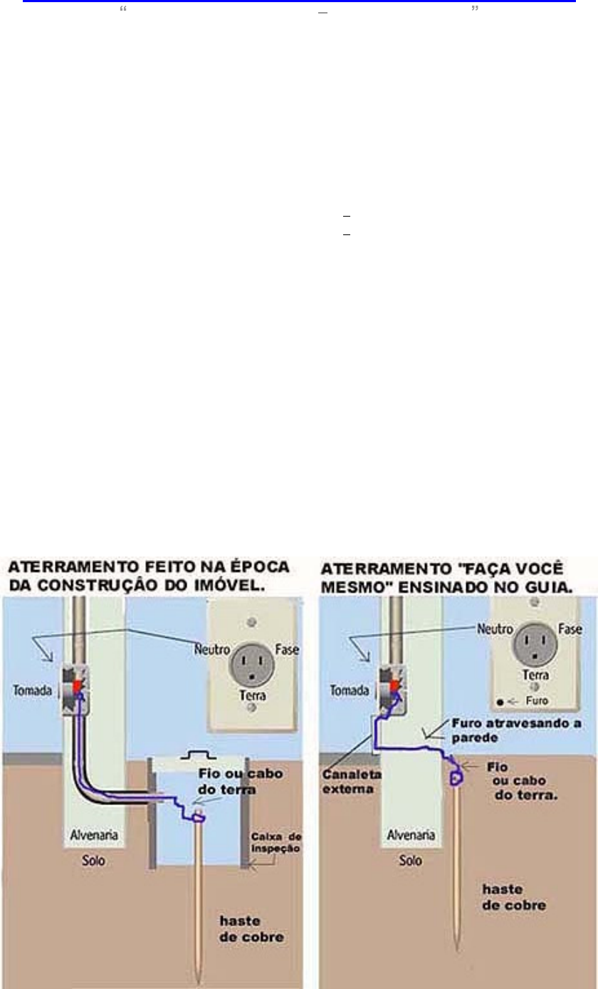 GUIA PRÁTICO DE ATERRAMENTO ELÉTRICO PARA LEIGOS Material público gratuito Não pague por ele O guia é composto pelos seguintes tópicos: INTRODUÇÃO Pág. 01 CONCEITOS BÁSICOS Pág. 02 MATERIAL NECESSÁRIO Pág. 04 FERRAMENTAS NECESSÁRIAS Pág. 05 MONTAGEM PASSO A PASSO Pág. 05 COMPRANDO O MULTÍMETRO Pág. 07 ENTENDENDO AS FUNÇÕES BÁSICAS DE UM MULTÍMETRO Pág. 09 EXECUTANDO MEDIÇÃO DE CORRENTE ALTERNADA (AVC) Pág. 10 EXECUTANDO MEDIÇÃO DE CORRENTE DO ATERRAMENTO MÉTODO 1 Pág. 11 EXECUTANDO MEDIÇÃO DE CORRENTE DO ATERRAMENTO MÉTODO 2 Pág. 12 INTRODUÇÃO Com relação à importância do aterramento, acreditamos que o interessado para ter chegado até este guia, já deve ter lido a respeito dos diversos benefícios proporcionados por este artefato, como por exemplo, prevenção de choques elétricos, aumento da vida útil de equipamentos eletro- eletrônicos, redução de ruídos em sistemas de áudio e Home Theaters, além da melhoria do funcionamento de computadores. A intenção deste guia é tornar o aterramento algo claro, simples e de fácil execução para quem é leigo em relação à eletricidade. É um material destinado a imóveis que não tiveram implantado aterramento elétrico por ocasião da construção. Seguindo as orientações, torna-se um trabalho prático, seguro e funcional, pois a intenção foi que qualquer usuário, com pouco ou nenhum conhecimento elétrico, pudesse executar as tarefas com eficiência e segurança. ATENÇÃO: O Guia é auto-explicativo em todos os tópicos, portanto, recomendo a quem ler e sentir-se inseguro, não executar os passos sem o auxílio de um eletricista. 2 2 CONCEITOS BÁSICOS Conforme já citado anteriormente, acreditamos que você já sabe que a principal função do aterramento é o escape para um local seguro, de energia dispensável . Seja por motivos de segurança, seja para efeitos de melhoria acústica, ou como meio de prolongamento da vida útil de equipamentos. Grosseiramente falando, o aterramento nada mais é do que uma ou mais hastes de cobre enterradas e ligadas a um fio ou cabo, que se estende até a(s) tomada(s). Na(s) tomada(s), este fio ou cabo será ligado ao terceiro orifício, que é destinado ao terra (nome popular). A tomada que aceita aterramento e tem conector para o fio terra, é a tomada TRIPOLAR (foto abaixo), ela possui três orifícios: o da fase + o do neutro + orifício do terra. Este é o padrão adotado por vários países e atualmente adotado por arquitetos na construção da rede elétrica dos imóveis brasileiros, pois este é o padrão de tomada tripolar indicada pelas normas da ABNT. No Brasil, principalmente nas casas e apartamentos mais antigos, o mais comum é a tomada BIPOLAR, que tem apenas o orifício do fase + orifíco do neutro. Veja nos exemplos abaixo. FOTO 1 Não é tomada tripolar, é bipolar para entrada de plugue com 2 pinos, sejam eles chatos ou redondos. FOTO 2 Não é tomada Tripolar, é bipolar e para entrada de plugue com 2 pinos, sejam eles chatos ou redondos, a diferença é só na hora de posicionar o cabo de força A tomada tripolar (à esquerda), foi feita para o cabo de força tripolar (à direita), apesar de aceitar cabos de força bipolares (cabo bipolar é o que não possui o terceiro pino, no caso da foto a direita, é o que não tem o pino redondo, que é o do terra). Veja explicação e fotos abaixo. 3 3 FOTO 3 Adaptador de plugue tripolar para bipolar redondo. Este adaptador permite encaixar um plugue de 3 pinos em uma tomada de 2 pinos, conforme foto 1 e 2. Observe que existe um terceiro orifício vazado, ele que assassina o pino do terra transformando o plugue de 3 pinos em 2. (Provavelmente invenção de algum português). FOTO 4 Adaptador de plugue tripolar para bipolar chato (mesma peça que foto 3). Este adaptador permite encaixar um plugue de 3 pinos em uma tomada de 2 pinos, conforme foto 1 e 2. Elimina também o terceiro pino (terra), fazendo com que deixe de existir na hora de encaixar na tomada. Obs: Os adaptadores não efetuam nenhuma ligação dentro da caixa de plástico, o pino do terra, quando conectado a esta orifício, morre ali mesmo, sem contato com nada, e este é o perigo - a fábrica que vende o adaptador, não fala que aterramento não é um acessório. FOTO 5 Plugue ou cabo de força tripolar; FOTO 6 Plugue ou cabo de força bipolar redondo; 4 4 FOTO 7 Plugue ou cabo de força bipolar chato; MATERIAL NECESSÁRIO 1 - Uma tomada de parede tripolar (3 orifícios) de embutir ou de fixar por cima da parede; 2 - Fio ou cabo de bitola entre 2,5mm² à 6mm², que é o recomendado pela ABNT; (Quanto maior a bitola do fio ou cabo, mais difícil é a conexão na tomada e mais difícil fazer curvas nas quinas de parede, caso seja necessário). Para compra, meça com folga da tomada escolhida até onde a haste ficará enterrada, contando com curvas, cantos, subidas e descidas. 3 - Uma ou mais hastes para aterramento, mede em torno de 2,40m; (quanto mais seco ou árido for o solo, recomenda-se mais hastes vendidas em casas de materiais de construção geralmente já com os conectores de prender o fio). Importante salientar que é possível tratar um solo ruim ou potencializar o solo para que se melhore a condição do aterramento. As opções são introduzir sal grosso na área em torno da(s) haste(s), carvão mineral, ou um produto que é mais difícil de encontrar, chamado sílica gel. O uso destes produtos não é obrigatório desde que a(s) haste(s), esteja(m) em um local que receba água com alguma constância mantendo o solo úmido. Ás vezes, o simples lavar de calçadas, e a água da chuva, já são suficientes para deixar úmida a área em volta das hastes. Alguns solos são tão bons para aterramento que dispensam qualquer cuidado. Se 1 haste: Deverá ser fincada reta em pé; Se 2 Hastes: Deverão ser fincadas retas em pé uma distante da outra; Se 3 hastes: Deverão ser fincadas no solo perfazendo um triângulo (/ | \)