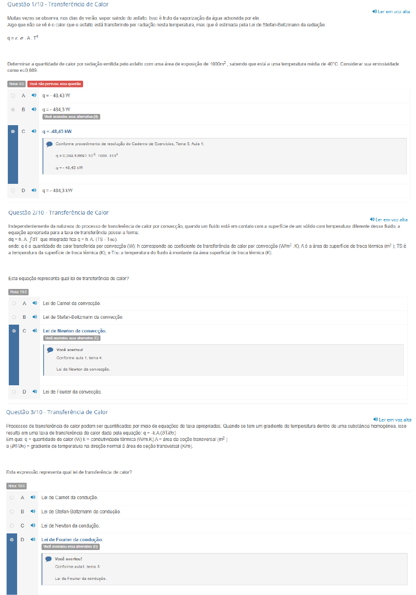Questão 1/10 Transferência de Calor Ler em voz alta Muitas vezes se nos dias de verão, vapor saindo do Isso é fruto da vaporização da água adsorvida por ele Algo que não se vê é calor que asfalto está transferindo por radiação nesta mas que é estimada pela Lei de Stefan-Boltzmann da Determinar a quantidade de calor por radiação emitida pelo asfalto com uma área de exposição de sabendo que está a uma temperatura média de Considerar sua emissividade como Nota 0.0 Você não pontuou essa questão A W B W Você assinalou essa alternativa C -48,43 kW Conforme procedimento de resolução do Caderno de Tema 5. Aula 1 3134 D Questão 2/10 Transferência de Calor Ler em voz alta Independentemente da natureza do processo de transferência de calor por quando um fluido está em contato com a superfície de um sólido com temperatura diferente desse fluido, a equação apropriada para a taxa de transferência possui a dq que integrada fica A (TS Too) a quantidade de calor transferida por convecção (W); h corresponde ao coeficiente de transferência de calor por convecção a área da superfície de troca térmica ): TS é a temperatura da superfície de troca térmica e Too a temperatura do fluido à montante da área superficial de troca térmica (K) Esta equação representa qual lei de transferência de calor? Nota 10.0 A Lei de Carnot da convecção. B Lei de Stefan-Boltzmann da convecção. C Lei de Newton da convecção. assinalou essa Você acertou! Conforme aula tema 4 Lei de Newton da convecção. D Lei de Fourier da convecção. Questão 3/10 Transferência de Calor Ler em voz alta Processos de transferência de calor podem ser quantificados por meio de equações de taxa apropriadas. Quando se tem um gradiente de temperatura dentro de uma substância homogênea, isso resulta em uma taxa de transferência de calor dada pela -k.A Em que: q quantidade de calor (W) k condutividade A = área da seção transversal e = gradiente de temperatura na direção normal à área de seção transversal Esta expressão representa qual lei de transferência de calor? Nota 10.0 A Lei de Carnot da condução B Lei de Stefan-Boltzmann da condução Lei de Newton da D Lei de Fourier da assinalou essa Você acertou! Conforme tema Lei de Fourier daQuestão 4/10 Transferência de Calor Ler em alta a 20°C escoa sobre uma tubulação de radiador automotivo de Cobre de 10m de comprimento, diâmetro externo de e espessura de parede de Determinar a quantidade de calor trocada por convecção entre a sabendo que a superfície desta está a Considerar h=16,5 Nota 0.0 Você não pontuou essa questão A 22383 W B 2238,3 W Resposta. Primeiro ajustamos as unidades: 2" m e 0,56mm 0,56. 20°C 293K e 105°C 378K Formulário: Lei de Newton da Convecção: q h. (Ts Too) q = 10. (378-293) 2238,3 W C 223,83 W Você assinalou essa alternativa (C) D -22,383 W Questão 5/10 Transferência de Calor Ler em voz alta Água a 92°C condensa em um condensador de cobre cuja temperatura superficial é 50°C. gerando uma vazão de condensado de Determinar h para a condensação em regime laminar, sabendo que a área de troca térmica do condensador é de 50 TABELA A.6 Propriedades termofisicas da água Volume Calor de Calor Condutividade Coeficiente Específico Especifico Térmica de Tensão de Tempera- Prandt Tempera T 10 (K) (kJ/kg) Pr, (N/m) T(K) 273.15 1,000 2502 4,217 1,854 1750 8.02 569 18.2 12.99 75.5 -68.05 273.15 275 0.00697 1,000 181.7 2497 4,211 1,855 1652 8.09 574 0.817 75,3 -32.74 275 280 0.00990 1,000 130.4 2485 4,198 1422 8.29 582 18.6 10.26 0.825 46.04 280 285 0.01387 1,000 99.4 2473 4,189 1,861 1225 8.49 590 18.9 8.81 0.833 114.1 285 290 0.01917 1,001 2461 4,184 1,864 1080 8.69 598 19.3 7.56 174.0 290 295 0.02617 1,002 51.94 2449 4,181 1,868 959 8.89 606 19.5 6.62 0.849 72.7 227.5 295 300 0.03531 1,003 39.13 2438 4,179 1,872 855 9.09 613 19.6 5.83 0.857 71.7 276.1 300 305 1,005 29.74 2426 4,178 1,877 769 9.29 620 20.1 5.20 0.865 320.6 305 310 0.06221 1,007 22.93 2414 4,178 1,882 695 9.49 628 20.4 0.873 310 315 0.08132 1,009 17.82 2402 4,179 1,888 631 9.69 634 20.7 4.16 0.883 69.2 400.4 315 320 1,011 13.98 2390 4,180 1,895 577 9.89 640 3.77 0.894 436.7 320 325 0.1351 1,013 2378 4,182 1,903 528 10.09 645 3.42 0.901 67.5 471.2 325 330 1,016 8.82 2366 4,184 1,911 489 10.29 650 21.7 3.15 0.908 66,6 504.0 330 335 0.2167 1,018 7.09 2354 4,186 1,920 453 10.49 656 22.0 2.88 0,916 65.8 535.5 335 340 0.2713 1,021 5.74 2342 4,188 1,930 420 660 22.3 2.66 566.0 340 345 0.3372 1,024 4,683 2329 4,191 1,941 389 10.89 664 22.6 2.45 0.933 64.1 595.4 345 350 1,027 3,846 2317 4,195 1,954 365 11.09 668 23.0 2.29 63.2 624.2 350 355 1,030 3,180 2304 4,199 1,968 343 11.29 671 23.3 2.14 0,951 62.3 652.3 355 360 0.6209 1,034 2,645 2291 4,203 1,983 324 11.49 674 23.7 2.02 61.4 697.9 360 365 0.7514 1,038 2,212 2278 4,209 1,999 306 11.69 677 24.1 0.969 60.5 707.1 365 370 0.9040 1,041 1,861 2265 4,214 2,017 289 11.89 679 24.5 59.5 728.7 370 1,0133 1,044 1,679 2257 4,217 2,029 279 12.02 680 24.8 58.9 750.1 373.15 375 1.0815 1,045 1,574 2252 4,220 2,036 274 12.09 681 24.9 1.70 58.6 761 375 380 1.2869 1,049 1,337 2239 4,226 2,057 260 12.29 683 25.4 1.61 0.999 788 380 Nota: 10.0 A B 54,24 assinalou essa alternativa (B) Você acertou! Resposta: Conforme Aula 3, Tema 5, Exercícios de Aplicação da Aula 3 Aula Prática 2 Primeiro ajustamos as unidades: 92°C 365K 50°C 323K Segundo, obter as propriedades da tabela: h, 2278. Formulário: = C 5,424 0,5424Questão 6/10 Transferência de Calor Ler em voz alta É bastante usual vermos galpões industriais com paredes de chapas de aço galvanizado, que nada mais é que um aço com baixo teor de Como 0 aço é um metal, apresentará uma boa condutividade 0 que afetará conforto do ambiente de Dá inclusive para estimar a quantidade de calor que uma parede de aço galvanizado transfere para este ambiente. Para isso é usada a Lei de já na sua forma considerando a parede simples qx (AT/Ax) sen