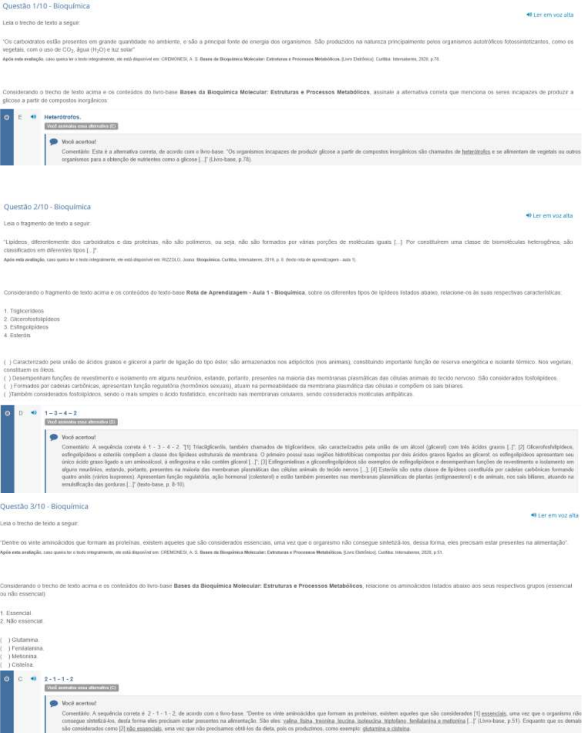 Questão 1/10 Bioquímica Ler em alta trecho de texto a estão presentes em grande quantidade no e são a principal de energia dos organismos produzidos na organismos como com de (H2O) e A Bases Processor Considerando trecho de acima e os do Bases da Bioquimica Estruturas e Processos que menciona seres incapazes de a glicose a de compostos E Você Esta a de incapazes de produzir a partir de são E alimentam de vegetais outrus organismos para de nutrientes como a glicose Questão 2/10 Let em alta Lea o de texto a dos carboidratos e das não são seja, não são formados por várias porções de Por uma classe de são classificados em tipos - de 11 Considerando de acima e 05 do de Aprendizagem Auta 1 sobre tipos de lipideos às respectivas Triglicerideos 2 3 4 ( Caracterizado pesa união de ácidos graxos e gliceroi a partir de ligação do tipo são armazenados nos (nos constituindo importante função de reserva e Nos constituem ( ) Desempenham funções de revestimento e presentes na das membranas plasmáticas das animals 00 São considerados ) Formados por apresentam função atuam na permeabilidade membrana plasmática das 08 considerados sendo mais D encontrado nas membranas considerados D 1-3-4-2 A 3 4 chamados de de com a classe de o compostas per ácidos ligados an seu único ligado a um à não são de de e em presentes na das do outra de constituida por quatro Apresentam função ação hormonal presentes de plantas 6 de nos das Questão 3/10 Bioquímica Ler em voz alta Leta trecho de texto a os vinte que as que são considerados uma vez que organismo não consegue dessa precisam estar presentes na - em A Bases the Considerando 0 de do Bases da Bioquimica Molecular Estruturas e Processos os listados abaixo seus respectivos grupos (essencial não essencial) 1 Essencial Não essencial Glutamina Metionina Cisteina 2-1-1-2 A 2-1-1-2 de com vinte que forman as aqueles que são considerados uma vez que não forma estar na Enquanto que demais são considerados como não uma que não precisamos da as comoQuestão 4/10 Ler em alta excerto de texto a seguir também de quando a um são undades estruturais que as proteinas 18 de Considerando excerto de texto acima e os do Rota de Aprendizagem Auta 1 sobre os anaise as afirmativas a marcando (V) para as verdadeiras e (F) para as Todo è composto um grupo um grupo um átomo de e um grupo lateral (grupo todos ao mesmo de Os seres são por somente 20 todos sintetizados pelo todas as proteinas formadas a partir destes 20 ) A entre os pode ser através do grupo R ou lateral de acordo com polandade e tendência em com a são classificados em 5 grupos A Você A V As I e são pois "A quimica aminoácidos da um um amine de um grupo lateral (grupo mesmo de carbono (carbono como grupo R É polaridade desse mesmo grupo pela sua do interagir com a pH que classificados es am A é pois seres são pelos 20 porém superiores não conseguem todos Par que não de cuja dela 10-12) Questão 5/10 Bioquimica Let em alta Observe as imagens a Figura 1 H CH-OH H OH =0 HO HO H OH H OH OH H OH Figura 2 o H H H H H OH OH H OH H HO H H OH H OH as em de Considerando as imagens acima e conteúdos do Rota de Aula 1 sobre as a marcando (V) para as verdadeiras (F) para as ( ) Na primeira imagem (figura se observa dois monossacarideos classificados como que são entre ( ) A figura 1 representa duas sendo a uma - devido presença da a segunda uma a qual se da da função ) A figura 2 a formação de no caso por pela reação entre um grupo de um dos e liberando uma de (sintese por E 40 A 1 representa para função - e para função a meio de ligações ligados dissacarideos até Esse de ligação é formado poin reação entre um de um dos (carbone do grupo do outro Formação am ligação base Questão 6/10 Ler em Leia o de a "As vitaminas são orgânicas que em pequenas quantidades para manter funcionamento do nosso Elas participam de diversas em nosso organismo e de A = Considerando de acima conteúdos do Bases da Estruturas # Processos alternativa correta que apresenta qual carência de vitaminas E 40 Você Esta é acordo com liven-base "A carência de conhecida importantes a visual a de aQuestão 7/10 - Bioquímica Leia o fragmento de texto a seguir: "O Ciclo de Krebs, também denominado "Ciclo do Ácido compreende uma série de reações em sequência [...]". Após esta avaliação, caso queira ler texto integralmente, ele está disponível em: RIZZOLO, Joana. Bioquímica. Curitiba, Intersaberes, 2019, p. 9. (texto rota de aprendizagem aula 2). Considerando fragmento de texto acima e os conteúdos do texto-base Rota de Aprendizagem Aula 2 sobre Ciclo de Krebs, analise as afirmativas a seguir: I. Nos eucariotos, ocorre nas cristas mitocondriais, que são invaginações da membrana interna da II. No Ciclo de Krebs, piruvato produzido pela glicólise é oxidado, gerando água e gás carbônico. III. primeiro passo a ser considerado é a entrada do piruvato na matriz mitocondrial e sua conversão em IV. A mitocôndria tem três membranas limitantes, a membrana externa, membrana interna e a membrana indiferente. D As M III estão que dus no dos de produzido H2O CO2 am de ser a ou a outro produto considerado entrada na matriz em IT As IV III de denominado Cide Acide uma de reações em que matriz no citoplasma dos que dues essa última é essas pregas são interior da a 9-10) Questão 8/10 Bioquímica Ler em Leia extrato de texto a mecanismos de regulação são no cicio de para garantir seu funcionamento de acordo com da esta Considerando o extrato de texto e conteúdos do Bases da Bioquimica Estruturas e Processos assinale a correta que de regulação no de Krebs D Conversão de piruvato em Você Esta de acordo com regulação conversan do em PDH que be essa ATP NADH Questão 9/10 Let em alta Leia texto a Ao contrário do que pensam é importante para 0 funcionamento do organismo desempenhando funções extremamente não sendo apenas causador de doenças da Considerando 0 tex
