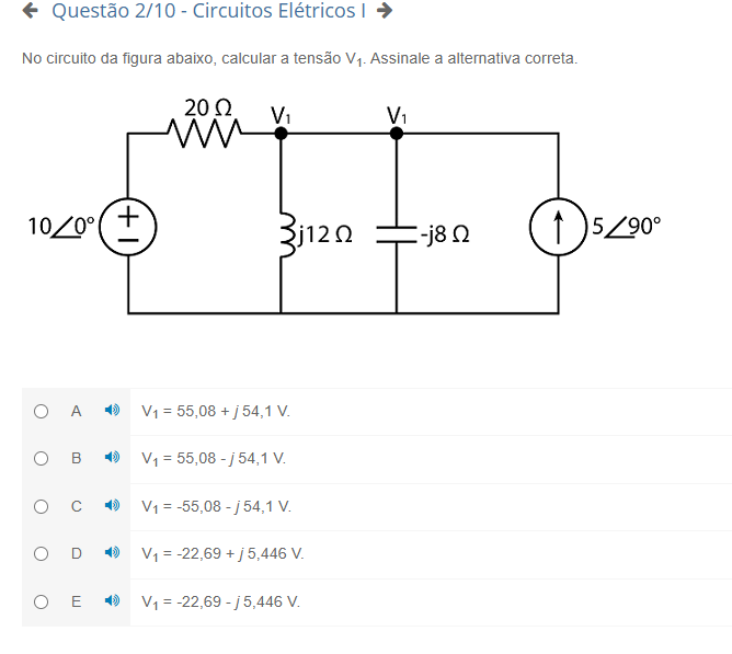 Questão 2/10 - Circuitos Elétricos I No circuito da figura abaixo, calcular a tensão Assinale a alternativa correta. V1 V1 + -j8 5 /90° A B C D V. E V1 V.