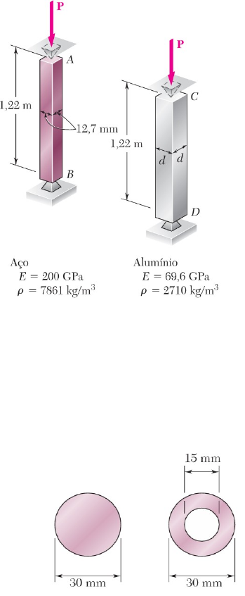 Lista de Exercícios de flambagem para ser entregue em 1) Determine a dimensão d para a qual as escoras de alumínio e de aço terão o mesmo peso e calcule para ambas o valor da carga crítica. 2) Um elemento comprimido com comprimento de flambagem de 1,5m consiste em uma barra de seção cheia, de latão, com 30 mm de diâmetro. Para reduzir o peso do elemento em 25%, a barra de seção cheia é substituída por uma barra de seção vazada como a seção transversal mostrada. Determine (a) a porcentagem de redução na força crítica e (b) o valor da força crítica para a barra de seção vazada. Use E = 105 GPa. 3) A barra AB de alumínio que tem seção retangular de 20 x 36 mm é conectada por pinos e suportes conforme a ilustração. Cada uma das extremidades da barra pode rotacionar livremente em relação a um eixo horizontal por meio dos pinos, embora a rotação em relação ao eixo vertical esteja impedida pelos suportes. Usando E = 70 GPa, determine a carga P centrada admissível se o coeficiente de segurança requerido é igual a 2,5. 4) 5) Sabendo que P = 5,2 kN, determine o coeficiente de segurança para a estrutura mostrada. Use E = 200 GPa e considere flambagem somente no plano da estrutura. 6) Se a carga C tem massa igual a 500 kg, determine o diâmetro mínimo para que o cilindro maciço de aço AB não sofra flambagem. Use um fator de segurança igual a 2 e considere E = 200 GPa. image5.png image1.png image2.png image3.png image4.png