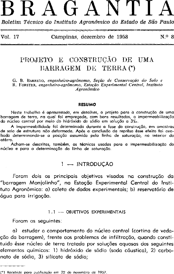 P R O J E T O E CONSTRUÇÃO DE UMA BARRAGEM DE T E R R A (*) G . B . BARRETO, engenheiro-agrônomo, Seção de Conservação do Solo e R. FORSTER, engenheiro-agrônomo, Estação Experimental Central, Instituto Agronômico RESUMO Neste trabalho é apresentado, em detalhes, o projeto para à construção de uma barragem de terra, na qual fo i empregada, com bons resultados, a impermeabil ização do núcleo central por meio do hidróxido de sódio em solução a 3%c. A impermeabil idade foi determinada durante a fase da construção, em amostras de solo de estrutura não deformada. Após a conclusão da represa esse efeito foi ava liado determinando-se a posição assumida pela l inha de saturação, no interior do aterro. Acham-se descritas, também, as técnicas usadas para a impermeabil ização do núcleo e para a determinação da l inha de saturação. (*) Recebido para publ icação em 22 de novembro de 1957. b) es tudar o m e l h o r teo r de u m e d e c i m e n t o do solo pelo imper - m e a b i l i z a n t e , a f i m de que a c o m p a c t a ç ã o do mesmo se processe d e n t r o das me lhores cond ições ; c) es tudar a posição da l i n h a de sa tu ração e m b a r r a g e m de t e r r a c o m núc leo i m p e r m e a b i l i z a d o por u m a das soluções e n u m e r a d a s ; d) d e t e r m i n a r dados e x p e r i m e n t a i s p a r a f u t u r a s ap l i cações p rá t i cas . 1 .2 — OBJETIVO PRÁTICO Obte r á g u a e m q u a n t i d a d e su f i c i en te pa ra a tende r às necess ida des resu l tan tes de exper iênc ias de i r r i gação de cu l t u ras . N o presente t r a b a l h o são apresentados os dados e x p e r i m e n t a i s co le tados d u r a n t e a cons t rução da re fe r i da b a r r a g e m . 2 _ M A T E R I A L E M É T O D O 2 . 1 — LOCALIZAÇÃO A esco lha do local des t inado à cons t rução de u m a b a r r a g e m de v e r á , sempre que possíve l , reca i r sobre u m a g a r g a n t a es t re i ta s i t u a d a p r ó x i m a do local a ser bene f i c i ado pe la cons t rução , a f i m de b a r a t e a r o seu cus to e t a m b é m o da u t i l i z a ç ã o d a á g u a a r m a z e n a d a . N o caso d a b a r r a g e m M o n j o l i n h o , e n t r e t a n t o , o local j á se encon t r a v a p r e v i a m e n t e d e t e r m i n a d o : e la deve r ia ser cons t ru ída no mesmo local e m que ex is t iu a n t i g a b a r r a g e m , t a m b é m de t e r r a p o r é m de m u i t o menores proporções, e d a qua l he rdou o nome . 2 . 2 — DADOS DjSPONÍVEIS I n i c i a l m e n t e e r a m os segu in tes os dados d isponíve is p a r a o r i e n t a r a cons t rução : a) l e v a n t a m e n t o p l a n i m é t r i c o e a l t i m é t r i c o d a Estação Exper i m e n t a l C e n t r a l do I ns t i t u to A g r o n ô m i c o , n a escala 1:5 0 0 0 ; b) l e v a n t a m e n t o p l a n i m é t r i c o e a l t i m é t r i c o d a bac i a de i n u n d a ção , na escala 1 :400, curvas de n íve l locadas de m e t r o e m m e t r o ; c) á rea a p r o x i m a d a d a bac ia de c a p t a ç ã o , a v a l i a d a e m 2 5 1 , 4 1 0 7 ha e ob t i da de p l a n t a do m u n i c í p i o de C a m p i n a s ; d) vasão do cór rego c o n t r i b u i n t e d a b a r r a g e m , m e d i d a por me io de ver tedores t r i a n g u l a r (ângu lo de 90° ) e r e t a n g u l a r (so le i ra 0 ,72 c m ) a m b o s de paredes de lgadas (apresen tada no g r á f i c o da f i g u r a 1 - A ; e) dados locais de p rec ip i t ação m é d i a mensa l pa ra o per íodo 1 9 4 3 - 1 9 5 2 , c o n f o r m e o g r á f i c o da f i g u r a 2 ; f ) dados sobre evaporação : — na f a l t a de dados loca is sobre perdas de á g u a por evaporação , por g e n t i l e z a da L i g h t a n d Power Co . , de São Pau lo , u t i l i z a m o s resu l tados obt idos pa ra loca l idade p r ó x i m a (quadro 1) ; g) aná l i se f í s i co -mecân i ca do solo local ( t e r r a - r o x a - m i s t u r a d a ) , p roven ien te de m is tu ras e m porções va r iáve is en t re o a r e n i t o de Bo- t u c a t u e a t e r r a - r o x a - l e g í t i m a (9) : a r g i l a 4 8 % ; a re i a grossa 2 0 , 0 % ; l imo 3 2 % ; c lass i f i cação : a rg i l oso ; h) teores de m a t é r i a o r g â n i c a a vá r ias p r o f u n d i d a d e s , no local de onde ser ia r e t i r ada t e r r a p r i n c i p a l m e n t e pa ra a cons t rução da c o r t i n a de vedação e t a l ude de m o n t a n t e da b a r r a g e m (quadro 2 ) ; i) dados sobre i n f i l t r a ç ã o : — inex i s t i ndo dados e x p e r i m e n t a i s sobre o m o n t a n t e das perdas de á g u a por i n f i l t r a ç ã o l oca l , f o i a m e s m a a v a l i a d a e m 2 5 % do t o t a l ; j ) dados sobre necessidades do consumo : — dest inando-se a á g u a a c u m u l a d a na b a r r a g e m p r i n c i p a l m e n t e p a r a f i n s e x p e r i m e n t a i s de i r r i gação , o consumo depende r i a do n ú m e r o de exper iênc ias de i r r i gação conduz idas , das condições c l i m á t i c a s e do t i p o de c u l t u r a e m e x p e r i m e n t a ç ã o . 2 . 3 — TIPO DE BARRAGEM ESCOLHIDA A esco lha d a cons t rução p a r a a b a r r a g e m M o n j o l i n h o reca iu no t i p o de g r a v i d a d e , sendo t e r r a o m a t e r i a l empregado . A s ba r ragens de t e r r a c o n s t i t u e m boa so lução, p r i n c i p a l m e n t e p a r a pequenos represamentos e p a r a os casos e m que a f u n d a ç ã o deva repousar sobre t e r r a . 2 . 3 . 1 — FORMA Foi esco lh ida a forma retilínea, por ser a ma is i nd i cada pa ra a n a t u r e z a do m a t e r i a l des t inado à cons t rução . 2 . 3 . 2 — PERFIL Escolheu-se o pe r f i l homogêneo, c o m inc l i nação do t a l u d e de m o n t a n t e de 3:1 e o de j usan te 2 , 5 : 1 , f o r m a t r a p e z o i d a l , a base meno r c o n s t i t u i n d o a pa r te super 