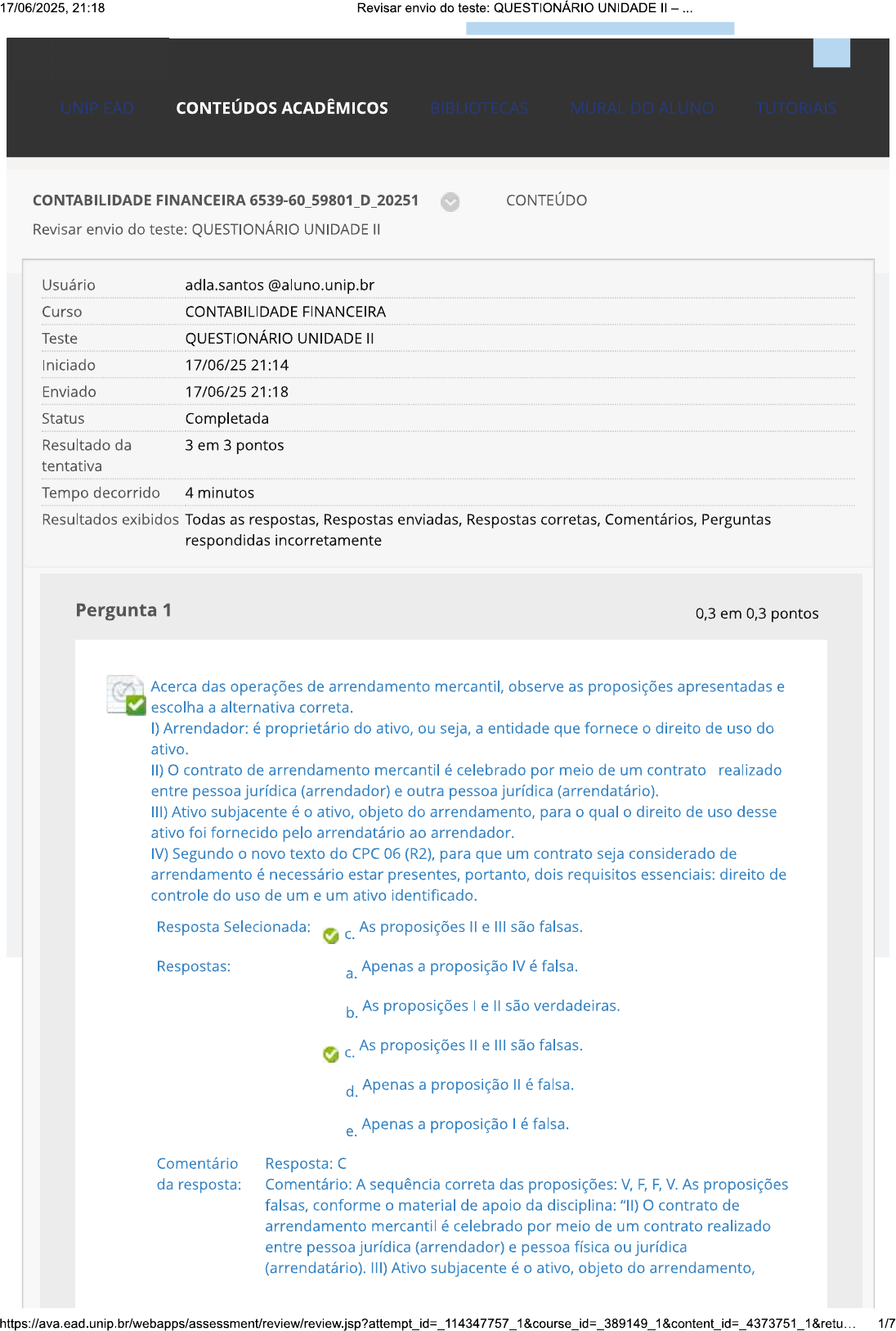 17/06/2025, 21:18 Revisar envio do teste: QUESTIONÁRIO UNIDADE - UNIP EAD CONTEÚDOS ACADÊMICOS BIBLIOTECAS MURAL DO ALUNO TUTORIAIS CONTABILIDADE FINANCEIRA 6539-60_59801_D_20251 CONTEÚDO Revisar envio do teste: QUESTIONÁRIO UNIDADE II Usuário adla.santos@aluno.unip.br Curso CONTABILIDADE FINANCEIRA Teste QUESTIONÁRIO UNIDADE Iniciado 17/06/25 21:14 Enviado 17/06/25 21:18 Status Completada Resultado da 3 em 3 pontos tentativa Tempo decorrido 4 minutos Resultados exibidos Todas as respostas, Respostas enviadas, Respostas corretas, Comentários, Perguntas respondidas incorretamente Pergunta 1 0,3 em 0,3 pontos Acerca das operações de arrendamento mercantil, observe as proposições apresentadas e escolha a alternativa correta. Arrendador: é proprietário do ativo, ou seja, a entidade que fornece o direito de uso do ativo. II) contrato de arrendamento mercantil é celebrado por meio de um contrato realizado entre pessoa jurídica (arrendador) e outra pessoa jurídica (arrendatário). III) Ativo subjacente é o ativo, objeto do arrendamento, para o qual o direito de uso desse ativo foi fornecido pelo arrendatário ao arrendador. IV) Segundo o novo texto do CPC 06 (R2), para que um contrato seja considerado de arrendamento é necessário estar presentes, portanto, dois requisitos essenciais: direito de controle do uso de um e um ativo identificado. Resposta Selecionada: As proposições II e III são falsas. C. Respostas: Apenas a proposição IV é falsa. a. b. As proposições e são verdadeiras. As proposições II e III são falsas. C. d. Apenas a proposição é falsa. Apenas a proposição é falsa. e. Comentário Resposta: C da resposta: Comentário: A sequência correta das proposições: V, F, As proposições falsas, conforme o material de apoio da disciplina: contrato de arrendamento mercantil é celebrado por meio de um contrato realizado entre pessoa jurídica (arrendador) e pessoa física ou jurídica (arrendatário). III) Ativo subjacente é o ativo, objeto do arrendamento, 1/717/06/2025, 21:18 Revisar envio do teste: QUESTIONÁRIO UNIDADE ... para o qual o direito de uso desse ativo foi fornecido pelo arrendador ao Pergunta 2 0,3 em 0,3 pontos Com essa nova redação (CPC 06 R2), alguns contratos que não eram considerados de arrendamento mercantil poderão ser assim considerados, bem como arrendamentos atuais poderão ser desconsiderados como tais. Desse modo, na contratação do arrendamento mercantil, a entidade deve avaliar se o contrato é ou contém um arrendamento. O CPC 06 (R2), item 9, define quando um arrendamento é ou contém um arrendamento da seguinte forma: contrato é ou contém um arrendamento se ele transmite o direito de controlar o uso do ativo identificado por: Resposta Um período de tempo em troca de contraprestação. a. Selecionada: Respostas: Um período de tempo em troca de contraprestação. a. b. Um valor estabelecido entre as partes, que atenda à norma brasileira de contabilidade. Contrato de prestação de serviço. C. d. Uma pessoa jurídica com outra pessoa jurídica Interesse das partes envolvidas na transação. e. Comentário Resposta: A da resposta: Comentário: As demais alternativas são falsas, pois, conforme estudamos, o texto correto é: "O CPC 06 (R2) item 9 define quando um arrendamento é ou contém um arrendamento da seguinte forma: o contrato é ou contém um arrendamento se ele transmite o direito de controlar o uso do ativo identificado por um período de tempo em troca de contraprestação." Pergunta 3 0,3 em 0,3 pontos Existiram várias razões para a mudança do reconhecimento dos ativos e passivos e o respectivo reflexo nas demonstrações contábeis, exceto: Resposta e. Selecionada: A segregação dos arrendamentos em financeiro e operacional gerava grande confusão para os usuários da informação. 2/717/06/2025, 21:18 Revisar envio do teste: QUESTIONÁRIO UNIDADE Respostas: a. Na crise financeira de 2008 muitas empresas apresentavam balanços indicando excelente posição financeira, mas quebravam em seguida, pois os balanços não representavam sua real saúde financeira. b. Contratos de aluguéis de longo prazo não eram reconhecidos no balanço patrimonial. C. Os passivos de aluguéis de longo prazo, muitas vezes com valores significativos, não estavam reconhecidos e, portanto, o balanço das entidades não refletia a existência de passivos. d. As despesas de aluguéis eram apresentadas de maneira equivocada, prejudicando a análise das demonstrações financeiras ao não serem apresentadas de forma transparente, como despesas de depreciação e despesas financeiras. e. A segregação dos arrendamentos em financeiro e operacional gerava grande confusão para os usuários da informação. Comentário Resposta: E da resposta: Comentário: As demais alternativas são verdadeiras, conforme o material de apoio da disciplina, e a alternativa E representa a exceção das razões, visto que a segregação no reconhecimento dos arrendamentos entre "financeiro e operacional" não foi extinta com o CPC 06 R2, não sendo, deste modo, uma das razões para a mudança. Pergunta 4 0,3 em 0,3 pontos Na data de início, o passivo do arrendamento deve ser mensurado pelo valor presente dos pagamentos do arrendamento a serem pagos futuramente. valor presente de cada parcela deve ser descontado utilizando-se a taxa de juros implícita no contrato, quando puder ser determinada imediatamente. Se essa taxa não puder ser determinada imediatamente, deve-se usar: Resposta Selecionada: C. A taxa incremental sobre o empréstimo do arrendatário. Respostas: índice do IPCA. a. b. A taxa Selic atualizada. A taxa incremental sobre o empréstimo do arrendatário. C. d. percentual de um terço do valor do bem. e. índice especificado no contrato Comentário Resposta: C da resposta: Comentário: As demais alternativas são falsas, tendo em vista o contido no material de poio da disciplina: "Na data de início, o passivo do arrendamento dev