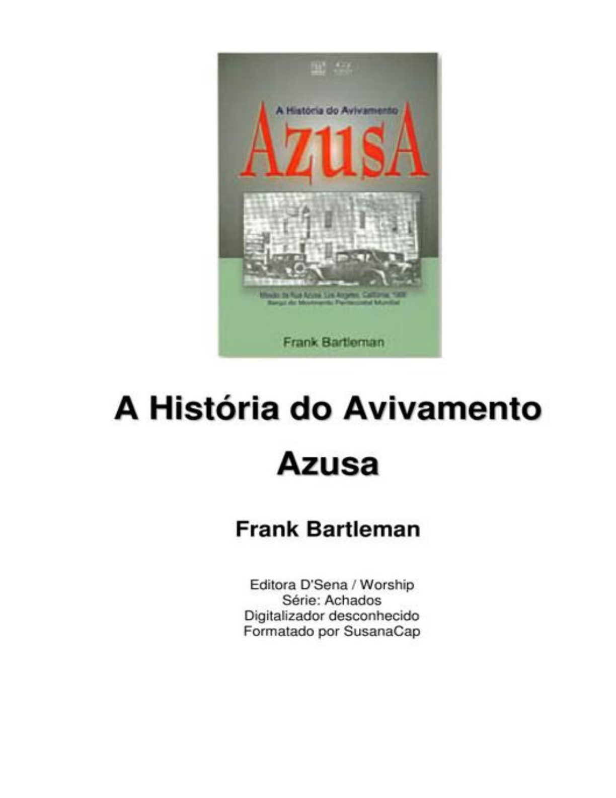 A História do Avivamento Azusa Frank Bartleman Editora D'Sena / Worship Série: Achados Digitalizador desconhecido Formatado por SusanaCap A história do "Avivamento Azusa" Este autêntico relato do derramamento do Espírito Santo sobre Los Angeles, em 1906, há de chocar o movimento Pentecostal atual por mostrar que eles têm deixado seu primeiro amor, quase na mesma medida em que os metodistas se apartaram do ardor flamejante de John Wesley. Além disso, todo cristão sério se maravilhará ao descobrir o que Deus realmente operou no início deste século e como aquela tremenda obra do Espírito foi incompreendida e rejeitada. Finalmente, este relato comovente deverá desafiar todo o povo de Deus a buscá-lo para a consumação daqueles propósitos, para o aperfeiçoamento da igreja de Cristo, que foram avançados de forma tão poderosa naquela época. Prefácio Este livro foi compilado a partir do diário e dos escritos de Frank Bartleman, sendo publicado originalmente por ele em 1925, com o título "Como o Pentecostes chegou em Los Angeles". Muito mais do que um relato histórico, é um chamado à Igreja para o arrependimento sob três aspectos: DIVISÕES CARNAIS do CORPO de CRISTO, LIDERANÇA e PROGRAMAÇÃO HUMANAS em SUBSTITUIÇÃO ao ESPÍRITO SANTO, e EXALTAÇÃO de CREDOS em VEZ de CRISTO. Esta é a hora para o povo de Deus, afligido pelos mesmos pecados hoje ouvir, mais uma vez, esta voz de alerta que tem estado silenciosa por tanto tempo. Ao autor, talvez mais do que a qualquer outra pessoa, foi confiada a responsabilidade de orar pela profunda obra que o Espírito Santo realizou. Para louvor e glória de Deus, o Avivamento Azusa não trouxe honra para homem algum. Como testemunho disso o nome de nenhuma pessoa está ligado à ele. Entretanto, pode-se dizer com segurança que não houve testemunha mais fiel do que ocorreu, que Frank Bartleman. Quem seria mais qualificado para conhecer e registrar o avivamento, senão alguém que sofreu intensas dores de parto no seu nascimento, zelou dele ternamente, e defendeu-o corajosamente no início de sua vida? Será notado neste relato, que panfletos que contavam a visitação do Espírito Santo no País de Gales, em 1904, foram a centelha inicial para o grande Avivamento de Los Angeles em 1906. Durante o ano de 1905, enquanto Frank Bartleman se correspondia com Evan Roberts do País de Gales, e os dois se uniam em oração, o Sr. Bartleman e outros, divulgavam em Los Angeles, a mensagem do Avivamento de Gales exortando o povo a orar. Ora, à medida que o povo de Deus recebia a visão e permanecia em oração, a pequena centelha transformou-se numa grande chama, a qual se espalhou, até se tornar numa conflagração mundial: o Avivamento Pentecostal na Igreja de Jesus Cristo. Assim como o relato escrito do Avivamento de Gales levou o povo a orar em 1905, que também a verdadeira história do Avivamento Azusa em 1906, há muito tempo esquecida e incompreendida, atinja o mesmo propósito hoje. Povo Pentecostal, volte! Corações famintos, fartem-se! Povo de Deus em todo lugar, ajoelhe-se! Deus de Elias, MANDA FOGO! John Walker, Los Angeles, Califórnia, Janeiro de 1962 Capítulo 1 - O COMEÇO DO AVIVAMENTO A MINHA CHAMADA O autor das páginas que se seguem chegou à Los Angeles, na Califórnia, com sua esposa e duas filhas, a mais velha de três anos e meio, no dia 22 de dezembro de 1904. Nossa filha mais velha, Ester, começou a ter convulsões e foi ficar com o Senhor Jesus, às 4 horas da manhã, do dia 7 de janeiro. Nossa pequena "Rainha Ester" perecia ter nascido para "tal tempo como este" (Ester 4:14). Ao lado daquele pequeno caixão, com meu coração sangrando, dediquei minha vida novamente à obra de Deus. Na presença da morte, como se tornam reais os assuntos eternos! Eu prometi que o resto da minha vida seria dedicado exclusivamente à Ele. E Ele fez uma nova aliança comigo. Supliquei-lhe, então, que logo me abrisse uma nova porta de serviço, para que eu não tivesse tempo de sofrer com o que acontecera. Apenas uma semana depois da partida de Ester, comecei a pregar duas vezes por dia na pequena Missão Peniel, em Pasadena (Califórnia). Muitas pessoas foram salvas durante o encontro que durou um mês, mas a maior vitória foi a descoberta de um grupo de jovens que assistiam ao encontro. Alguns foram chamados pelo Senhor para futuros trabalhos. No dia 8 de abril ouvi pregar F. B. Mayer, de Londres. Ele descreveu o grande avivamento que se desenrolava no País de Gales, onde acabara de estar e conhecera Evan Roberts. Minha alma se comoveu profundamente, pois pouco antes eu também havia lido a respeito desse avivamento. Prometi ali mesmo a Deus dar-lhe direito total sobre a minha vida, se fosse possível me usar. Distribuí folhetos no prédio do correio, em bancos e edifícios públicos em Los Angeles e visitei muitos bares. Depois visitei mais de trinta bares em Los Angeles. Os prostíbulos estavam abertos naquele tempo e distribuí muitos folhetos ali também. A morte da pequena Ester havia quebrado meu coração e eu sentia que só poderia viver enquanto servisse ao Senhor. Ansiava conhecê-lo de uma forma mais real e ver a obra de Deus avançar com poder. Um grande peso e desejo surgiram no meu coração para que houvesse grande avivamento. Ele estava me preparando para um novo serviço Seu. Este, porém, só poderia acontecer quando houvesse em meu coração um anseio mais profundo por Deus e uma verdadeira dor de parto na minha alma pela Sua obra. Isto Ele me deu. Muitos estavam sendo preparados de forma semelhante nesta época em diferentes lugares do mundo. Deus estava prestes a visitar e libertar seu povo mais uma vez. Eram precisos intercessores. "Maravilhou-se de que não houvesse um intercessor" (Isaías 59:16). "Busquei entre eles um homem que tapasse o muro e se colocasse na brecha perante mim a favor desta terra, para que eu não a destruísse; mas a ninguém achei." (Ezequiel 22:30) Por volta de primeiro d