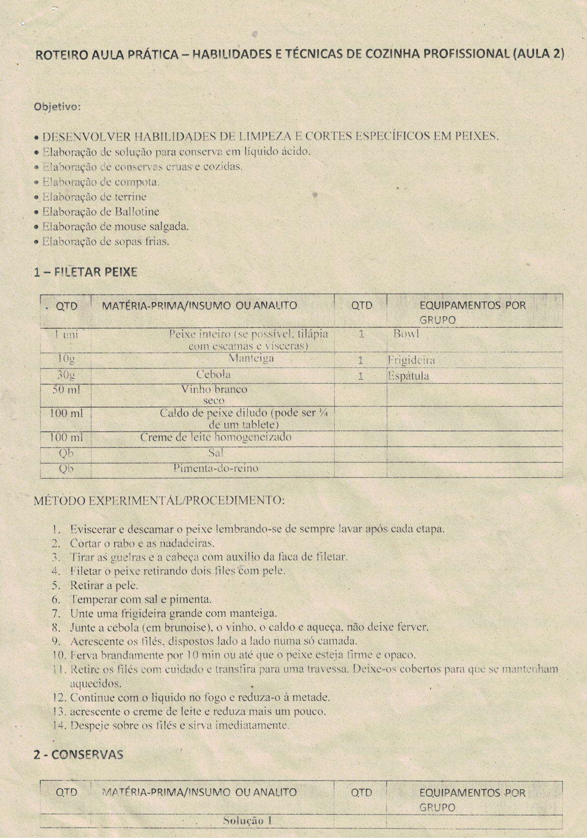 ROTEIRO AULA PRÁTICA HABILIDADES E TÉCNICAS DE COZINHA PROFISSIONAL (AULA 2) Objetivo: DESENVOLVER HABILIDADES DE LIMPEZA E CORTES ESPECÍFICOS EM PEIXES. Elaboração de solução para conserva em líquido Elaboração de conservas e cozidas. Elaboração de compota. Elaboração de terrine Elaboração de Ballotine Elaboração de mouse salgada. Elaboração de sopas frias. FILETAR PEIXE QTD OU ANALITO QTD EQUIPAMENTOS POR GRUPO 1 uni Peixe inteiro (se tilápia 1 Bowl com escamas e vísceras) 10g Manteiga 1 Frigideira 30g Cebola 1 Espátula 50 ml Vinho branco seco 100 ml Caldo de peixe diludo (pode ser 1/4 de um tablete) 100 ml Creme de leite homogeneizado Qb Sal Qb Pimenta-do-reino 1. Eviscerar e descamar o peixe lembrando-se de sempre lavar após cada etapa. 2. Cortar o rabo e as nadadeiras. 3. Tirar as guelras e a cabeça com auxilio da faca de filetar. 4. Filetar o peixe retirando dois files com pele. 5. Retirar a pele 6. Temperar com sal e pimenta. 7. Unte uma frigideira grande com manteiga. 8. Junte a cebola (em brunoise). o vinho. o caldo e não deixe ferver. 9. Acrescente os dispostos lado a lado numa camada. 10. Ferva brandamente por 10 min ou até que peixe esteja firme e opaco. 11. Retire os filés com cuidado e transfira para uma travessa. Deixe-os cobertos para que se mantenham 12. Continue com o liquido no fogo e reduza-o à metade. 13. acrescente o creme de leite e reduza mais um pouco. 14. Despeje sobre os filés e sirva 2 - CONSERVAS QTD OU ANALITO QTD EQUIPAMENTOS POR GRUPO Solução 1500ml Vinagre (preferência de 150g Açúcar 10g Sal 10g Ajinomoto Solução 2 500ml Vinagre de arroz tozan 150g 100ml saquê mirim uso culinário 10g Sal 10g Ajinomoto METODO EXPERIMENTAL/PROCEDIMENTO: Solução para conserva 1 Modo de preparo: Dissolver todo açúcar no vinagre e agregar sal e Ajinomoto. Utilizar em preparações cozidas ou assadas depois de frias para conservar. Guardar a solução em refrigerador. Solução para conserva 2 (sunomono) Modo de preparo: Dissolver todo açúcar no vinagre e agregar o sal, o saquê e o Utilizar em preparações cozidas ou assadas depois de frias para conservar. Guardar a solução em refrigerador. QTD OU ANALITO QTD EQUIPAMENTOS POR GRUPO 200g Cebola roxa 1 Panela 30g Orégano 1 Bowl 300g Batata 1 Assadeira 20g Cebolinho 1 Fouet 100g Cebola 4 unid. Maçã vermelha Qb Sal Qb Pimenta 5g Tempero Curry 50ml Azeite MÉTODO EXPERIMENTAL/PROCEDIMENTO: Conserva de cebola roxa Corte a cebola em rodelas com auxilio do robocup e misture com o Agregue a solução para conserva 1 e armazene em recipiente plástico com tampa sob refrigeração Conserva de batata Lave bem as batatas e corte com casca em cubos médios. Coloque para cozinhar com água e sal até que fique ao dente (pré-cozida) Escorra as batatas é deixe esfriar. Coloque as batatas em um recipiente grande, a cebola picada em o cebolinho bem o sal e a pimenta. Para finalizar acrescente a solução para conserva 1 e 2 até cobrir as batatas. Armazene em recipiente fechado sob refrigeração. Conserva de ao curry Lamine as tirando a semente e espalhe em uma assadeira, tempere com sal, pimenta e curry, agregue o azeite e leve ao forno a 170°C até dourar. Retire do forno, deixe esfriar e agregue a solução para conserva 2. QTD MATÉRIA-PRIMA/INSUMO OU ANALITO QTD EQUIPAMENTOS POR GRUPO300g Beriniela 1 Assadeira 100g Cebola 1 Bowl 200g Tomate 1 Colher 2 dente Alho 1 Frigideira 15g Orégano Qb Sal Qb Pimenta do reino 1 Limão 100ml Azeite 4 fatias Pão caixa EXPERIMENTAL/PROCEDIMENTO: Modo de preparo: Higienize e corte todos os vegetais em cubos médios em proporções iguais, espalhe sobre uma assadeira e tempere com sal. pimenta, azeite, orégano e o alho amassado. Leve ao forno até que murche os vegetais e asse por igual. Retire do forno e sirva com 3 TERRINES, GALANTINES E MOUSES SALGADAS QTD OU ANALITO QTD EQUIPAMENTOS POR GRUPO 100g Cenoura 1 Bowl 100g Batata 1 Liquidificador 50g Alho poro 1 Forma retangular 200g Creme de 1 Batedor leite 50g Cream cheese 20g Salsa 20g Cebolinho 100g Vagem 10g Gelatina sem sabor 1 envelope Qb Sal Qb Pimenta do reino 3 Ovo 100 Mussarela 100 Leite MÉTODO EXPERIMENTAL/PROCEDIMENTO: Corte os vegetais em cubos pequenos e cozinhe al dente sempre dando o choque térmico ao termino da Misture a cenoura. as batatas. o alho porró refogado, o cream cheese. a salsinha e cebolinha, sal e creme de leite. Faça uma mistura tomando cuidado para não amassar as batatas e cenouras. Reserve Hidrate a gelatina com 4 colheres (sopa) de água fervente. Misture a gelatina ao leite fervido e depois na massa Coloque a mistura em uma forma untada de bolo e acomode os ovos cozidos bem no Leve à geladeira. Desenforme e sirva. QTD MATÉRIA-PRIMA/INSUMO OU ANALITO QTD EQUIPAMENTOS POR GRUPO 250g Peito de frango 1 Panela300g 1 Panela 100g Cebola 1 Fouet 30g Manteiga 1 Liquidificador 200g Batata 1 Colher Qb Sal Qb Pimenta-do-reino 200 Creme de leite Qb Agua MÉTODO EXPERIMENTAL/PROCEDIMENTO Modo de preparo: Refogue o alho-poró e a cebola picada na manteiga. Refogue por aproximadamente 5 minutos, mas não deixe que fiquem escuros. Junte a batata descascada e picada em cubos pequenos e a água. Adicione o sal e a pimenta a gosto. Deixe que a sopa ferva. Após, abaixe fogo e deixe-a cozinhando por 30 minutos. Bata a sopa no liquidificador ou no processador de alimentos com creme de leite. Ela deve ficar bem cremosa. Deixe-a esfriar para servir. QTD OU ANALITO QTD EQUIPAMENTOS POR GRUPO 200ml Suco de tomate concentrado 100ml Azeite 1 Tomate concassé 15g Cebola 100g Pepino descascado sem semente qb Alho qb Açúcar qb Sal qb Pimenta do reino Q.b Cebolinho 150g Pão de forma MÉTODO EXPERIMENTAL/PROCEDIMENTO: 1. No liquidificador bata o suco de tomate, o azeite, o tomate concassé, a o alho, e parte do pão e açúcar até obter um mistura homogênea; 2. Tempere com sal, pimenta do reino, molho de pimenta e cebolinho. 3. Corte pão em cubos pequenos, regue com azeite e um pouco de s