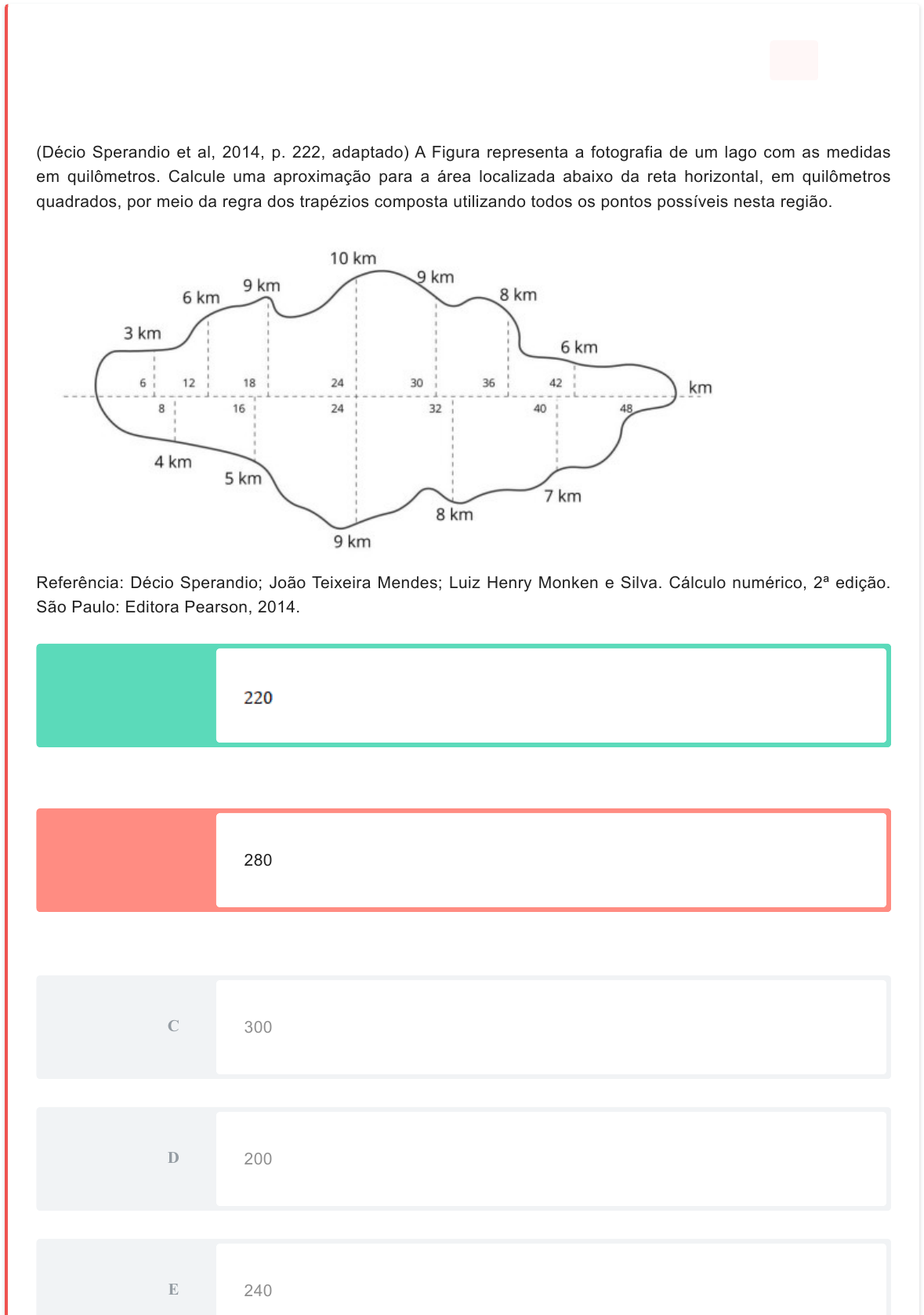 (Décio Sperandio et al, 2014, p. 222, adaptado) A Figura representa a fotografia de um lago com as medidas em quilômetros. Calcule uma aproximação para a área localizada abaixo da reta horizontal, em quilômetros quadrados, por meio da regra dos trapézios composta utilizando todos os pontos possíveis nesta região. Referência: Décio Sperandio; João Teixeira Mendes; Luiz Henry Monken e Silva. Cálculo numérico, 2ª edição. São Paulo: Editora Pearson, 2014. A Resposta correta B 280 Resposta do aluno Questão 1: (Décio Sperandio et al, 2014, p. 222, adaptado) A Figura representa a ... Questão objetiva 0 /1 C 300 D 200 E 240 (Franco, 2013, adaptado) Sem utilizar a fórmula do erro de truncamento, aproxime pela regra dos trapézios composta, com 6 pontos distintos, o comprimento de arco da curva de a . Lembre-se que o comprimento de arco de uma curva genérica do ponto ao ponto é dada por Referência: Franco, Neide Maria Bertoldi. Cálculo Numérico. São Paulo: Editora Pearson, 2013, p. 366. A 11,05 Resposta correta Questão 2: (Franco, 2013, adaptado) Sem utilizar a fórmula do erro de truncamento, ... Questão objetiva 1 /1 B 12,48 C 11,89 D 10,98 E 12,63 Quando desejamos saber a precisão que estamos trabalhando com a regra dos trapézios composta, podemos utilizar a expressão para o erro de truncamento. Em vista disso, determine uma cota para o erro máximo de Questão 3: Quando desejamos saber a precisão que estamos trabalhando com a regra dos ... Questão objetiva 0 /1 truncamento cometido no cálculo da integral , quando utilizamos a regra dos trapézios composta com 7 pontos distintos. A Resposta correta B Resposta do aluno C D E A velocidade instantânea de uma motocicleta foi medida em vários momentos e registrada numa tabela como segue abaixo: t (segundos) v (km/h) 0 20 120 22 240 23 360 25 480 30 600 31 Questão 4: A velocidade instantânea de uma motocicleta foi medida em vários momentos e ... Questão objetiva 1 /1 720 32 840 40 960 45 1080 50 1200 65 Referência: Elaborado pelo autor. Uma vez que o motociclista não anotou a quilometragem da motocicleta e deseja calcular uma aproximação da distância percorrida, em metros, determine essa aproximação usando a regra dos trapézios composta sobre todos os pontos dados na tabela. A 11350 Resposta correta B 12480 C 10080 D 9872 E 8745 Questão 5: Franco (2013) a seção reta de um veleiro está mostrada na Figura abaixo:Fonte... Questão objetiva 0 /1 Franco (2013) a seção reta de um veleiro está mostrada na Figura abaixo: Fonte: Franco, Neide Maria Bertoldi. Cálculo Numérico. São Paulo: Editora Pearson, 2013, p. 376. A força que o vento exerce sobre o mastro (devido às velas) varia conforme a altura (em metros) a partir do convés. Medidas experimentais constataram que a força resultante exercida sobre o mastro (em ) é dada pela equação: , Usando a regra dos trapézios composta, com 8 trapézios, desconsiderando a fórmula do erro de truncamento, calcule essa força resultante. Referência: Franco, Neide Maria Bertoldi. Cálculo Numérico. São Paulo: Editora Pearson, 2013. A 1,67 kN Resposta correta C 1,69 kN Resposta do aluno B 1,71 kN D 1,85 kN E 1,77 kN Para Franco (2013) a determinação da área da seção reta de rios e lagos é importante em projetos de prevenção de enchentes (para o cálculo de vazão da água) e nos projetos de reservatórios (para o cálculo do volume total de água). A menos que dispositivos tipo sonar sejam usados na obtenção do perfil do fundo de rios/lagos, o engenheiro deve trabalhar com valores da profundidade, obtidos em pontos discretos da superfície. Um exemplo típico da seção reta de um rio é mostrado na Figura abaixo: Referência: Franco, Neide Maria Bertoldi. Cálculo Numérico. São Paulo: Editora Pearson, 2013. Use a fórmula dos trapézios composta sobre os respectivos pontos igualmente espaçados para calcular a área da região da seção reta do rio compreendida entre 0 e 10 metros de distância da margem esquerda desse rio. A 29,6 metros quadrados Resposta correta Questão 6: Para Franco (2013) a determinação da área da seção reta de rios e lagos é ... Questão objetiva 0 /1 B 30,2 metros quadrados E 26,4 metros quadrados Resposta do aluno C 28,5 metros quadrados D 27,8 metros quadrados Franco (2013) A determinação da área da seção reta de rios e lagos é importante em projetos de prevenção de enchentes (para o cálculo de vazão da água) e nos projetos de reservatórios (para o cálculo do volume total de água). A menos que dispositivos tipo sonar sejam usados na obtenção do perfil do fundo de rios/lagos, o engenheiro deve trabalhar com valores da profundidade, obtidos em pontos discretos da superfície. Um exemplo típico da seção reta de um rio é mostrado na Figura abaixo: Referência: Franco, Neide Maria Bertoldi. Cálculo Numérico. São Paulo: Editora Pearson, 2013, p. 371. Use a fórmula dos trapézios composta sobre os respectivos pontos igualmente espaçados para calcular a área da região da seção reta do rio compreendida entre 10 e 20 metros de distância da margem esquerda desse rio. A 33,6 metros quadrados Questão 7: Franco (2013) A determinação da área da seção reta de rios e lagos é ... Questão objetiva 0 /1 Resposta correta E 34,9 metros quadrados Resposta do aluno B 30,5 metros quadrados C 31,4 metros quadrados D 29,8 metros quadrados Para Barroso (1987) uma linha reta foi traçada de modo a tangenciar as margens de um rio nos pontos A e B. Para medir a área de um trecho entre o rio e a reta AB foram traçadas perpendiculares em relação a AB com um intervalo de 0,06 m. Usando os dados tabelados e a regra dos trapézios simples, calcule uma aproximação para a área da região compreendida entre as perpendiculares 6 e 7. Perpendiculares Comprimento (metros) 1 3,45 2 4,68 3 4,79 4 5,13 5 5,68 6 5,97 7 6,85 8 5,71 9 5,34 10 4,97 Questão 8: Para Barroso (1987) uma linha reta foi traçada de 