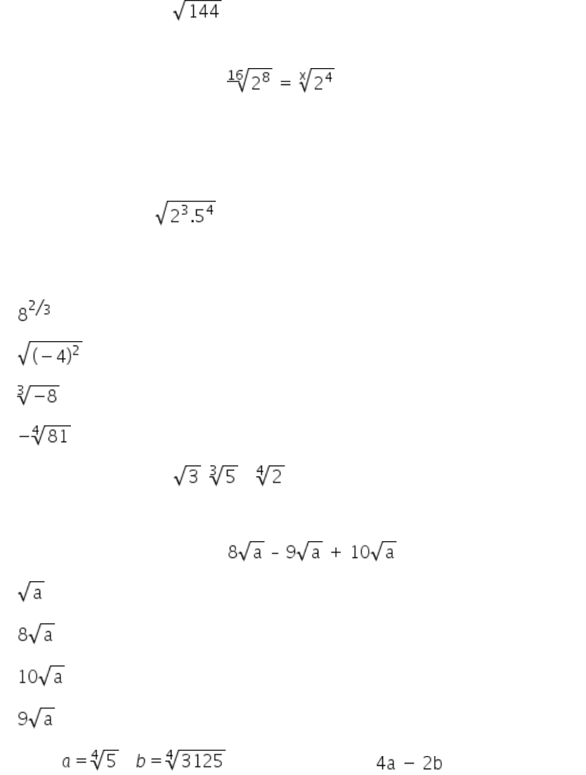 Exercícios Radiciação 1 Fatore o radicando de e encontre o resultado da raiz. 2 Qual o valor de x na igualdade ? a) 4 b) 6 c) 8 d) 12 3 Simplifique o radical . 4 Sabendo que todas as expressões são definidas no conjunto dos números reais, determine o resultado para: a) b) c) d) 5 Reescreva os radicais ; e de forma que os três apresentem o mesmo índice. 6 Qual o resultado da expressão ? a) b) c) d) 7 Sendo e determine o valor de . 8 (CEFET/RJ - 2014) Por qual número devemos multiplicar o número 0,75 de modo que a raiz quadrada do produto obtido seja igual a 45? a) 2700 b) 2800 c) 2900 d) 3000 9 A raiz quadrada de 72 está entre: A) 4 e 5 B) 5 e 6 C) 6 e 7 D) 7 e 8 E) 8 e 9 10 A área de um quadrado é igual à multiplicação dos seus lados, ou seja, A = l². Se determinado quadrado possui área igual a 30 cm², então, utilizando aproximação de duas casas decimais, o valor da medida do lado desse quadrado é igual a: A) 5,46 B) 5,48 C) 5,49 D) 5,51 E) 5,53 11 O valor que mais se aproxima da expressão 82−62−−−−−−√82−62 é: A) 5,1 B) 5,2 C) 5,3 D) 5,4 E) 5,5 12 O número 6,48 é a aproximação por falta da raiz quadrada de: A) 40 B) 41 C) 42 D) 43 E) 44 13 Utilizando aproximação com uma casa decimal, encontre o valor da expressão: 2–√+3–√−7–√2+3−7 A) 0,5 B) 0,4 C) 0,3 D) 0,2 14 Faça as potências de até 15 Descubra o resultado das raízes e o motivo. a) b) c) d) e) f) g) h) i) j) k) l) m) n) o) p) q) r) s) t) u) v) a a image6.png image7.png image8.png image9.png image10.png image11.png image12.png image13.png image14.png image15.png image16.png image17.png image18.png image1.png image2.png image3.png image4.png image5.png