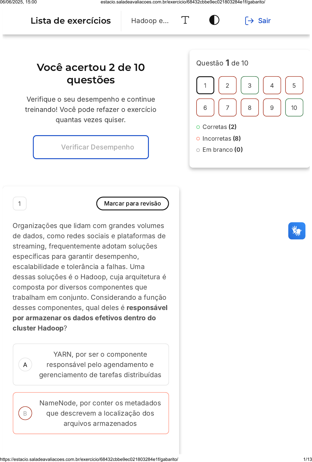 Você acertou 2 de 10 questões Verifique o seu desempenho e continue treinando! Você pode refazer o exercício quantas vezes quiser. Verificar Desempenho A B 1 Marcar para revisão Organizações que lidam com grandes volumes de dados, como redes sociais e plataformas de streaming, frequentemente adotam soluções específicas para garantir desempenho, escalabilidade e tolerância a falhas. Uma dessas soluções é o Hadoop, cuja arquitetura é composta por diversos componentes que trabalham em conjunto. Considerando a função desses componentes, qual deles é responsável por armazenar os dados efetivos dentro do cluster Hadoop? YARN, por ser o componente responsável pelo agendamento e gerenciamento de tarefas distribuídas NameNode, por conter os metadados que descrevem a localização dos arquivos armazenados Questão 1 de 10 Corretas (2) Incorretas (8) Em branco (0) 1 2 3 4 5 6 7 8 9 10 Lista de exercícios Hadoop e… Sair 06/06/2025, 15:00 estacio.saladeavaliacoes.com.br/exercicio/68432cbbe9ec021803284e1f/gabarito/ https://estacio.saladeavaliacoes.com.br/exercicio/68432cbbe9ec021803284e1f/gabarito/ 1/13 C D E MapReduce, por possibilitar a divisão das tarefas em pares chave-valor para processamento paralelo DataNode, por ser o responsável direto pelo armazenamento físico dos dados no cluster Hadoop Common, por fornecer bibliotecas e scripts necessários à execução dos demais componentes Resposta incorreta Opa! A alternativa correta é a letra D. Confira o gabarito comentado! Gabarito Comentado O DataNode é o componente da arquitetura Hadoop responsável por armazenar os dados reais em cada nó do cluster. Ele atua como "escravo" na estrutura mestre- escravo, sendo coordenado pelo NameNode, que apenas gerencia metadados. Enquanto outros componentes como YARN e MapReduce se concentram em processamento e gerenciamento, o DataNode se encarrega do armazenamento em si. 2 Marcar para revisão A respeito do Hadoop, selecione a opção correta com o componente que faz o rastreamento de tarefas. 06/06/2025, 15:00 estacio.saladeavaliacoes.com.br/exercicio/68432cbbe9ec021803284e1f/gabarito/ https://estacio.saladeavaliacoes.com.br/exercicio/68432cbbe9ec021803284e1f/gabarito/ 2/13 A B C D E MapReduce HDFS Task manager Camada de ingestão Mrjob Resposta incorreta Opa! A alternativa correta é a letra A. Confira o gabarito comentado! Gabarito Comentado O MapReduce é o componente do Hadoop responsável pelo rastreamento de tarefas. Ele opera por meio de dois tipos de rastreadores: os Task Trackers, que rastreiam tarefas individuais, e os Job Trackers, que rastreiam trabalhos completos. Este mecanismo permite a distribuição eficiente de tarefas em um cluster. As demais alternativas, HDFS, Task manager, Camada de ingestão e Mrjob, embora estejam relacionadas ao Hadoop, não possuem a funcionalidade específica de rastreamento de tarefas. 3 Marcar para revisão 06/06/2025, 15:00 estacio.saladeavaliacoes.com.br/exercicio/68432cbbe9ec021803284e1f/gabarito/ https://estacio.saladeavaliacoes.com.br/exercicio/68432cbbe9ec021803284e1f/gabarito/ 3/13 A B C D E A arquitetura do Hadoop é projetada para garantir alto desempenho na manipulação de grandes volumes de dados distribuídos. Um de seus principais diferenciais é a capacidade de dividir tarefas entre diversos nós do cluster. Qual componente da arquitetura Hadoop é responsável por gerenciar os recursos computacionais disponíveis e monitorar o uso de CPU, memória e disco em cada máquina do cluster? NameNode NodeManager DataNode TaskTracker Mapper Resposta correta Parabéns, você selecionou a alternativa correta. Confira o gabarito comentado! Gabarito Comentado O NodeManager atua como o agente em cada máquina (nó) do cluster, sendo responsável por monitorar os recursos locais e repassar essas informações ao ResourceManager, parte integrante do YARN. Ele assegura que os containers sejam gerenciados com base na 06/06/2025, 15:00 estacio.saladeavaliacoes.com.br/exercicio/68432cbbe9ec021803284e1f/gabarito/ https://estacio.saladeavaliacoes.com.br/exercicio/68432cbbe9ec021803284e1f/gabarito/ 4/13 A B C D E capacidade da máquina, otimizando a alocação de tarefas. 4 Marcar para revisão Durante a execução de aplicações com Hadoop, a fase de redução desempenha papel fundamental no processamento final dos dados. Essa etapa é precedida por um processo que organiza e redistribui os pares chave-valor gerados pelas tarefas de mapeamento, otimizando a carga de trabalho entre os nós. Qual é o nome desse processo e qual é sua principal contribuição? Combinação – reduz a quantidade de tarefas no redutor ao eliminar duplicatas Classificação – organiza os dados em ordem alfabética antes da gravação final Embaralhamento – redistribui os dados intermediários para os redutores corretos Particionamento – divide os dados em grupos com base em similaridade semântica Agendamento – determina quais tarefas devem ser executadas com prioridade 06/06/2025, 15:00 estacio.saladeavaliacoes.com.br/exercicio/68432cbbe9ec021803284e1f/gabarito/ https://estacio.saladeavaliacoes.com.br/exercicio/68432cbbe9ec021803284e1f/gabarito/ 5/13 A B C Resposta incorreta Opa! A alternativa correta é a letra C. Confira o gabarito comentado! Gabarito Comentado O embaralhamento (ou shuffle) é o processo em que os pares chave-valor intermediários, gerados pelos mapeadores, são redistribuídos entre os redutores conforme a chave. Essa etapa garante que todos os valores de uma mesma chave sejam processados juntos, permitindo uma redução eficaz e consistente dos dados. 5 Marcar para revisão Reconhecer os conceitos de Data Lake é fundamental para o profissional de Tecnologia da Informação. Selecione a opção correta a respeito do Data Lake. Possui alta latência para acesso dos dados. Aplica processos de tratamento nos dados. Armazena os dados de modo eficiente. 06/06/2025, 15:00 estacio.saladeavaliacoes.com.br/exercicio/68432cbbe9ec021803284e