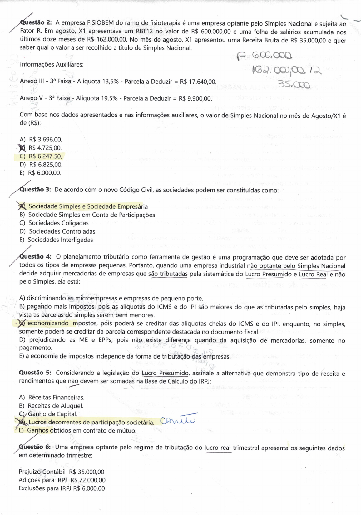 Questão 2: A empresa FISIOBEM do ramo de fisioterapia é uma empresa optante pelo Simples Nacional e sujeita ao Fator R. Em agosto, X1 apresentava um RBT12 no valor de R$ 600.000,00 e uma folha de salários acumulada nos últimos doze meses de No mês de agosto, X1 apresentou uma Receita Bruta de R$ 35.000,00 e quer saber qual o valor a ser recolhido a título de Simples Nacional. F 600,000 Informações Auxiliares: Anexo III Faixa Alíquota 13,5% Parcela a Deduzir = R$ 17.640,00. 35,000 Anexo V Faixa Alíquota 19,5% Parcela a Deduzir = R$ 9.900,00. Com base nos dados apresentados e nas informações auxiliares, o valor de Simples Nacional no mês de Agosto/X1 é de (R$): A) R$ 4.725,00. C) D) R$ 6.825,00. E) R$ 6.000,00. Questão 3: De acordo com o novo Código Civil, as sociedades podem ser constituídas como: Sociedade Simples e Sociedade Empresária B) Sociedade Simples em Conta de Participações C) Sociedades Coligadas D) Sociedades Controladas E) Sociedades Interligadas Questão 4: planejamento tributário como ferramenta de gestão é uma programação que deve ser adotada por todos os tipos de empresas pequenas. Portanto, quando uma empresa industrial não optante pelo Simples Nacional decide adquirir mercadorias de empresas que são tributadas pela sistemática do Lucro Presumido e Lucro Real e não pelo Simples, ela está: A) discriminando as microempresas e empresas de pequeno porte. B) pagando mais impostos, pois as alíquotas do ICMS e do IPI são maiores do que as tributadas pelo simples, haja vista as parcelas do simples serem bem menores. economizando impostos, pois poderá se creditar das alíquotas cheias do ICMS e do IPI, enquanto, no simples, somente poderá se creditar da parcela correspondente destacada no documento fiscal. D) prejudicando as ME e EPPs, pois não existe diferença quando da aquisição de mercadorias, somente no pagamento. E) a economia de impostos independe da forma de tributação das empresas. Questão 5: Considerando a legislação do Lucro Presumido, assinale a alternativa que demonstra tipo de receita e rendimentos que não devem ser somadas na Base de Cálculo do IRPJ: A) Receitas Financeiras. B) Receitas de Aluguel. C) Ganho de Capital. Lucros decorrentes de participação societária. E) Ganhos obtidos em contrato de Questão 6: Uma empresa optante pelo regime de tributação do lucro real trimestral apresenta os seguintes dados em determinado trimestre: Prejuízo Contábil R$ 35.000,00 Adições para IRPJ R$ 72.000,00 Exclusões para IRPJ R$ 6.000,00