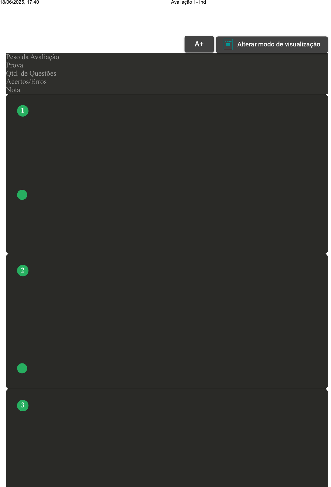Prova Impressa GABARITO | Avaliação I - Individual (Cod.:884370) Peso da Avaliação 1,50 Prova 71420358 Qtd. de Questões 10 Acertos/Erros 10/0 Nota 10,00 O autor Ubiratan D'Ambrosio nos traz alguns objetivos sobre a importância de estudar a história da matemática na sala de aula. Sobre esses objetivos, analise as sentenças a seguir: I- Situá-la como manifestação cultural dos povos em diversos tempos. II- Entender que a Matemática não fez parte da nossa cultura. III- Quando o aluno estuda um sistema de numeração antigo, é para entender a ideia de número. IV- Alguns dos sistemas de numeração antigos poderão substituir o nosso sistema de numeração.Assinale a alternativa CORRETA: A As sentenças II e III estão corretas. B As sentenças I e III estão corretas. C As sentenças III e IV estão corretas. D As sentenças I e IV estão corretas. Os maias e os mesopotâmicos não foram civilizações contemporâneas e também suas posições geográficas não eram próximas. Mesmo assim, possuíam algumas características bastante importantes das quais compartilhavam. As semelhanças entre os sistemas numéricos utilizados pelos maias e mesopotâmicos estão em: A Utilizarem e zero e terem base vigesimal. B Possuírem grafias semelhantes e terem base decimal. C Terem base sexagesimal e serem posicionais. D Serem posicionais e utilizarem o zero. Na Roma Antiga, utilizava-se um processo de escrita que derivava de um processo bastante rudimentar, o entalhe. Este processo é conhecido como os "algarismos romanos". Com relação a este processo de escrita numérica, analise as afirmativas a seguir: I- Sua utilização é importante no campo de estudo da História. II- A principal influência para seu desenvolvimento foi a grafia etrusca. III- Para escrever um número romano, utiliza-se o processo multiplicativo com seus algarismos. Agora, assinale a alternativa CORRETA: VOLTAR A+ Alterar modo de visualização 1 2 3 18/06/2025, 17:40 Avaliação I - Individual about:blank 1/5 A As afirmativas I e III estão corretas. B Somente a afirmativa I está correta. C As afirmativas I e II estão corretas. D As afirmativas II e III estão corretas. Atualmente utilizamos em nosso dia a dia a base numérica conhecida como base decimal. Ela é chamada decimal porque é composta por 10 algarismos que vão de 0 a 9, porém não existe apenas essa base numérica no mundo. Existem outras, por exemplo, a base binária, a base octal e a base hexadecimal, todas com suas características e nenhuma menos importante do que a outra. A base binária ou base 2 como também é conhecida, é chamada assim por constituir todas as quantidades desejadas com apenas 2 algarismos: 0 e 1. Esta base é amplamente utilizada em sistemas que utilizam da lógica Booleana, por exemplo, o seu computador. Sobre o exposto, classifique V para as sentenças verdadeiras e F para as falsas: ( ) O número 107 na base decimal equivale ao número 101011 na base binária. ( ) Ao transformar um número decimal em número binário, dividimos o número decimal a ser convertido por 2. ( ) No sistema binário são necessários muito mais algarismos para representar um número do que no sistema decimal. Assinale a alternativa que apresenta a sequência CORRETA: FONTE: CAVALCANTI, Romirys. O que são números binários? Disponível em: https://www.vivendoentresimbolos.com/2013/06/o-que-sao-numeros-binarios.html. Acesso em: 9 out. 2018. A V - F - V. B V - F - F. C F - V - V. D V - V - F. O zero é um número e um algarismo usado para representar número nulo no sistema de numeração. Desempenha um papel central na matemática como a identidade aditiva dos números inteiros, dos números reais e de muitas outras estruturas algébricas. Qual civilização foi a inventora desse número? A Civilização Maia. B Civilização Babilônica. C Civilização Chinesa. 4 5 18/06/2025, 17:40 Avaliação I - Individual about:blank 2/5 D Civilização Hindu. No que concerne à história dos números na sala de aula, temos várias questões associadas.Sobre esse tema, assinale a alternativa CORRETA: A Facilita o processo de aprendizagem do sistema numérico atual. B Desconsidera a matemática como sendo elemento pertencente à cultura dos povos. C Dificulta o processo de ensino e aprendizagem. D É desnecessária, pois não tem aplicabilidade funcional para os estudantes. No que concerne à álgebra booleana, temos várias questões associadas. Sobre esse tema, analise as sentenças a seguir: I- Tinha seus cálculos facilitados pelos números binários. II- Está presente em todos os computadores. III- Sempre foi baseada em símbolos como 1 e 0.Assinale a alternativa CORRETA: A Somente a sentença II está correta. B Somente a sentença III está correta. C Somente a sentença I está correta. D As sentenças I, II e III estão corretas. Após o desenvolvimentos dos primeiros e mais rudimentares processos de escrita pelas tribos nativas de várias localidades, as civilizações subsequentes passaram a implementar as formas de comunicação numérica com esquemas de escrita mais sofisticados. Dentre os processos de escrita das civilizações antigas, classifique V para as sentenças verdadeiras e F para as falsas: ( ) O sistema de numeração Maia seguia a base vigesimal. ( ) Uma das diferenças entre os sistemas Maia e Indo-Arábico era a disposição (vertical ou horizontal) da escrita. ( ) O sistema Mesopotâmico era baseado na escrita etrusca. ( ) O sistema de escrita numérica Indo-Arábica não contemplava o zero. Assinale a alternativa que apresenta a sequência CORRETA: A V - F - F - V. B V - F - V - F. C F - V - V - F. D V - V - F - F. 6 7 8 18/06/2025, 17:40 Avaliação I - Individual about:blank 3/5 Os sistemas de numeração posicionais são um modo de representação numérica na qual o valor de cada algarismo depende da sua posição relativa na composição do número. O valor do número é a soma de cada algarismo que o compõe, consider