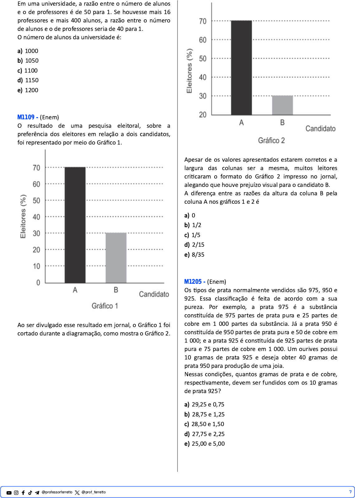 Em uma universidade, a razão entre o número de alunos e o de professores é de 50 para 1. Se houvesse mais 16 professores e mais 400 alunos, a razão entre o número de alunos e o de professores seria de 40 para 1. O número de alunos da universidade é: a) 1000 b) 1050 c) 1100 d) 1150 e) 1200 M1109 - (Enem) O resultado de uma pesquisa eleitoral, sobre a preferência dos eleitores em relação a dois candidatos, foi representado por meio do Gráfico 1. Ao ser divulgado esse resultado em jornal, o Gráfico 1 foi cortado durante a diagramação, como mostra o Gráfico 2. Apesar de os valores apresentados estarem corretos e a largura das colunas ser a mesma, muitos leitores criticaram o formato do Gráfico 2 impresso no jornal, alegando que houve prejuízo visual para o candidato B. A diferença entre as razões da altura da coluna B pela coluna A nos gráficos 1 e 2 é a) 0 b) 1/2 c) 1/5 d) 2/15 e) 8/35 M1205 - (Enem) Os tipos de prata normalmente vendidos são 975, 950 e 925. Essa classificação é feita de acordo com a sua pureza. Por exemplo, a prata 975 é a substância constituída de 975 partes de prata pura e 25 partes de cobre em 1 000 partes da substância. Já a prata 950 é constituída de 950 partes de prata pura e 50 de cobre em 1 000; e a prata 925 é constituída de 925 partes de prata pura e 75 partes de cobre em 1 000. Um ourives possui 10 gramas de prata 925 e deseja obter 40 gramas de prata 950 para produção de uma joia. Nessas condições, quantos gramas de prata e de cobre, respectivamente, devem ser fundidos com os 10 gramas de prata 925? a) 29,25 e 0,75 b) 28,75 e 1,25 c) 28,50 e 1,50 d) 27,75 e 2,25 e) 25,00 e 5,00 7@professorferretto @prof_ferretto M0654 - (Professor Ferretto) Em um concurso, 5/8 dos candidatos foram aprovados para a segunda fase. Entre esses candidatos, 2/5 são mulheres. Se o número de candidatos do sexo masculino, aprovados para a segunda fase, é igual a 12.000, o número total de candidatos do concurso é igual a: a) 34000 b) 32000 c) 30000 d) 28000 e) 26000 M1943 - (Enem PPL) O presidente de uma empresa, com o objetivo de renovar sua frota de automóveis, solicitou uma pesquisa medindo o consumo de combustível de 5 modelos de carro que usam o mesmo tipo de combustível. O resultado foi: - Carro I: deslocamento de 195 km consumindo 20 litros de combustível; - Carro II: deslocamento de 96 km consumindo 12 litros de combustível; - Carro III: deslocamento de 145 km consumindo 16 litros de combustível; - Carro IV: deslocamento de 225 km consumindo 24 litros de combustível; - Carro V: deslocamento de 65 km consumindo 8 litros de combustível. Para renovar a frota com o modelo mais econômico, em relação à razão quilômetro rodado por litro, devem ser comprados carros do modelo a) I b) II c) III d) IV e) V M0149 - (Enem) Luíza decidiu pintar seus cabelos e os de sua mãe usando as cores B e C em ambas as tinturas. A cor B é a que tinge os cabelos brancos e a cor C dá um tom mais claro durante a exposição à luz. Luíza sabe que, em cabelos com muitos fios brancos, como os de sua mãe, a proporção entre as cores C e B é de 1 para 3. Para ela, que tem poucos fios brancos, a proporção a ser aplicada é de 3 partes da cor C para 1 parte da cor B. Além disso, como sua mãe tem cabelos curtos, basta a aplicação de 60 gramas de tintura; já para seus longos cabelos, serão necessários 120 gramas. De acordo com a situação descrita, a quantidade, em gramas, da tintura da cor B que Luíza deve adquirir para pintar os seus cabelos e os de sua mãe é a) 60. b) 75. c) 90. d) 105. e) 180. M0181 - (Unicamp) A tabela abaixo informa alguns valores nutricionais para a mesma quantidade de dois alimentos, A e B. Considere duas porções isocalóricas (de mesmo valor energético) dos alimentos A e B. A razão entre a quantidade de proteína em A e a quantidade de proteína em B é igual a a) 4 b) 6 c) 8 d) 10 M0169 - (Uftm) Como combustível, o etanol de cana-de-açúcar e o etanol de milho têm qualidades iguais. O grande diferencial entre eles é a produtividade. Sabe-se que 1 hectare de cana-de-açúcar produz 7 500 litros de etanol, enquanto 1 hectare de milho produz apenas 3 000 litros. Uma região específica da usina tem x hectares plantados, divididos entre cana e milho, de forma diretamente proporcional à produtividade de cada cultura. Considerando que 1 ha = 10 000 m2 e que ao plantio do milho couberam 400 hectares, a área total, em m², dessa região específica pode ser corretamente expressa por a) 1,2 x 106. b) 1,3 x 106. c) 1,4 x 107. d) 1,4 x 108. e) 1,6 x 108. M1698 - (Enem) 8@professorferretto @prof_ferretto Definem-se o dia e o ano de um planeta de um sistema solar como sendo, respectivamente, o tempo que o planeta leva para dar 1 volta completa em torno de seu próprio eixo de rotação e o tempo para dar 1 volta completa em tomo de seu Sol. Suponha que exista um planeta Z, em algum sistema solar, onde um dia corresponda a 73 dias terrestres e que 2 de seus anos correspondam a 1 ano terrestre. Considere que 1 ano terrestre tem 365 de seus dias. No planeta Z, seu ano corresponderia a quantos de seus dias? a) 2,5 b) 10,0 c) 730,0 d) 13.322,5 e) 53.290,0 M1953 - (Enem PPL) Em um jogo de tabuleiro, a pontuação é marcada com fichas coloridas. Cada ficha vermelha vale um ponto. Três fichas vermelhas podem ser trocadas por uma azul, três fichas azuis podem ser trocadas por uma branca, e três fichas brancas podem ser trocadas por uma verde. Ao final do jogo, os jogadores A, B e C terminaram, cada um, com as quantidades de fichas, conforme a tabela seguinte: De acordo com essa tabela, as classificações em primeiro, segundo e terceiro lugares ficaram, respectivamente, para os jogadores a) A, B e C. b) B, A e C. c) C, B e A. d) B, C e A. e) C, A e B. M0720 - (Professor Ferretto) Daniel e Roberta desejam viajar e foram a uma casa de câmbio. Foram informados que com os 3.060 reais de que dispunha, Daniel poderia comprar 1