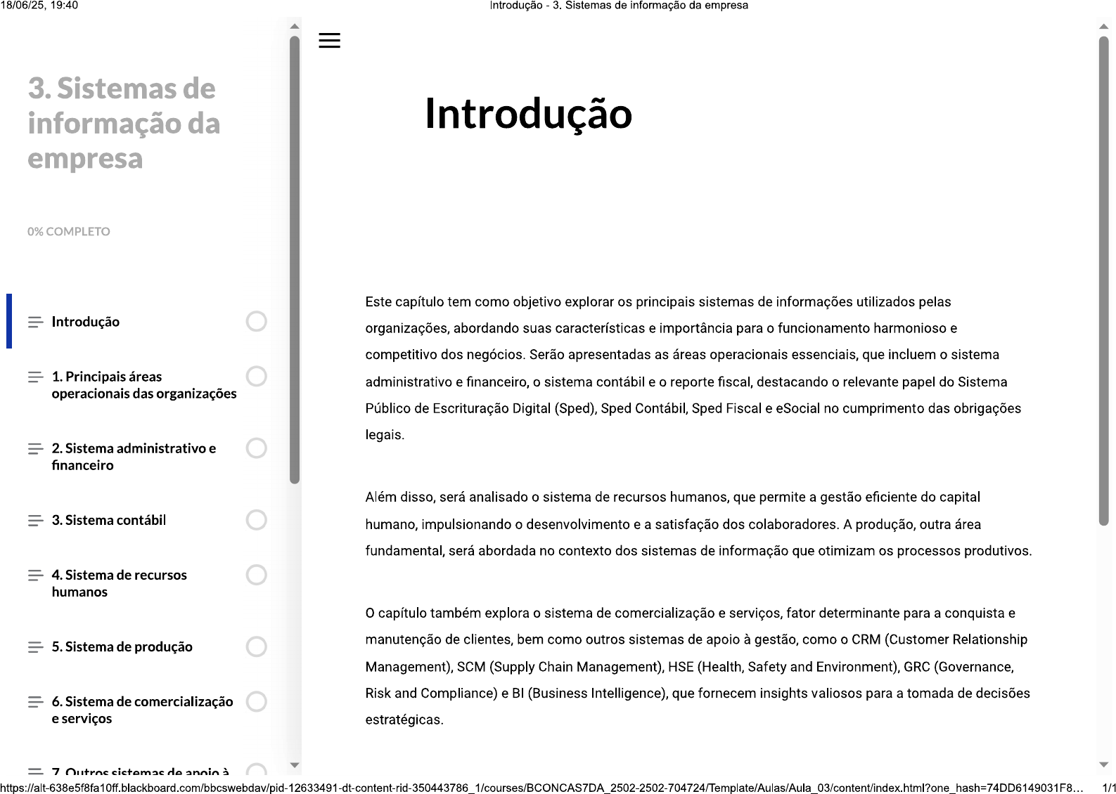 18/06/25, 19:40 Introdução - 3. Sistemas de informação da empresa 3. Sistemas de informação da Introdução empresa 0% COMPLETO Este capítulo tem como objetivo explorar os principais sistemas de informações utilizados pelas Introdução organizações, abordando suas características e importância para o funcionamento harmonioso e competitivo dos negócios. Serão apresentadas as áreas operacionais essenciais, que incluem o sistema 1. Principais áreas administrativo e financeiro, o sistema contábil e o reporte fiscal, destacando o relevante papel do Sistema operacionais das organizações Público de Escrituração Digital (Sped), Sped Contábil, Sped Fiscal e eSocial no cumprimento das obrigações legais. 2. Sistema administrativo e financeiro Além disso, será analisado o sistema de recursos humanos, que permite a gestão eficiente do capital 3. Sistema contábil humano, impulsionando o desenvolvimento e a satisfação dos colaboradores. A produção, outra área fundamental, será abordada no contexto dos sistemas de informação que otimizam os processos produtivos. 4. Sistema de recursos humanos capítulo também explora o sistema de comercialização e serviços, fator determinante para a conquista e 5. Sistema de produção manutenção de clientes, bem como outros sistemas de apoio à gestão, como o CRM (Customer Relationship Management), SCM (Supply Chain Management), HSE (Health, Safety and Environment), GRC (Governance, Risk and Compliance) e BI (Business Intelligence), que fornecem insights valiosos para a tomada de decisões 6. Sistema de comercialização e serviços estratégicas. 7 Outros sistemas de à 1/1