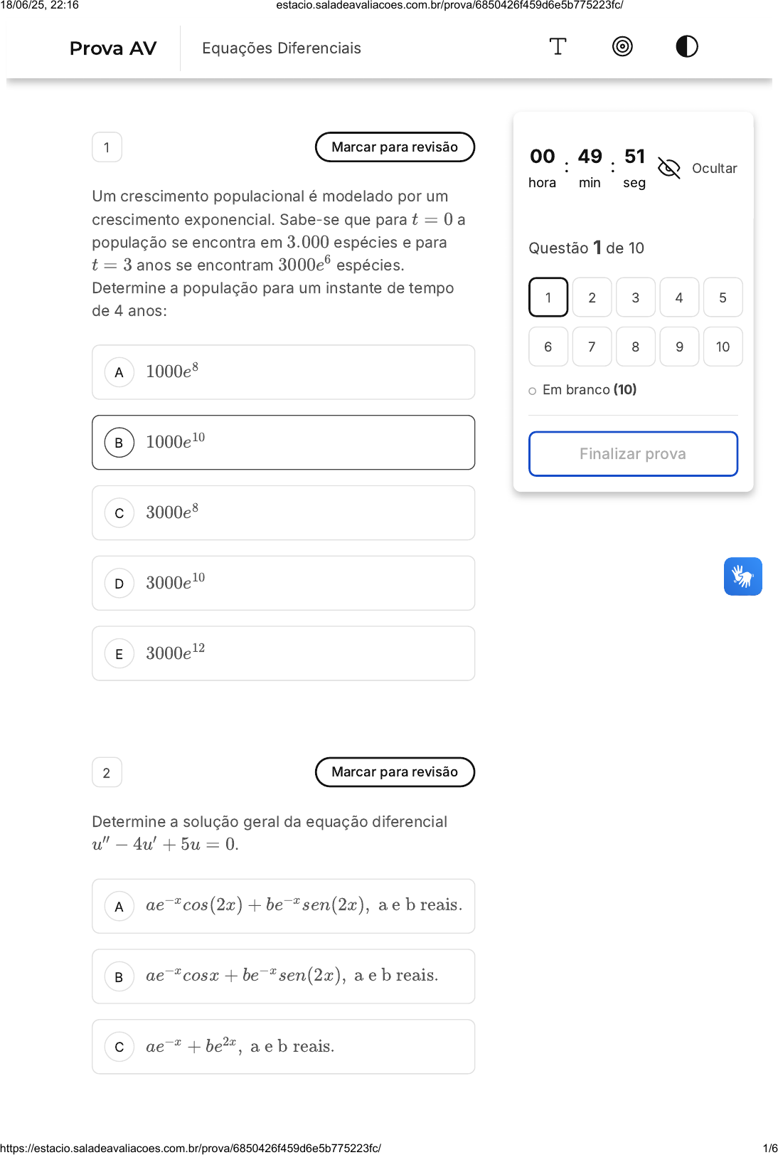 A B C D E A B C 1 Marcar para revisão Um crescimento populacional é modelado por um crescimento exponencial. Sabe-se que para a população se encontra em espécies e para anos se encontram espécies. Determine a população para um instante de tempo de 4 anos: t = 0 3.000 t = 3 3000e6 1000e8 1000e10 3000e8 3000e10 3000e12 2 Marcar para revisão Determine a solução geral da equação diferencial .u′′ − 4u′ + 5u = 0 ae−xcos(2x) + be−xsen(2x), a e b reais. ae−xcosx + be−xsen(2x), a e b reais. ae−x + be2x, a e b reais. 00 hora : 49 min : 51 seg Ocultar Questão 1 de 10 Em branco (10) Finalizar prova 1 2 3 4 5 6 7 8 9 10 Prova AV Equações Diferenciais 18/06/25, 22:16 estacio.saladeavaliacoes.com.br/prova/6850426f459d6e5b775223fc/ https://estacio.saladeavaliacoes.com.br/prova/6850426f459d6e5b775223fc/ 1/6 D E A B C D E A B C ae−x + bxe−x, a e b reais. ae2xcos(x) + be2xsen(x), a e b reais. 3 Marcar para revisão Determine o segundo termo da série numérica .sn = Σn 3 (−2)n 1 n+3 4 5 −4 − 8 5 20 21 10 4 Marcar para revisão Marque a alternativa correta relacionada à série Σn 3 1 (k+7)(k+8) É divergente. É convergente com soma 1 10 É convergente com soma 1 8 18/06/25, 22:16 estacio.saladeavaliacoes.com.br/prova/6850426f459d6e5b775223fc/ https://estacio.saladeavaliacoes.com.br/prova/6850426f459d6e5b775223fc/ 2/6 D E A B C D E A B É convergente com soma 1 9 É convergente com soma 1 11 5 Marcar para revisão Marque a alternativa que apresenta a transformada de Laplace da função t , sabendo que a transformada de Laplace da função t vale 4 7 5040 s8. 3 s4 2 s5 6 s5 24 s5 6 s4 6 Marcar para revisão Marque a alternativa que apresenta a transformada de Laplace para função f(t) = sen (kt), k real. 1 s2−k2 1 s2+k2 18/06/25, 22:16 estacio.saladeavaliacoes.com.br/prova/6850426f459d6e5b775223fc/ https://estacio.saladeavaliacoes.com.br/prova/6850426f459d6e5b775223fc/ 3/6 C D E A B C D E k s2+k2 s s2+k2 s s2−k2 7 Marcar para revisão Seja um recipiente que contém, inicialmente, 2000 l de água e 100 kg de sal. É Inserida no recipiente uma solução (água salgada) com uma concentração de 5 kg de sal por litro de água, a uma taxa fixa de 25 L/min. Esta solução é misturada completamente e tem uma saída do tanque com uma taxa de 25 L/min. Determine a quantidade de sal que permanece no recipiente após 4800s do início do processo. Entre 5000 e 6000 kg Entre 6001 e 7000 kg Entre 7001 e 8000 kg Entre 8001 e 9000 kg Entre 9001 e 10.000 kg 8 Marcar para revisão Um circuito RL é formado por um resistor de 10Ω, um indutor de 3/4H e uma fonte de tensão 9V, como mostrado na figura abaixo. Determine a expressão 18/06/25, 22:16 estacio.saladeavaliacoes.com.br/prova/6850426f459d6e5b775223fc/ https://estacio.saladeavaliacoes.com.br/prova/6850426f459d6e5b775223fc/ 4/6 A B C D E A B C que relaciona a intensidade da corrente i em qualquer instante t , se a intensidade da corrente no início for zero. Fonte: YDUQS, 2023. 9 Marcar para revisão Marque a alternativa que apresenta uma equação diferencial ordinária (EDO): (3p + 1) = 2mp ∂m ∂p − x2 = z dx dz d2x dz2 4x − 3y2 = 2 18/06/25, 22:16 estacio.saladeavaliacoes.com.br/prova/6850426f459d6e5b775223fc/ https://estacio.saladeavaliacoes.com.br/prova/6850426f459d6e5b775223fc/ 5/6 D E A B C D E s2 − st = 2 + 3∂s ∂t + = xy2∂w ∂x ∂2w ∂x∂y 10 Marcar para revisão Determine a solução da equação diferencial que atenda à condição inicial de para e para . 2s′′ − 2s′ = 2tet s = 2 t = 0 s′ = 1 t = 0 (t2 − 2t)et (t2 − t)et ( t2 − t + 2)et1 2 (t2 − t)e2t ( t2 − t + 2)e2t1 2 18/06/25, 22:16 estacio.saladeavaliacoes.com.br/prova/6850426f459d6e5b775223fc/ https://estacio.saladeavaliacoes.com.br/prova/6850426f459d6e5b775223fc/ 6/6