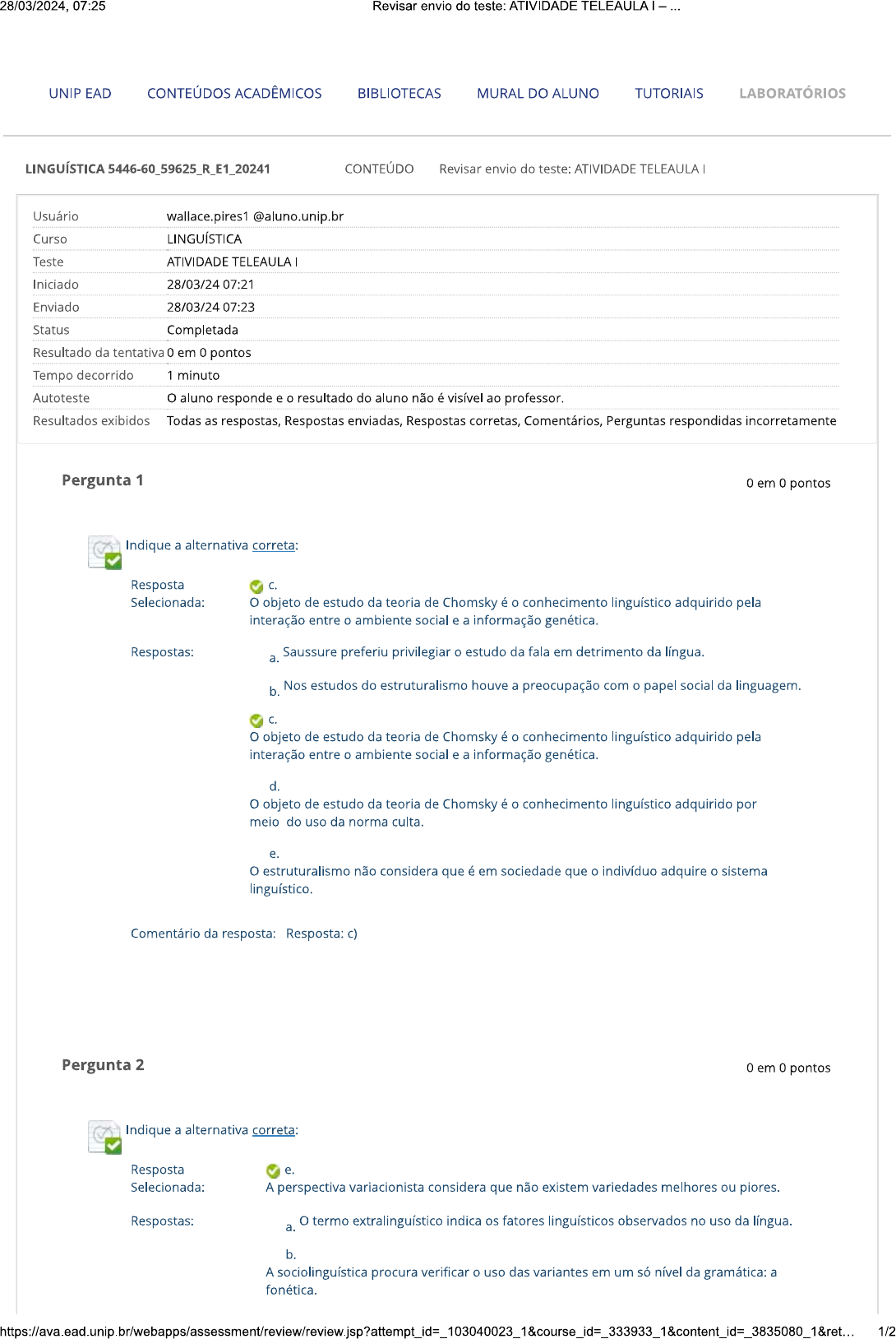 28/03/2024, 07:25 Revisar envio do teste: ATIVIDADE TELEAULA - UNIP EAD CONTEÚDOS ACADÊMICOS BIBLIOTECAS MURAL DO ALUNO TUTORIAIS LABORATÓRIOS LINGUÍSTICA CONTEÚDO Revisar envio do teste: ATIVIDADE TELEAULA Usuário wallace.pires1@aluno.unip.br Curso LINGUÍSTICA Teste ATIVIDADE TELEAULA Iniciado 28/03/24 07:21 Enviado 28/03/24 07:23 Status Completada Resultado da tentativa 0 em 0 pontos Tempo decorrido 1 minuto Autoteste aluno responde e o resultado do aluno não é visível ao professor. Resultados exibidos Todas as respostas, Respostas enviadas, Respostas corretas, Comentários, Perguntas respondidas incorretamente Pergunta 1 0 em 0 pontos Indique a alternativa correta: Resposta C. Selecionada: objeto de estudo da teoria de Chomsky é o conhecimento linguístico adquirido pela interação entre o ambiente social e a informação genética. Respostas: Saussure preferiu privilegiar o estudo da fala em detrimento da língua. a. b. Nos estudos do estruturalismo houve a preocupação com o papel social da linguagem. C. O objeto de estudo da teoria de Chomsky é o conhecimento linguístico adquirido pela interação entre o ambiente social e a informação genética. d. O objeto de estudo da teoria de Chomsky é o conhecimento linguístico adquirido por meio do uso da norma culta. e. O estruturalismo não considera que é em sociedade que o indivíduo adquire o sistema linguístico. Comentário da resposta: Resposta: c) Pergunta 2 0 em 0 pontos Indique a alternativa correta: Resposta e. Selecionada: A perspectiva variacionista considera que não existem variedades melhores ou piores. Respostas: O termo extralinguístico indica os fatores linguísticos observados no uso da língua. a. b. A sociolinguística procura verificar o uso das variantes em um só nível da gramática: a fonética.28/03/2024, 07:25 Revisar envio do teste: ATIVIDADE - C. Dentro de um país não existem povos que falem outra língua que não a oficial. d. Os sociolinguistas se interessam pela homogeneidade no uso da língua. e. A perspectiva variacionista considera que não existem variedades melhores ou piores. Comentário da resposta: Resposta: e) Pergunta 3 0 em 0 pontos Indique a definição correta para a variação diafásica: Resposta a. Selecionada: Os modos de falar podem variar segundo o contexto social em que os falantes se encontram. Respostas: a. Os modos de falar podem variar segundo o contexto social em que os falantes se encontram. b. Os modos de falar podem variar segundo a morfologia. Os modos de falar são observados apenas segundo o grau de escolaridade. C. d. Os modos de são observados apenas segundo a classe social. Os modos de falar devem ser desconsiderados. e. Comentário da resposta: Resposta: a) Pergunta 4 0 em 0 pontos Podemos afirmar que o estudo das variedades linguísticas propicia: Resposta Selecionada: d. reconhecimento de diferentes formas de uso da língua. Respostas: reconhecimento da importância dos estudos da Gramática Tradicional. a. b. reconhecimento da primazia da norma culta. reconhecimento do empobrecimento da língua pelo uso da norma popular. C. d. reconhecimento de diferentes formas de uso da língua. e. reconhecimento da importância dos estudos da gramática gerativa. Comentário da resposta: Resposta: d) Quinta-feira, 28 de Março de 2024 07h23min07s BRT OK