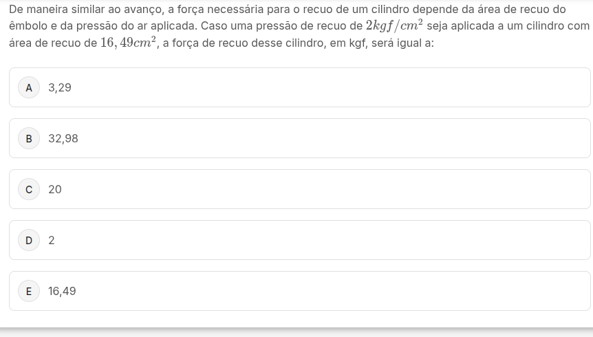 De maneira similar ao avanço, a força necessária para recuo de um cilindro depende da área de recuo do êmbolo e da pressão do an aplicada. Caso uma pressão de recuo de 2kgf/cm seja aplicada a um cilindro com área de recuo de 16, 49cm2 a força de recuo desse cilindro, em kgf, será igual a: A 3,29 B 32,98 C 20 D 2 E 16,49