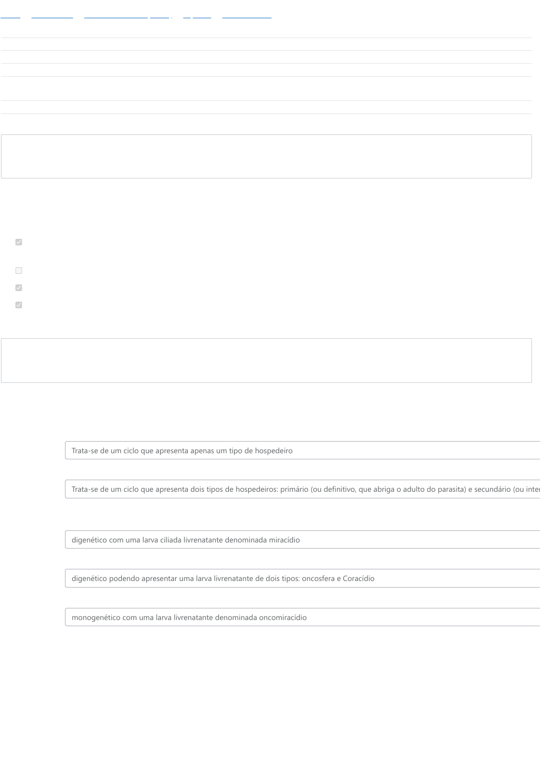 Iniciado em domingo, 8 jun. 2025, 18:29 Estado Finalizada Concluída em domingo, 8 jun. 2025, 18:47 Tempo empregado 18 minutos 8 segundos Notas 8,60/9,00 Avaliar 95,56 de um máximo de 100,00 Questão 1 Completo Atingiu 1,00 de 1,00 Questão 2 Completo Atingiu 0,60 de 1,00 Painel / Meus cursos / ECZ9103-0408171 (20251) / Tópico 7 / Questionário 7 Quanto à excreção dos Platyhelminthes, assinale as opções corretas: Escolha uma ou mais: a. Cada protonefrídio está conectado a uma rede de tubos que drena a água bombeada, desembocando em um ou mais nefridióporos (ou poros excretores) b. É realizada por Metanefrídios, que filtram o sangue c. É realizada por Protonefrídios, composto por células-flama d. O protonefrídio tem função primária de osmorregulação, mas também realiza a excreção. Os Platyhelminthes Neodermata são principalmente ecto e endosimbiontes sendo o parasitismo um caráter marcante que influencia seus ciclos de vida. Relacione corretamente as colunas em relação aos ciclos vitais dos Neodermata. Ciclo vital monogenético. A classe Cestoda se caracteriza por um ciclo vital A classe Trematoda se caracteriza por um ciclo vital Ciclo vital digenético. A classe Monogenea se caracteriza por um ciclo vital Trata-se de um ciclo que apresenta apenas um tipo de hospedeiro Trata-se de um ciclo que apresenta dois tipos de hospedeiros: primário (ou definitivo, que abriga o adulto do parasita) e secundário (ou inter digenético com uma larva ciliada livrenatante denominada miracídio digenético podendo apresentar uma larva livrenatante de dois tipos: oncosfera e Coracídio monogenético com uma larva livrenatante denominada oncomiracídio 08/06/2025, 18:49 Questionário 7: Revisão da tentativa | Moodle UFSC - EaD https://ead.moodle.ufsc.br/mod/quiz/review.php?attempt=19622&cmid=6415 1/3 https://ead.moodle.ufsc.br/my/ https://ead.moodle.ufsc.br/my/courses.php https://ead.moodle.ufsc.br/course/view.php?id=301 https://ead.moodle.ufsc.br/course/view.php?id=301#section-10 https://ead.moodle.ufsc.br/mod/quiz/view.php?id=6415 Questão 3 Completo Atingiu 1,00 de 1,00 Questão 4 Completo Atingiu 2,00 de 2,00 Questão 5 Completo Atingiu 2,00 de 2,00 A sistemática de platelmintos é controversa mas alguns caracteres diagnósticos podem definir suas classes. Relacione as colunas corretamente. Neodermata com escólex. O tegumento apresenta microtríquios. Aparelho digestório ausente. Platelmintos majoritariamente de vida livre, com epitélio ciliado persistente na fase adulta. Neodermata com acetábulo (ventosa ventral) Neodermata com opisto-háptor. Classe Cestoda Classe Turbellaria Classe Trematoda Classe Monogenea São características dos acelomados: Escolha uma ou mais: a. Apenas os blastocelomados são acelomados b. como o próprio nome diz, Acelomata são animais nos quais o celoma é reduzido e possui origem no sistema digestivo. c. o corpo dos acelomados não possui cavidades além do sistema digestório, e o espaço entre a epiderme e a endoderme é preenchido por um tecido frouxo, chamado de mesênquima ou parênquima d. Como o próprio nome diz, Acelomata são animais que não possuem celoma e. A ausência de celoma é uma sinapomorfia do grupo monofilético Acelomata f. Nos acelomados a mesoderme dá origem ao mesênquima e a musculatura. Uma das características mais marcantes de Bilateria é a cefalização. Sobre esta característica marque as assertativas verdadeiras abaixo: Escolha uma ou mais: a. a formação da cabeça não está relacionado diretamente com o processo de cefalização b. a cefalização e a polarização do eixo de simetria estão intimamente relacionados, formando de um lado a cabeça e do outro a cauda c. Uma das consequências da cefalização é a restrição do sentido do movimento, coincidindo com o eixo antero-posterior do animal. d. a cefalização é uma característica exclusiva dos acelomados bilaterais e. A cefalização está presente apenas em animais mais complexos como artrópodes e vertebrados. f. animais que apresentam cefalização bem desenvolvida podem captar estímulos provenientes de todas as direções com a mesma eficiência g. a cefalização tem como consequência mais evidente o acúmulo de estruturas sensoriais na extremidade anterior do animal. h. O acúmulo de gânglios cerebróides em uma extremidade do animal, pode ser considerado uma evidência de cefalização 08/06/2025, 18:49 Questionário 7: Revisão da tentativa | Moodle UFSC - EaD https://ead.moodle.ufsc.br/mod/quiz/review.php?attempt=19622&cmid=6415 2/3 Questão 6 Completo Atingiu 1,00 de 1,00 Questão 7 Completo Atingiu 1,00 de 1,00 São características dos Platyhelminthes Escolha uma ou mais: a. Possuem aparelho digestório incompleto (ausente em Cestoda) b. Todas os platelmintos são dioico, possuindo machos e fêmeas como em Schistosoma c. São animais triploblásticos d. São bilaterais eucelomados e. São divididos nas classes Turbellaria, Monogea, Trematoda e Cestoda Os platelmintos turbelários apresentam uma variação no aparelho digestório enquanto os neodermata apresentam pouca variação. Relacione corretamente os dados abaixo. Nos turbelários da ordem Tricladida o intestino possui Na grande maioria dos turbelários onde a faringe é bulbosa o intestino é Nos turbelários policladidos o intestino possui Nos monogêneos e nos trematodos é comum encontrarmos o intestino formado por Nos cestodes (Classe Cestoda) o intestino está Nos turbelários uma faringe simples está associada a três ramos intestinais (trilobado). A faringe pode ser tubular ou plicada e eversível saculiforme sendo denominado de intestino simples muitos ramos (ou lobos) e está associado a uma faringe plicada protrátil dois cecos (ou ramos ) intestinais relacionados a uma faringe bulbosa ausente (provalvelmente foi perdido) e a nutrição é tegumentar. ausência de cavidade intestinal. Existem células nutritivas mas não há cavidade. ◄ slides aula Filo 