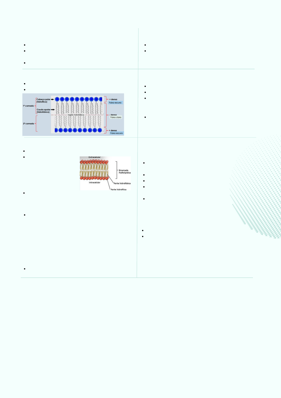 MEMBRANA CELULAR ENVOLVE A CÉLULA SEPARA O MEIO INTRA DO MEIO EXTRACELULAR (CONTROLE DE TRÂNSITO) MAIOR EFICIÊNCIA DE SISTEMA ENZIMÁTICOS MEMBRANA PLASMÁTICA MEMBRANA CELULAR MEMBRANAS INTERNAS SE DIFERENCIA DA MP APENAS POR SEREM MENOS ESPESSAS E APRESENTAM DIFERENÇA NA COMPOSIÇÃO DE LIPÍDIOS E PROTEÍNAS ESTRUTURA (ASPECTO) TRILAMINAR CHAMADA UNIDADE DE MEMBRANA BICAMADA ESTRUTURA DA MEMBRANA LIPÍDIOS PROTEÍNAS CARBOIDRATOS MODELO MOSAICO FLUIDO Os lipídios formam uma camada dupla fluída e contínua, onde estão inseridas moléculas proteicas - mosaico fluido LIPIDIOS NA MEMBRANA PRINCIPAIS ( FOFOLIPÍDIOS, GLICOLIPÍDIOS, COLESTEROL) BICAMADA LIPÍDICA -SÃO ANFIPÁTICOS -CADEIAS APOLARES (HIDROFOBICAS) -CABEÇAS POLARES (HIDROFILICAS) AS CAMADAS SE MANTÉM UNIDAS PELAS INTERAÇÔES HIDROFÓBICAS DOS LIPÍDIOS FLUIDEZ DAS MEMBRANAS O TAMANHO DA CADEIA DOS ÁCIDOS GRAXOS E A QUANTIDADE DE LIGAÇÕES DUPLAS INFLUENCIAM NA FLUIDEZ DA MEMBRANA. 1. FOSFOLIPÍDIOS INSATURADOS (APRESENTAM SEQUÊNCIA DE C COM DUPLAS LIGAÇÕES) CONFEREM MAIOR FLUIDEZ; 2. FOSFOLIPÍDIOS SATURADOS (APRESENTAM SEQUÊNCIA DE C COM LIGAÇÕES SIMPLES) CONFEREM MENOR MOBILIDADE; QUANTO MAIOR A CONCENTRAÇÃO DE ESTERÓIS, MENOS FLUIDA SERÁ A MEMBRANA; PROTEINAS INTEGRAIS FIRMEMENTE ASSOCIADAS AOS LIPIDIOS, SENDO REMOVIDAS APENAS COM DETERGENTE INTERAGEM COM A REGIÃO HIDROFOBICA REPRESENTAM 70% DAS PROTEINAS DE MEMBRANA PROTEINAS TRANSMEMBRANA: ATRAVESSAM INTEIRAMENTE A BICAMADA LIPIDICA PROTEINA TRANSMEMBRANA DE PASSAGEM MÚLTIPLA: ATRAVESSAM A MEBRANA VARIAS VEZES PROTEINAS INTEGRAIS ISOLADAS FACILMENTE POR SOLUÇÕES SALINAS SE LIGAM A MEMBRANA POR INTERAÇÃO COM AS PROTEINAS INTEGRAIS OU COM A REGIÃO POLAR DOS LIPIDIOS ASSIMETRIA DA MEMBRANA 1- DIFERENTES FOSFOLIPÍDIOS NUM E NOUTRA CAMADA: -CAMADA EXTERNA: FOSFATIDILCOLINAS E ESFINGOMIELINAS; -CAMADA INTERNA: FOSFATIDILSERINAS E FOSFATIDILETANOLAMINAS 2- AS PROTEÍNAS PERIFÉRICAS ESTÃO MAIS CONCENTRADAS NA FACE CITOPLASMÁTICA; 3- GLICOCÁLICE = GLICOLIPÍDIOS E GLICOPROTEÍNAS SÃO ENCONTRADOS SOMENTE NA SUPERFÍCIE EXTERNA DA MEMBRANA; 4- DIFERENÇA DE CARGA ELÉTRICA NA BICAMADA: FOSFATIDILSERINAS POSSUEM CARGA NEGATIVA, E SE SITUAM PREFERENCIALMENTE NA FACE CITOPLASMÁTICA; TRANSPORTE ATRAVÉS DA MEMBRANA DIFUSÃO SIMPLES - PASSAGEM DE SOLUTO DIFUSÃO FACILITADA - PASSAGEM DE SOLUTO OSMOSE - PASSAGEM DA ÁGUA TRANSPORTE PASSIVO TRANSPORTE ATIVO PASSAGEM DE SOLUTO OCORRE SEMPRE A FAVOR DO GRADIENTE, NO SENTIDO DE IGUALAR AS CONCENTRAÇÕES NAS DUAS FACES DA MEMBRANA NÃO HÁ GASTO DE ENERGIA PASSAGEM DE SOLUTOS PASSAGEM DE ÁGUA DIFUSÃO SIMPES PASSAGEM DE SOLUTO, DO LOCAL DE MAIOR PARA MENOR CONCENTRAÇÃO, ATÉ ESTABELECER UM EQUILIBRIO PROCESSO LENTO SE DÁ EM RESPOSTA AO GRADIENTE DE CONCENTRAÇÃO DIFUSÃO FACILITADA GLICOSE E ALGUNS AMINOÁCIDOS ENTRAM NA CÉLULA A FAVOR DO GRADIENTE DE CONCENTRAÇÃO SEM GASTO DE ENERGIA MAIS RAPIDA QUE A DIFUSÃO SIMPLES HÁ UMA MOLÉCULA TRANSPORTADORA - PERMEASE A SUA VELOCIDADE É PROPORCIONAL Á CONCENTRAÇÃO DO SUBSTRATO, ATÉ O PONTO DE SATURAÇÃO QUANDO TODAS AS PERMEASES ESTÃO SENDO UTILIZADAS A VELOCIDADE NÃO PODE MAIS AUMENTAR OSMOSE A ÁGUA SE MOVIMENTA LIVREMENTE ATRAVÉS DA MEMBRANA SEMPRE SO LOCAL DE MENOR PARA O DE MAIOR CONCENTRAÇÃO DE SOLUTO OSMOSE EM CÉLULA ANIMAL CÉLULAS ANIMAIS NÃO TEM PAREDE CELULAR EM UM MEIO HIPOTÔNICO A CELULA ABSORVE ÁGUA E PODE ESTOURAR A CÉLULA (LISE CELULAR) OSMOSE EM CÉLULA VEGETAL HÁ GASTIO DE ENERGIA OCORRE CONTRA OS GRADIENTES A ENERGIA VEM DA HIDROLISE DO ATP EX: BOMBA DE SÓDIO E POTÁSSIO TRANSPORTE ACLOPADO MUITAS MOLÉCULAS PEGAM ‘CARONA’ COM OUTRAS SUBSTÂNCIAS OU ÍONS, PARA ENTRAR OU SAIR DAS CÉLULAS, UTILIZANDO O MESMO VEÍCULO DE TRANSPORTE; MOLÉCULAS DE AÇÚCAR - INGRESSAM NAS CÉLULAS CONTRA O SEU GRADIENTE DE CONCENTRAÇÃO. TRANSPORTE EM GRANDES QUANTIDADES - ENDOCITOSE- PASSAGEM DO MEIO EXTRA PARA O INTRACELULAR ATRAVÉS DE VESÍCULAS LIMITADAS POR MEMBRANAS; EXEMPLOS: PINOCITOSE - MOLÉCULAS SOLÚVEIS; FAGOCITOSE – MATERIAL SÓLIDO -EXOCITOSE- PERMITE A EXCREÇÃO E SECREÇÃO DE SUBSTÂNCIAS; DÁ-SE EM TRÊS FASES: MIGRAÇÃO, FUSÃO E LANÇAMENTO;