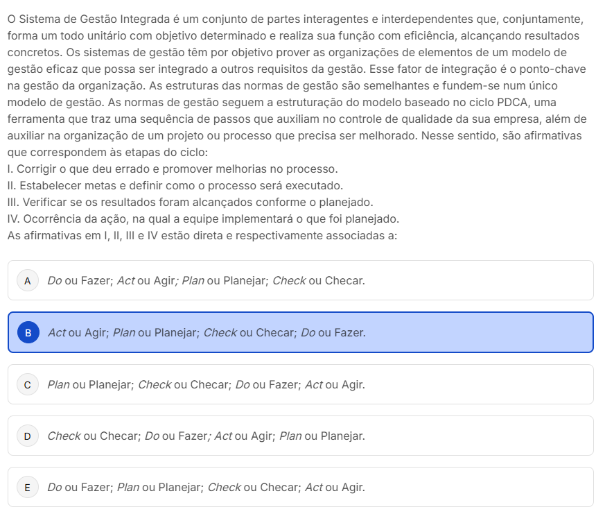 Sistema de Gestão Integrada é um conjunto de partes interagentes e interdependentes que, conjuntamente, forma um todo unitário com objetivo determinado e realiza sua função com eficiência, alcançando resultados concretos. Os sistemas de gestão têm por objetivo as organizações de elementos de um modelo de gestão eficaz que possa ser integrado a outros requisitos da gestão. Esse fator de integração é ponto-chave na gestão da organização. As estruturas das normas de gestão são semelhantes e fundem-se num único modelo de gestão. As normas de gestão seguem a estruturação do modelo baseado no ciclo PDCA, uma ferramenta que traz uma sequência de passos que auxiliam no controle de qualidade da sua empresa, além de auxiliar na organização de um projeto ou processo que precisa ser melhorado. Nesse sentido, são afirmativas que correspondem às etapas do ciclo: I. Corrigir que deu errado e promover melhorias no processo. II. Estabelecer metas e definir como processo será executado. III. se os resultados foram alcançados conforme planejado. IV. Ocorrência da ação, na qual a equipe implementará que foi planejado. As afirmativas em I, II, III e IV estão direta e respectivamente associadas a: A Do ou Fazer; Act ou Agir; Plan ou Planejar; Check ou Checar. B Act ou Agir; Plan ou Planejar; Check ou Checar; Do ou Fazer. C Plan ou Planejar; Check ou Checar; Do ou Fazer; Act ou Agir. D Check ou Checar; Do ou Fazer; Act ou Agir; Plan ou Planejar. E Do ou Fazer; Plan ou Planejar; Check ou Checar; Act ou Agir.