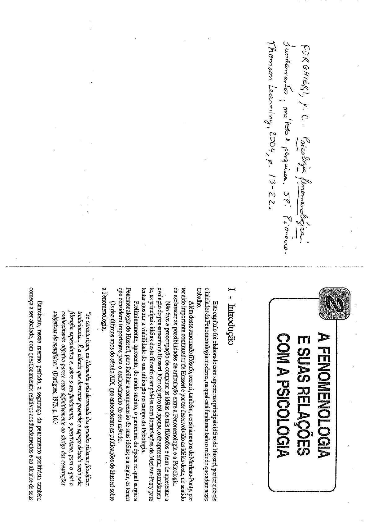 2 A FENOMENOLOGIA C. E SUAS RELAÇÕES e SP: COM A PSICOLOGIA 2004, P. I - Introdução Este capítulo foi elaborado com suporte nas principais idéias de Husserl, por ter sidorele 0 iniciador da Fenomenologia moderna, na qual está fundamentado o método que adoto neste trabalho. Além desse renomado filósofo, recorri, também, a ensinamentos de Merleau-Ponty, por ter sido importante continuador de Husserl e por ter desenvolvido as idéias deste, no sentido de esclarecer as possibilidades de articulação entre a Fenomenologia e a Psicologia. Não tive a preocupação de comparar as idéias de tais filósofos e nem de apresentar a evolução do pensamento de Husserl. Meu objetivo foi, apenas, o de apresentar, resumidamen- te, as principais idéias deste filósofo e ampliá-las com formulações de Merleau-Ponty para tentar mostrar a viabilidade de sua utilização no campo da Psicologia. Preliminarmente, apresento, de modo sucinto, panorama da época na qual surgiu a Fenomenologia de Husserl, para facilitar a compreensão de suas idéias; e a seguir, os temas que considerei importantes para o esclarecimento do seu método. Os dez últimos anos do século XIX, que antecederam as publicações de Husserl sobre a Fenomenologia, "se caracterizam, na Alemanha pela derrocada dos grandes sistemas filosóficos tradicionais. É a ciência que doravante preenche espaço deixado vazio pela filosofia especulativa e, sobre 0 seu fundamento, 0 positivismo, para 0 qual 0 conhecimento objetivo parece estar definitivamente ao abrigo das construções subjetivas da metafísica." (Dartigues, 1973, p. 16.) Entretanto, nesse mesmo período, a segurança do pensamento positivista também começa a ser abalada, com questionamentos relativos aos e ao alcance de seus14 YOLANDA CINTRÃO FORGHIERI A FENOMENOLOGIA E SUAS RELAÇÕES COM A PSICOLOGIA 15 postulados, em virtude de serem elaborados por um sujeito concreto, ficando, portanto, "Não é das Filosofias que deve partir 0 impulso da investigação, mas sim das dependentes do psiquismo coisas e dos problemas. Aquele que é deveras independente de preconceitos não se importa com uma averiguação ter origem em Kant ou Tomás de Aquino, em "A essas questões, os últimos ramos do pensamento kantiano ou neokantiano Darwin ou Aristóteles... Mas é precisamente próprio da Filosofia, seu trabalho tentam responder, concebendo um "sujeito puro" que asseguraria a objetividade científico situar-se em esferas de intuição direta." (Husserl, 1965, pp. 72 e 73.) e a coerência dos diferentes domínios do conhecimento objetivo." (Idem, p. 17.) Afirma querer "voltar às coisas mesmas", considerando-as como o ponto de partida do Mas as dúvidas quanto à existência desse "sujeito puro" e as preocupações com sujeito Entretanto, a "coisa mesma" é entendida por ele não como realidade existindo concreto em sua vida psíquica imediata passam a ter predominância nessa época, preparando em si, mas como fenômeno, e considera como a única coisa à qual temos acesso imediato o terreno para o aparecimento da Fenomenologia Entre as obras importantes, que e intuição originária; o fenômeno integra a consciência e o objeto, unidos no próprio ato de para ela contribuíram, encontram-se as dos filósofos Brentano (Psicologia do Ponto de Vista significação. A consciência é sempre intencional, está constantemente voltada para um Empírico, 1884) e Dilthey (Idéias Concernentes a uma Psicologia Descritiva e Analítica, objeto, enquanto este é sempre objeto para consciência; há entre ambos uma 1894), que censuram as ciências humanas especialmente a Psicologia por terem essencial, que só se dá na intuição originária da vivência. adotado o método das ciências da natureza, cujo objeto de estudo é diferente. Dilthey afirma A intencionalidade é, essencialmente, ato de atribuir um sentido; é ela que unifica a que a natureza só é acessível indiretamente, a partir de explicações sobre fatos e elementos, consciência e objeto, sujeito e o mundo. Com a intencionalidade há o reconhecimento de mas que a vida psíquica é uma totalidade da qual temos compreensão intuitiva e imediata; considera que o sentimento de viver é 0 solo verdadeiro das ciências humanas e método que o mundo não é pura exterioridade e o sujeito não é pura interioridade, mas a saída de si compreensivo, o único adequado à sua investigação. para um mundo que tem uma significação para ele. Brentano, cujas idéias exerceram grande influência no pensamento de Husserl, estabe- lece profundas diferenças entre os eventos físicos e os fenômenos psíquicos, afirmando que 2. A redução fenomenológica e a intuição das essências nestes existe intencionalidade e um modo de percepção original, imediato. Propõe retorno às experiências vividas e a descrição autêntica destas, livre de todo o pressuposto genético A redução é o recurso da Fenomenologia para chegar ao fenômeno como tal, ou à sua ou metafísico; suas investigações, porém, permaneceram limitadas ao âmbito da Psicologia essência; pode ser sintetizada em dois princípios: um negativo, que rejeita tudo aquilo que não (Kelkel e Scherer, 1982). é apodicticamente verificado; outro positivo, que apela para a intuição originária do Nesse panorama surgem, no início do século XX, as primeiras obras sobre Fenomeno- fenômeno, na imediatez da vivência. logia, de Husserl (1901, 1907, 1911), que, embora partindo das idéias de Brentano sobre a Na vida cotidiana temos uma atitude natural diante de tudo que nos rodeia, acreditando intencionalidade, vai além deste, investigando-a na "vivência de consciência" como tal, e que o mundo existe por si mesmo, independentemente de nossa presença. A atitude natural, chegando a uma análise profunda do conhecimento, que ultrapassa os limites da Psicologia. não refletida, ignora a existência da consciência, como a "doadora" de sentido de tudo que Sua obra consiste, so