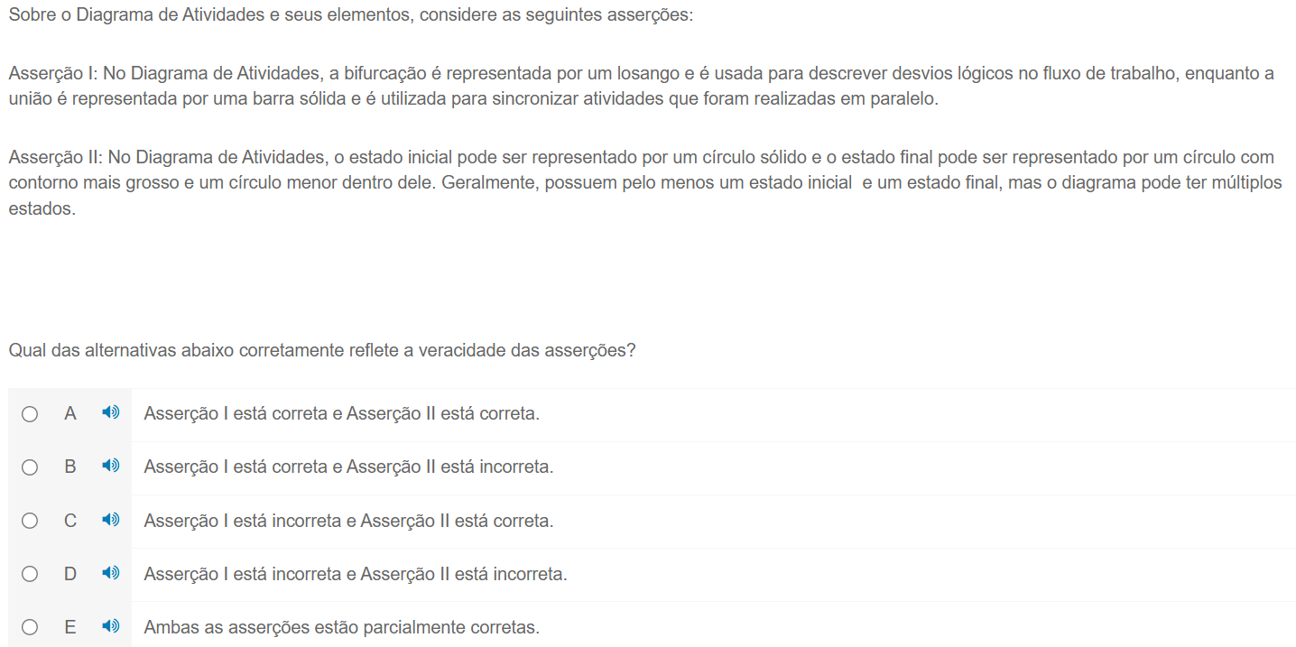 Sobre o Diagrama de Atividades e seus elementos, considere as seguintes asserções: Asserção I: No Diagrama de Atividades, a bifurcação é representada por um losango e é usada para descrever desvios lógicos no fluxo de trabalho, enquanto a união é representada por uma barra sólida e é utilizada para sincronizar atividades que foram realizadas em paralelo. Asserção II: No Diagrama de Atividades, o estado inicial pode ser representado por um círculo sólido e estado final pode ser representado por um círculo com contorno mais grosso e um círculo menor dentro dele. Geralmente, possuem pelo menos um estado inicial e um estado final, mas diagrama pode ter múltiplos estados. Qual das alternativas abaixo corretamente reflete a veracidade das asserções? A Asserção I está correta e Asserção está correta. B Asserção está correta e Asserção II está incorreta. C Asserção está incorreta e Asserção está correta. D Asserção I está incorreta e Asserção II está incorreta. E Ambas as asserções estão parcialmente corretas.