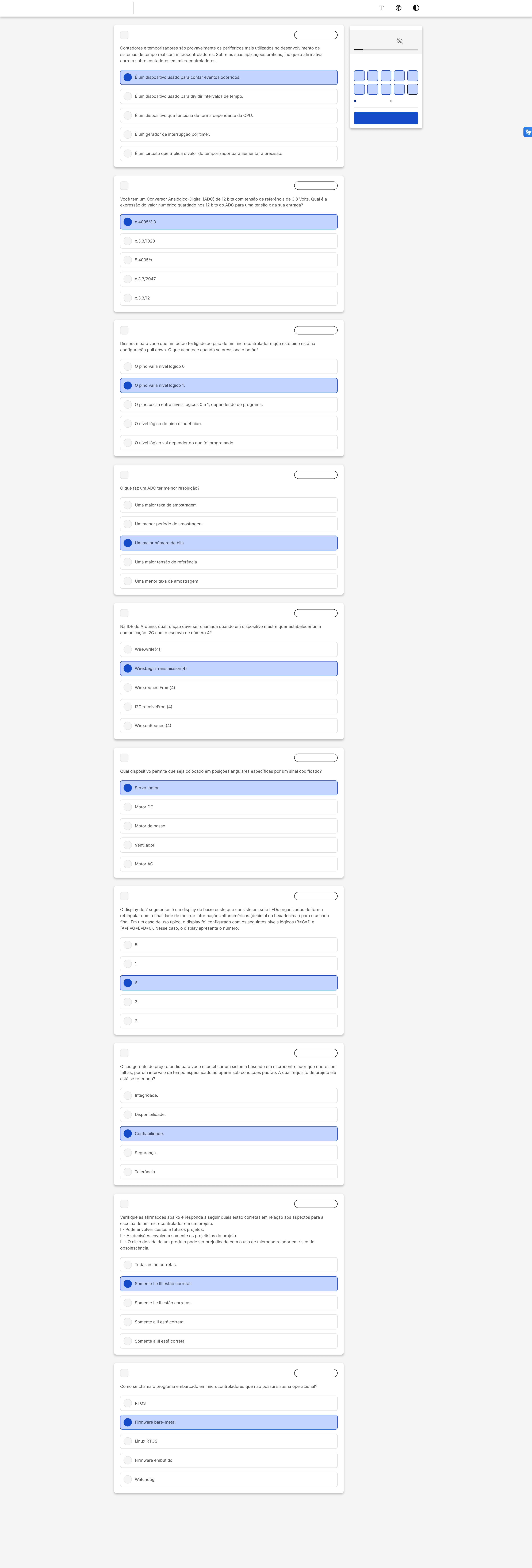 A B C D E A B C D E A B C D E A B C D E A B C D E A B C D E A B C D E A B C D E A B C D E A B C D E 1 Marcar para revisão Contadores e temporizadores são provavelmente os periféricos mais utilizados no desenvolvimento de sistemas de tempo real com microcontroladores. Sobre as suas aplicações práticas, indique a afirmativa correta sobre contadores em microcontroladores. É um dispositivo usado para contar eventos ocorridos. É um dispositivo usado para dividir intervalos de tempo. É um dispositivo que funciona de forma dependente da CPU. É um gerador de interrupção por timer. É um circuito que triplica o valor do temporizador para aumentar a precisão. 2 Marcar para revisão Você tem um Conversor Analógico-Digital �ADC) de 12 bits com tensão de referência de 3,3 Volts. Qual é a expressão do valor numérico guardado nos 12 bits do ADC para uma tensão x na sua entrada? x.4095/3,3 x.3,3/1023 5.4095/x x.3,3/2047 x.3,3/12 3 Marcar para revisão Disseram para você que um botão foi ligado ao pino de um microcontrolador e que este pino está na configuração pull down. O que acontece quando se pressiona o botão? O pino vai a nível lógico 0. O pino vai a nível lógico 1. O pino oscila entre níveis lógicos 0 e 1, dependendo do programa. O nível lógico do pino é indefinido. O nível lógico vai depender do que foi programado. 4 Marcar para revisão O que faz um ADC ter melhor resolução? Uma maior taxa de amostragem Um menor período de amostragem Um maior número de bits Uma maior tensão de referência Uma menor taxa de amostragem 5 Marcar para revisão Na IDE do Arduino, qual função deve ser chamada quando um dispositivo mestre quer estabelecer uma comunicação I2C com o escravo de número 4? Wire.write(4�; Wire.beginTransmission(4� Wire.requestFrom(4� I2C.receiveFrom(4� Wire.onRequest(4� 6 Marcar para revisão Qual dispositivo permite que seja colocado em posições angulares específicas por um sinal codificado? Servo motor Motor DC Motor de passo Ventilador Motor AC 7 Marcar para revisão O display de 7 segmentos é um display de baixo custo que consiste em sete LEDs organizados de forma retangular com a finalidade de mostrar informações alfanuméricas (decimal ou hexadecimal) para o usuário final. Em um caso de uso típico, o display foi configurado com os seguintes níveis lógicos �B�C�1) e �A�F�G�E�D�0�. Nesse caso, o display apresenta o número: 5. 1. 6. 3. 2. 8 Marcar para revisão O seu gerente de projeto pediu para você especificar um sistema baseado em microcontrolador que opere sem falhas, por um intervalo de tempo especificado ao operar sob condições padrão. A qual requisito de projeto ele está se referindo? Integridade. Disponibilidade. Confiabilidade. Segurança. Tolerância. 9 Marcar para revisão Verifique as afirmações abaixo e responda a seguir quais estão corretas em relação aos aspectos para a escolha de um microcontrolador em um projeto. I � Pode envolver custos e futuros projetos. II � As decisões envolvem somente os projetistas do projeto. III � O ciclo de vida de um produto pode ser prejudicado com o uso de microcontrolador em risco de obsolescência. Todas estão corretas. Somente I e III estão corretas. Somente I e II estão corretas. Somente a II está correta. Somente a III está correta. 10 Marcar para revisão Como se chama o programa embarcado em microcontroladores que não possui sistema operacional? RTOS Firmware bare-metal Linux RTOS Firmware embutido Watchdog 00 hora : 42 min : 45 seg Ocultar Questão 10 de 10 Respondidas �10� Em branco �0� Finalizar prova 1 2 3 4 5 6 7 8 9 10 SM2 Programação De Microcontroladores