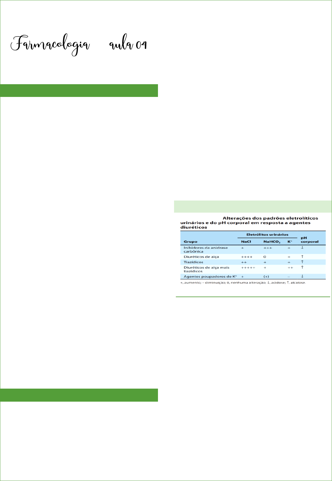 Larissa Costa – 4° semestre – FTC 1 – DIURÉTICOS FISIOLOGIA RENAL → O sistema renal tem como unidade funcional o néfron, esse é formado por diversas porções que são responsáveis por reabsorver substâncias úteis e eliminar substâncias tóxicas. → O glomérulo é responsável pela primeira filtração, onde teremos a passagem do sangue, sem proteínas e elementos figurados, para a capsula de Bowman, formando o filtrado glomerular. → Seguido temos o túbulo contorcido proximal, responsável pera reabsorção de Na+ / K+ / Ca++ / Mg ++ e, consequente, água, além de reabsorver e praticamente toda a glicose por transporte ativo. o Na porção dos segmentos retos, teremos a secreção e reabsorção de ácidos e bases orgânicas, incluindo ácido úrico e a maioria dos diuréticos. → Posteriormente, teremos a alça de Henle, que se divide em porção descente, onde temos uma grande quantidade de aquaporina, e assim intensa reabsorção de água por transporte passivo. o Já na porção ascendente da alça de Henle, teremos reabsorção ativa de Na+ / K+ / Cl-, e reabsorção secundária de Ca++ e Mg ++. → No túbulo contorcido distal temos reabsorção ativa do Na+ e Cl-, além da reabsorção do Ca++ pela ação do paratormônio. o Nessa porção do néfron que temos a secreção ativa de drogas que ingerimos, tal como remédios e álcool, → O túbulo coletor é dividido em porção cortical, onde temos reabsorção de Na+ acoplada a secreção de K+ e H+. o Na porção medular temos reabsorção de água pela ação do ADH. DIURÉTICOS → São responsáveis por causar o aumento do volume urinário. → São usados no tratamento hipertensivo, geralmente associados a outros medicamentos anti-hipertensivos. → Os diuréticos diminuem o volume intravascular ao aumentar a excreção renal de Na+ e H2O. → EFEITOS ADVERSOS: o Podem diminuir os efeitos dos agentes uricosúricos e dos hipoglicemiantes. o Podem aumentar os efeitos dos digitálicos (intoxicação digitálica). o A efetividade terapêutica pode ser alterada por AINE. o A anfotericina B e os corticosteroides. o Podem surgir taquiarritmias ventriculares quando associados com a quinidina (potencialmente fatal). o Podem aumentar a hipocalemia. o Podem causar toxicidade ao lítio. → Para um tratamento efetivo, os diuréticos devem ser prescritos em conjunto a uma dieta com baixo teor de sódio, além de hábitos de vida saudáveis como a prática de atividade física. CLASSES FARMACOLÓGICAS INIBIDORES DA ANIDRASE CARBÔNICA → MECANISMO DE AÇÃO: A anidrase carbônica é uma enzima responsável por catalisar a reação do ácido carbônico em CO2 e H2O, assim, esses inibidores vão inibir reversivelmente essa reação e consequentemente vão inibir a reabsorção de sódio. Além disso, promove a diminuição de prótons (H+) disponíveis para a troca Na+/H+ e a consequente diminuição da reabsorção (aumento da excreção) de Na+ e água. Por também haver excreção do íon bicarbonato, ocorrerá a alcalinização da urina e acidificação do sangue. → Efeitos colaterais: acidose sanguínea, devido a eliminação de sódio o pH será reduzido, podendo ocasionar a acidose. → Representante: Acetazolamida → Uso terapêutico Larissa Costa – 4° semestre – FTC 2 o Glaucoma: é mais utilizada hoje como tratamento do glaucoma, na forma de colírio, diminuindo a pressão ocular do paciente. ▪ No glaucoma, os inibidores da AC reduzem a pressão intra-ocular, devido à alta concentração desta enzima no globo ocular, local onde ocorre a secreção do humor aquoso. o Edema o Alcalose metabólica o É usada também em pessoas que realizam alpinismo, assim, o bicabornato formado nessas pessoas no alto das montanhas devido a mudança de altitude, será eliminado com mais facilidade. DIURÉTICOS OSMÓTICOS → MECANISMO DE AÇÃO: age aumentando a osmolaridade do líquido tubular, ou seja, aumenta a pressão osmótica a fim de impedir a reabsorção de água. o Por possuírem caráter hidrofílico, não são absorvidos pelas células tubulares, criando uma pressão osmótica no interior do túbulo e, com isto, impedindo que a água seja reabsorvida, sendo eliminada. → Representantes: o Manitol: utilizada em ambientes hospitalares, por via venosa, geralmente em pacientes em crises graves, tal como insuficiência renal aguda, crise aguda de glaucoma e edema cerebral. ▪ O manitol é o único utilizado como diurético, geralmente associado à furosemida no tratamento da oligúria e anúria, que consiste na diminuição e ausência da produção de urina, respectivamente. ▪ Aumenta a excreção de Na+, K+, Ca++, Mg, Cl-, HCO3- e fosfato. ▪ O manitol pode ser ingerido oralmente em ambiente hospitalar, realizando mudança de osmolaridade no intestino e gerando uma diarreia osmótica. ▪ Local de ação: TCP e alça de Henle o Ureia: a ureia é menos utilizada devido a sua toxicidade. o Glicerina o Isossorbida → Efeitos colaterais o Litíase: perde muito cálcio, ocasionando a sua insolubilidade, podendo desenvolver litíase. o Acidose metabólica o Hiperamonemia: a urina torna-se alcalina dificultando a absorção de algumas substâncias. o Hipocalemia: devido ao aumento do sódio. INIBIDORES SIMPORTE NA+ / K+ / CL – OU DIÚRETICOS DE ALÇA → MECANISMO DE AÇÃO: Inibem o co-transporte de Na+/K+/Cl- no ramo ascendente da Alça de Henle. → Devido a depleção de eletrólitos (Na, Cl, Mg, Ca e K), podem causar arritmias. → São bastante usados no tratamento de edema, principalmente no edema agudo de pulmão. → Principal representante: furosemida o A furosemida é dita como um dos diaureticos mais eficazes por aumenta a excreção de Na+, K+, Cl- e ácido úrico, e agir fora do sistema renal, agindo sobre a prostaglandina E2, estimulando a vasodilatação de alguns vasos, e também ter ação sob a anidrase carbônica, contribuindo para a diurese. o A furosemida possui acentuado poder de ex