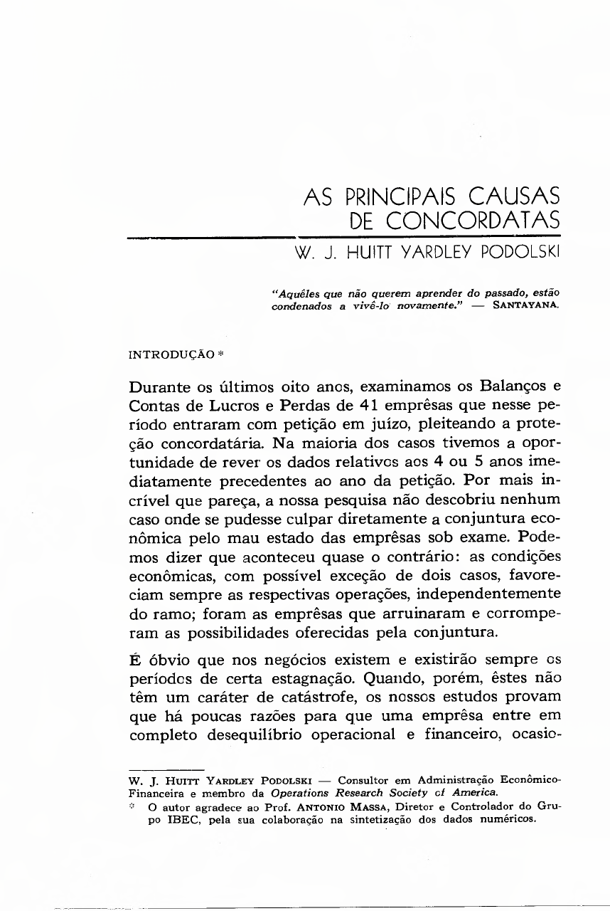 AS PRINCIPAIS CAUSAS DE CONCORDATAS W. J. HUITT YARDLEY PODOLSKI "Aquêles que não querem aprender do passado, estão condenados a vivê-lo novamente." - SANTAYANA. INTRODUÇÃO * Durante os últimos oito anos, examinamos os Balanços e Contas de Lucros e Perdas de 41 emprêsas que nesse pe- ríodo entraram com petição em juízo, pleiteando a prote- ção concordatária. Na maioria dos casos tivemos a opor- tunidade de rever os dados relativos aos 4 ou 5 anos ime- diatamente precedentes ao ano da petição. Por mais in- crível que pareça, a nossa pesquisa não descobriu nenhum caso onde se pudesse culpar diretamente a conjuntura eco- nômica pelo mau estado das emprêsas sob exame. Pode- mos dizer que aconteceu quase o contrário: as condições econômicas, com possível exceção de dois casos, favore- ciam sempre as respectivas operações, independentemente do ramo; foram as emprêsas que arruinaram e corrompe- ram as possibilidades oferecidas pela conjuntura. É óbvio que nos negócios existem e existirão sempre os períodos de certa estagnação. Quando, porém, êstes não têm um caráter de catástrofe, os nossos estudos provam que há poucas razões para que uma emprêsa entre em completo desequilíbrio operacional e financeiro, ocasio- W. ]. HUIrr YARDLEYPODOLSKI - Consultor em Administração Econômico- Financeira e membro da Operations Reseercb Society cf America. '.' O autor agradece ao Prof. ANTONIO MASSA, Diretor e Controlador do Gru- po IBEC, pela sua colaboração na sintetização dos dados numéricos. . Iti CAUSAS DE CONCORDATA R.A.E./2'1 nando aos seus proprietários prejuízos irreparáveis, por razões outras que a imperícia dos seus administradores. CLASSIFICAÇÃO DAS CAUSAS As principais causas que levaram as emprêsas sob exame a uma situação sem solução foram divididas nas seguintes categorias: • Incorretos ajustes de um bom plano-base (fator pre- dominante em dois casos). Quando o seu mercado en- trou em uma momentânea retração, os dirigentes fo- ram tomados de pânico; os planos foram ajustados sem um completo exame dos possíveis efeitos a longo prazo de tais ajustes. • O esvaziamento das reservas do capital circulante (fator predominante em oito casos). Em todos os casos examinados a situação podia ser prevista atra- vés dos exames de balancetes mensais, e até pelo exa- me dos balancetes anuais. Em 80% dos casos, os ba- lancetes mensais revelaram as tendências incorretas, dois ou três anos antes da catástrofe. As causas dos problemas eram fáceis de serem saneadas. • Uma completa desorganização contábil e dados inve- rídicos sôbre as operações da emprêsa (fator predo- minante em vinte e três casos). Existiam manipulações dos dados para evitar paga- mento dos encargos tributários, ou para reduzir pelo menos a sua incidência, especialmente quanto ao im- pôsto de renda. Essas manipulações, naturalmente, vi- saram à redução dos tributos bem além dos possíveis limites legais. Freqüentemente as manipulações dos dados eram acompanhadas com as retiradas clandes- tinas e desvio dos fundos para fins particulares dos donos de emprêsas. Como resultado, após um certo tempo de contabilização incorreta, mesmo que dupla em alguns casos, os dirigentes perderam a noção da R.A.E.j27 CAUSAS DE CONCORDATA 17 realidade. Eventualmente, criou-se uma situação e ambiente fantasmagóricos, de onde era somente um passo para perda do contrôle sôbre as operações da emprêsa. • Crescimento descontrolado, onde os dirigentes expan- diram a emprêsa além dos limites determinados pelos fundos à sua disposição (fator predominante em três casos). • Desvio de fundos da emprêsa pelos funcionários gra- duados e de confiança dos proprietários da emprêsa (fator predominante em três casos). • Incorretos planos de vendas (fator predominante em dois casos). As 41 emprêsas examinadas tinham uma característica comum que as unia a um grupo só; essa característica pa- rece ser um denominador comum para tôdas as emprêsas em situação embaraçosa. Os dados e informações, com as quais os dirigentes trabalhavam. e nos quais eram basea- . das as suas decisões, eram muito confusos e desatualizados. É difícil acreditar que nos tempos atuais de progresso pla- nejado, possam existir entidades cujos dados sôbre sua vida, isto é, as mais vitais informações, possam ser trata- dos com tão grande descuido -- o que freqüentemente aconteceu - e com desprêzo, Do ponto de vista da infor- mação e comunicação, as emprêsas examinadas estavam perto de uma completa desorganização. Seus respectivos sistemas de contrôle eram quase inexistentes. ANÁLISE DOS DIRIGENTES O fato mais surpreendente foi que, em sua grande maioria, os respectivos dirigentes não eram homens ineptos. Com pequenas exceções, todos eram homens bàsicamente inte- ligentes e possuíam um bom grau de conhecimentos téc- nicos necessários para os ramos nos quais as emprêsas ope- ravam. É verdade que mais do que freqüentemente os re- l~ CAUSAS DE CONCORDATA R.A.E./27 feridos conhecimentos técnicos não eram suficientemente completos para os cargos de dirigentes. Também, em todos os casos não era suficiente ,o seu preparo psicológico para o exercício do cargo. Para dar ao leitor uma melhor perspectiva do problema, dedicamos um pouco de espaço ao exame das qualidades características dos homens que dirigiam aquelas quarenta e uma emprêsas. Os dados e as informações sôbre essagente não eram fáceis de obter. Entrevistas pessoais eram difíceis, muitas vêzes impossíveis; dados obtidos nem sempre podiam ser veri- ficados e, em sua maioria, foram obtidos de outras fontes que as diretamente envolvidas. Assim, deverão ser êsses dados tratados com uma boa dose de reserva. Servirão, po- rém, para dar uma idéia geral sôbre o tipo de pessoas que dirigiam as suas operações sem sucesso; mesmo que, pelos motivos já expostos, a análise compl