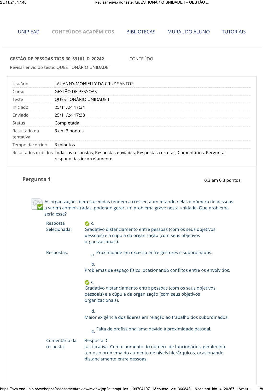 25/11/24, 17:40 Revisar envio do teste: QUESTIONÁRIO UNIDADE - UNIP EAD CONTEÚDOS ACADÊMICOS BIBLIOTECAS MURAL DO ALUNO TUTORIAIS GESTÃO DE PESSOAS 7025-60_59101_D_20242 CONTEÚDO Revisar envio do teste: QUESTIONÁRIO UNIDADE Usuário LAUANNY MONIELLY DA CRUZ SANTOS Curso GESTÃO DE PESSOAS Teste QUESTIONÁRIO UNIDADE Iniciado 25/11/24 17:34 Enviado 25/11/24 17:38 Status Completada Resultado da 3 em 3 pontos tentativa Tempo decorrido 3 minutos Resultados exibidos Todas as respostas, Respostas enviadas, Respostas corretas, Comentários, Perguntas respondidas incorretamente Pergunta 1 0,3 em 0,3 pontos As organizações bem-sucedidas tendem a crescer, aumentando nelas o número de pessoas a serem administradas, podendo gerar um problema grave nesta unidade. Que problema seria esse? Resposta C. Selecionada: Gradativo distanciamento entre pessoas (com os seus objetivos pessoais) e a cúpula da organização (com seus objetivos organizacionais). Respostas: Proximidade em excesso entre gestores e subordinados. a. b. Problemas de espaço físico, ocasionando conflitos entre os envolvidos. C. Gradativo distanciamento entre pessoas (com os seus objetivos pessoais) e a cúpula da organização (com seus objetivos organizacionais). d. Maior exigência dos líderes em relação ao trabalho dos subordinados. Falta de profissionalismo devido à proximidade pessoal. e. Comentário da Resposta: C resposta: Justificativa: Com o aumento do número de funcionários, geralmente temos o problema do aumento de níveis hierárquicos, ocasionando distanciamento entre pessoas. 1/825/11/24, 17:40 Revisar envio do teste: QUESTIONÁRIO UNIDADE - Pergunta 2 0,3 em 0,3 pontos Os conflitos entre empresa e funcionários são considerados comuns no mundo organizacional. Um dos principais fatores para evitar que eles aconteçam: Resposta C. Selecionada: Buscar equilíbrio entre as necessidades de ambas as partes, alcance dos objetivos organizacionais e satisfação das necessidades pessoais dos colaboradores. Respostas: Demitir todas as pessoas contrárias aos ideais da organização. a. b. Líderes objetivos e autoritários conseguem lidar melhor com situações de conflito. C. Buscar equilíbrio entre as necessidades de ambas as partes, alcance dos objetivos organizacionais e satisfação das necessidades pessoais dos colaboradores. d. Agir de acordo com o mercado de trabalho e dar aumento constante para os funcionários. e. Dar prioridade para os objetivos pessoais dos funcionários, uma vez que eles são mais importantes que as estratégias organizacionais. Comentário da Resposta: C resposta: Justificativa: Os conflitos são naturais, o importante é buscar o equilíbrio para que todas as partes possam ter uma relação de ganha- ganha. Pergunta 3 0,3 em 0,3 pontos A expectativa recíproca do indivíduo e da organização estende-se muito além de qualquer contrato formal de emprego que estabeleça o trabalho a ser realizado e a recompensa a ser recebida. Estamos tratando de: Resposta Selecionada: b. Contrato Psicológico. Respostas: Gestão de Pessoas. a. b. Contrato Psicológico. Ação dos C. d. Ação sindical. Contrato de trabalho. e. Comentário da Resposta: B resposta: Justificativa: O Contrato Psicológico é a relação estabelecida entre funcionários e empresa no momento da contratação, em que ambos 2/825/11/24, 17:40 Revisar envio do teste: QUESTIONÁRIO UNIDADE estipulam suas obrigações e expectativas para um melhor desempenho no futuro. Pergunta 4 0,3 em 0,3 pontos Ao tratar das relações entre pessoas e organizações Gondim apud Tamayo et al desenvolveram alguns aspectos relativos ao sistema de comportamentos da organização. Analise as assertivas abaixo em relação a esse tema. - Os aspectos cognitivos são relacionados às crenças presentes na organização. Os valores têm como função expressar interesses e desejos, e representam metas da empresa. III Normas definem comportamentos e valores justificam comportamentos. IV Deve haver classificação ordenada dos valores organizacionais. São corretas as afirmativas: Resposta Selecionada: e. I, III e IV. Respostas: a. e II. b. III. e III. C. d. I, III e IV. e. Comentário da Resposta: E resposta: Justificativa: Gondim apud Tamayo et al (2000) desenvolveram alguns aspectos relativos ao sistema de comportamentos na organização. 1 aspecto cognitivo dos valores organizacionais constitui um elemento básico, já que são crenças existentes na empresa. 2 - O aspecto motivacional: A raiz dos valores organizacionais é motivacional, eles expressam interesses e desejos e representam metas mais ou menos conscientes da empresa. 3 A função dos valores: Os valores têm como função orientar a vida da empresa, guiar o comportamento dos seus membros. 4 - Hierarquia dos valores: classificação ordenada de valores. Normas definem comportamentos e valores justificam. Pergunta 5 0,3 em 0,3 pontos Os valores organizacionais são elementos provenientes da cultura organizacional, são as crenças e os conceitos básicos estabelecidos na organização. Qual sua importância nas empresas? Resposta a. Selecionada: Eles orientam e dão o senso de direção ao comportamento comum para todos os indivíduos inseridos na cultura da organização. 3/825/11/24, 17:40 Revisar envio do teste: QUESTIONÁRIO UNIDADE - Respostas: a. Eles orientam e dão o senso de direção ao comportamento comum para todos os indivíduos inseridos na cultura da organização. b. Sua importância é secundária, visto que os valores modificam relativamente bem todos os anos. C. Importância alta para diretores, gerentes, coordenadores e supervisores, mas baixa para pessoas que atuem mais na parte operacional. d. A cultura organizacional é importante, embora em momento algum ela se sobreponha ou modifique a cultura nossa adquirida na sociedade de forma geral. e. A cultura organizacional nem sempre é importante, uma vez que não altera comportamentos e não afeta as Comentário da Re