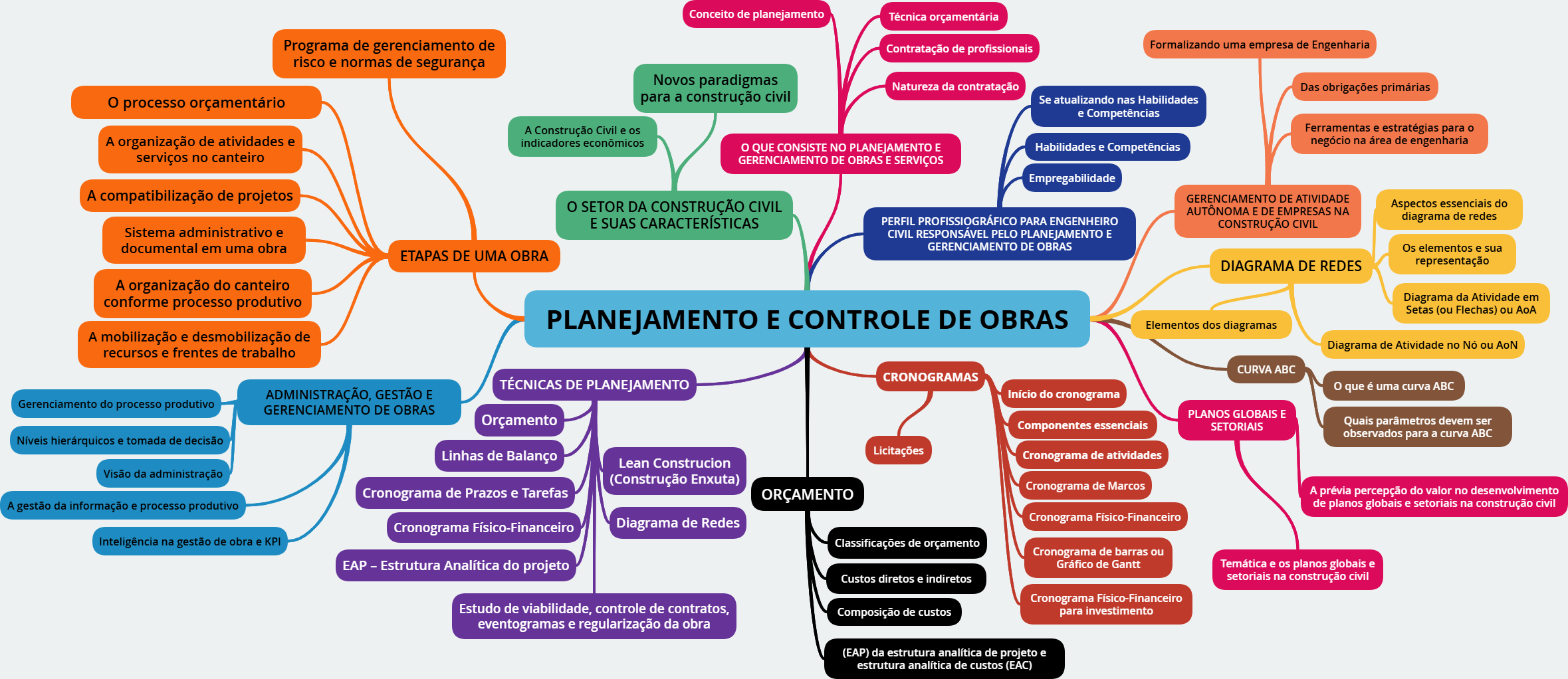Conceito de planejamento Técnica orçamentária Programa de gerenciamento de Contratação de profissionais Formalizando uma empresa de Engenharia risco e normas de segurança Novos paradigmas Natureza da contratação Das obrigações primárias o processo orçamentário para a construção civil Se atualizando nas Habilidades e Competências A Construção Civil e os Ferramentas e estratégias para o A organização de atividades e indicadores econômicos QUE CONSISTE NO PLANEJAMENTO E Habilidades e Competências negócio na área de engenharia serviços no canteiro GERENCIAMENTO DE OBRAS E SERVIÇOS Empregabilidade A compatibilização de projetos GERENCIAMENTO DE ATIVIDADE o SETOR DA CONSTRUÇÃO CIVIL Aspectos essenciais do AUTÔNOMA E DE EMPRESAS NA E SUAS CARACTERÍSTICAS PERFIL PROFISSIOGRÁFICO PARA ENGENHEIRO diagrama de redes CONSTRUÇÃO CIVIL Sistema administrativo e CIVIL RESPONSÁVEL PELO PLANEJAMENTO E documental em uma obra GERENCIAMENTO DE OBRAS Os elementos e sua ETAPAS DE UMA OBRA DIAGRAMA DE REDES representação A organização do canteiro conforme processo produtivo Diagrama da Atividade em Setas (ou Flechas) ou AoA PLANEJAMENTO E CONTROLE DE OBRAS Elementos dos diagramas A mobilização e desmobilização de recursos e frentes de trabalho Diagrama de Atividade no Nó ou AoN CURVA ABC CRONOGRAMAS TÉCNICAS DE PLANEJAMENTO ADMINISTRAÇÃO, GESTÃO E que é uma curva ABC Início do cronograma Gerenciamento do processo produtivo GERENCIAMENTO DE OBRAS PLANOS GLOBAIS E Orçamento Componentes essenciais SETORIAIS Quais parâmetros devem ser observados para a curva ABC Níveis hierárquicos e tomada de decisão Linhas de Balanço Licitações Cronograma de atividades Lean Construcion Visão da administração (Construção Enxuta) Cronograma de Prazos e Tarefas Cronograma de Marcos ORÇAMENTO A prévia percepção do valor no desenvolvimento A gestão da informação e processo produtivo de planos globais e setoriais na construção civil Cronograma Físico-Financeiro Diagrama de Redes Cronograma Físico-Financeiro Inteligência na gestão de obra e KPI Classificações de orçamento Cronograma de barras ou EAP Estrutura Analítica do projeto Gráfico de Gantt Temática e os planos globais e Custos diretos e indiretos setoriais na construção civil Cronograma Físico-Financeiro Estudo de viabilidade, controle de contratos, Composição de custos para investimento eventogramas e regularização da obra (EAP) da estrutura analítica de projeto e estrutura analítica de custos (EAC)