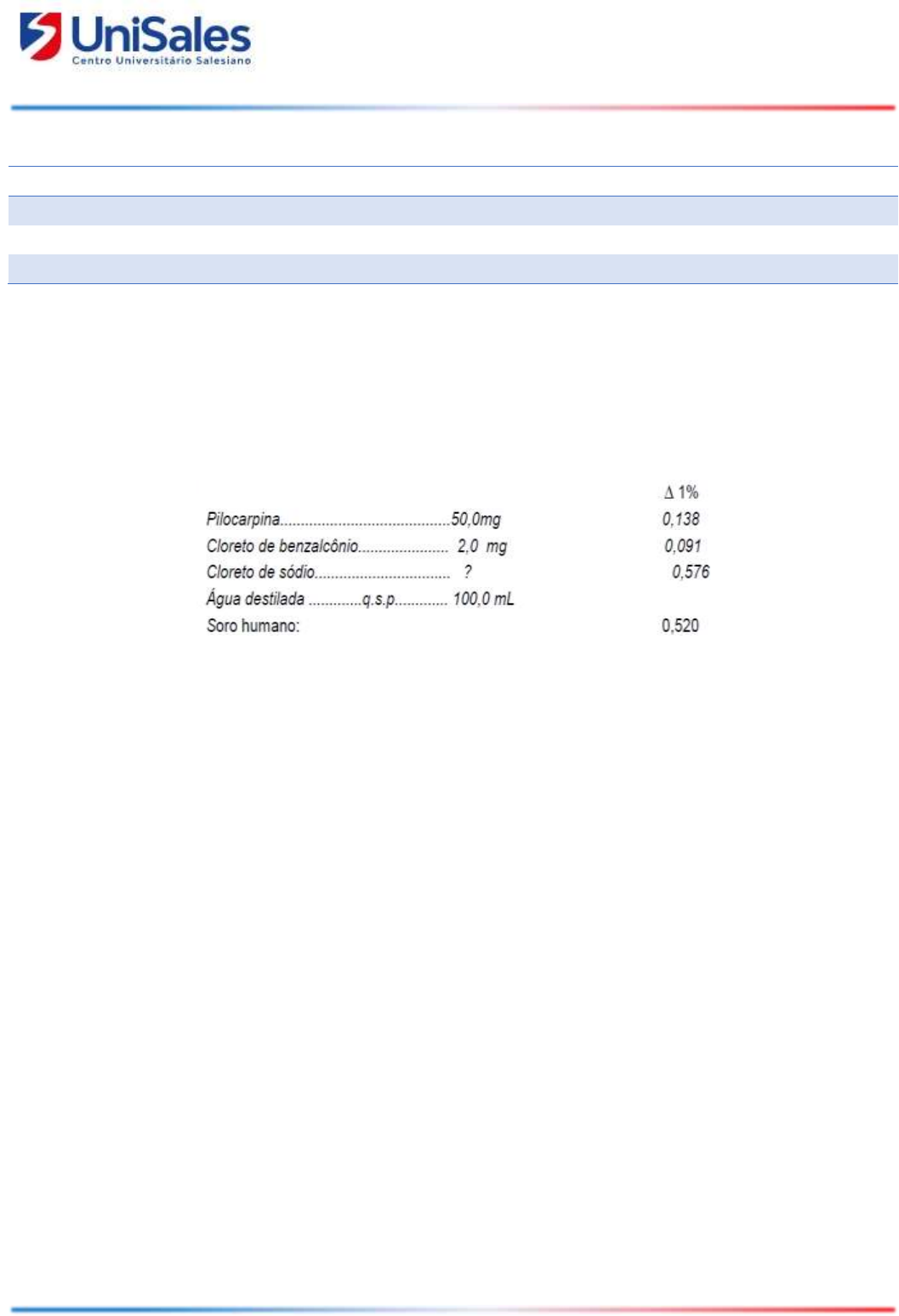 C E N T R O U N I V E R S I TÁ R I O S A L E S I A N O Credenciado pela Portaria nº677, de 18/07/2016, D.O.U. em 19/07/2016. Avaliação de Produto 2 PROJETO PRODUÇÃO DE MEDICAMENTOS E CONTROLE DA QUALIDADE PROFESSOR(ES) MAURICIO DA SILVA MATTAR CURSO/PERÍODO FARMÁCIA CONTEÚDO ISOTONIZAÇÃO DE MEDICAMENTOS 1. Dado o colírio abaixo, isotonizá-lo com cloreto de sódio. Sulfato de Zinco............................30 mg - 0,086 Cloreto de benzalcônio................100 mg - 0,091 Cloreto de sódio...............................? - 0,576 Água destilada .......q.s.p................10 ml 2. Calcule a quantidade de isotonizante a ser adicionada ao colírio abaixo, utilizando o cloreto de sódio: 3. Calcule a quantidade de isotonizante a ser adicionada ao colírio abaixo, utilizando o cloreto de sódio: Equivalente de NaCl Lidocaína.HCl 1,0% 0,22 Tetracaína.HCl 1,0% 0,16 Epinefrina bitartarato 0,1% 0,18 Cloreto de sódio ? Água destilada qsp 50 ml 4. Determine a quantidade de NaCl necessária para isotonisar o colírio de formulação expressa abaixo: Fosfato de sódio-dexametasona ........ 20 mg Fosfato dissódico ............................... 30 mg EDTA dissódico ................................. 1 mg Ag. Isotonisante ................................. qsp Água destilada ............................... qsp 10 ml Dados: Fosfato de sódio-dexametasona (∆Tc 1% = 0,095) Fosfato dissódico (∆Tc 1% = 0,126) EDTA dissódico (∆Tc 1% = 0,132) Ag. Isotonisante (∆Tc 1% = 0,576) C E N T R O U N I V E R S I TÁ R I O S A L E S I A N O Credenciado pela Portaria nº677, de 18/07/2016, D.O.U. em 19/07/2016. Avaliação de Produto 2 PROJETO PRODUÇÃO DE MEDICAMENTOS E CONTROLE DA QUALIDADE PROFESSOR(ES) MAURICIO DA SILVA MATTAR CURSO/PERÍODO FARMÁCIA CONTEÚDO ISOTONIZAÇÃO DE MEDICAMENTOS 5. Tem-se a seguinte formulação: Sulfato de efedrina ........ 2% Água estéril ......qsp....... 30 ml Necessita-se isotonisar a solução acima com cloreto de sódio e para isso sabe-se que o sulfato de efedrina corresponde a 0,23 g de cloreto de sódio. Portanto, qual seria a massa do sal isotonisante? Supondo que houvesse disponível solução estéril de cloreto de sódio a 0,9 % m/v, seria possível utilizá-la para o preparo da formulação acima requisitada? 6. Considere a formulação: Cloridrato de adrenalina .......................... 2% Clorobutanol.......................................... 0,5% Cloreto de sódio.................................... qs Água destilada ................qsp................ 25 ml Sabe-se que o equivalente em NaCl é: adrenalina: 0,3g; clorobutanol: 0,24g. Portanto, determine a massa de cloreto de sódio para a formulação, de modo que seja isotônica. Se usarmos a glicose como isotonisante, qual seria a massa necessária deste soluto? Sabe-se que a glicose apresenta equivalência ao NaCl igual a 0,16 g.