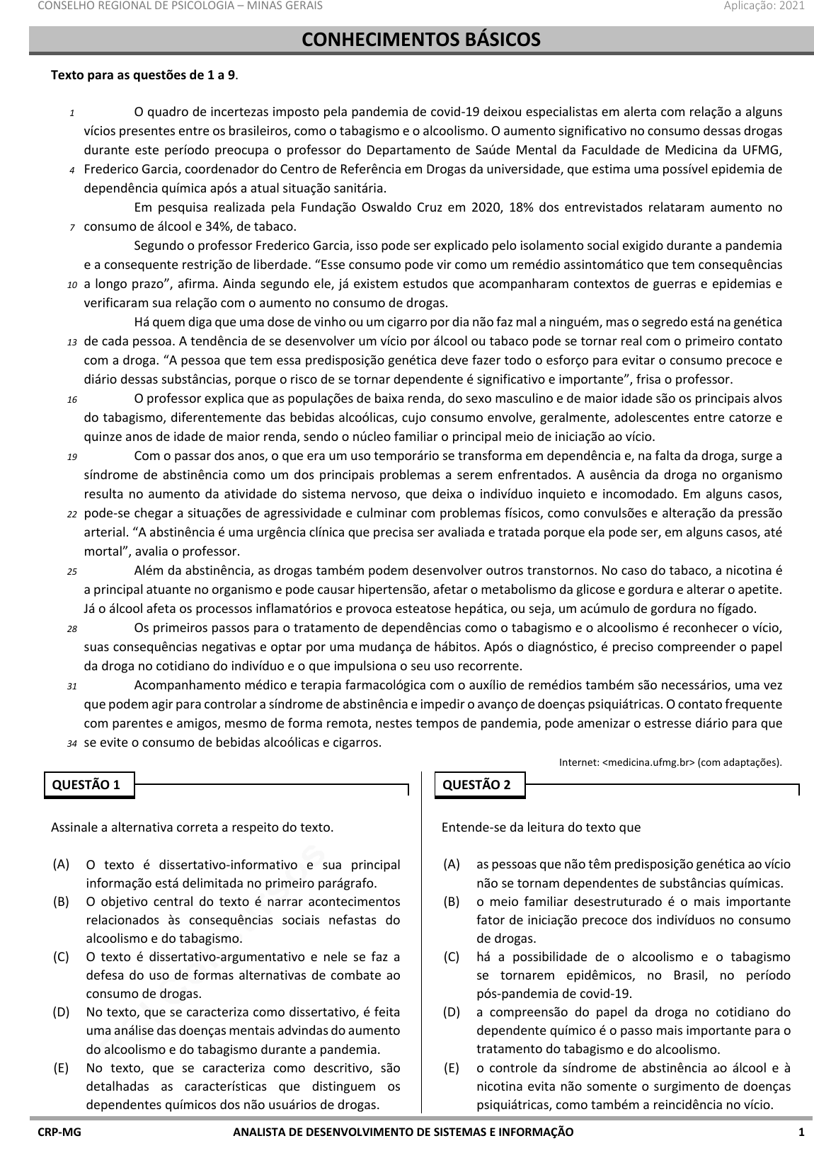 pcimarkpci MDAwMDowMDAwOjAwMDA6MDAwMDowMDAwOmZmZmY6OTU0ZTpiOTcw:VGh1LCAxOSBKdW4gMjAyNSAxMDo1OTo1OCAtMDMwMA== www.pciconcursos.com.br CONSELHO REGIONAL DE PSICOLOGIA – MINAS GERAIS Aplicação: 2021 CRP-MG ANALISTA DE DESENVOLVIMENTO DE SISTEMAS E INFORMAÇÃO 1 CONHECIMENTOS BÁSICOS Texto para as questões de 1 a 9. 1 4 7 10 13 16 19 22 25 28 31 34 O quadro de incertezas imposto pela pandemia de covid-19 deixou especialistas em alerta com relação a alguns vícios presentes entre os brasileiros, como o tabagismo e o alcoolismo. O aumento significativo no consumo dessas drogas durante este período preocupa o professor do Departamento de Saúde Mental da Faculdade de Medicina da UFMG, Frederico Garcia, coordenador do Centro de Referência em Drogas da universidade, que estima uma possível epidemia de dependência química após a atual situação sanitária. Em pesquisa realizada pela Fundação Oswaldo Cruz em 2020, 18% dos entrevistados relataram aumento no consumo de álcool e 34%, de tabaco. Segundo o professor Frederico Garcia, isso pode ser explicado pelo isolamento social exigido durante a pandemia e a consequente restrição de liberdade. “Esse consumo pode vir como um remédio assintomático que tem consequências a longo prazo”, afirma. Ainda segundo ele, já existem estudos que acompanharam contextos de guerras e epidemias e verificaram sua relação com o aumento no consumo de drogas. Há quem diga que uma dose de vinho ou um cigarro por dia não faz mal a ninguém, mas o segredo está na genética de cada pessoa. A tendência de se desenvolver um vício por álcool ou tabaco pode se tornar real com o primeiro contato com a droga. “A pessoa que tem essa predisposição genética deve fazer todo o esforço para evitar o consumo precoce e diário dessas substâncias, porque o risco de se tornar dependente é significativo e importante”, frisa o professor. O professor explica que as populações de baixa renda, do sexo masculino e de maior idade são os principais alvos do tabagismo, diferentemente das bebidas alcoólicas, cujo consumo envolve, geralmente, adolescentes entre catorze e quinze anos de idade de maior renda, sendo o núcleo familiar o principal meio de iniciação ao vício. Com o passar dos anos, o que era um uso temporário se transforma em dependência e, na falta da droga, surge a síndrome de abstinência como um dos principais problemas a serem enfrentados. A ausência da droga no organismo resulta no aumento da atividade do sistema nervoso, que deixa o indivíduo inquieto e incomodado. Em alguns casos, pode-se chegar a situações de agressividade e culminar com problemas físicos, como convulsões e alteração da pressão arterial. “A abstinência é uma urgência clínica que precisa ser avaliada e tratada porque ela pode ser, em alguns casos, até mortal”, avalia o professor. Além da abstinência, as drogas também podem desenvolver outros transtornos. No caso do tabaco, a nicotina é a principal atuante no organismo e pode causar hipertensão, afetar o metabolismo da glicose e gordura e alterar o apetite. Já o álcool afeta os processos inflamatórios e provoca esteatose hepática, ou seja, um acúmulo de gordura no fígado. Os primeiros passos para o tratamento de dependências como o tabagismo e o alcoolismo é reconhecer o vício, suas consequências negativas e optar por uma mudança de hábitos. Após o diagnóstico, é preciso compreender o papel da droga no cotidiano do indivíduo e o que impulsiona o seu uso recorrente. Acompanhamento médico e terapia farmacológica com o auxílio de remédios também são necessários, uma vez que podem agir para controlar a síndrome de abstinência e impedir o avanço de doenças psiquiátricas. O contato frequente com parentes e amigos, mesmo de forma remota, nestes tempos de pandemia, pode amenizar o estresse diário para que se evite o consumo de bebidas alcoólicas e cigarros. Internet: (com adaptações). QUESTÃO 1 Assinale a alternativa correta a respeito do texto. (A) O texto é dissertativo-informativo e sua principal informação está delimitada no primeiro parágrafo. (B) O objetivo central do texto é narrar acontecimentos relacionados às consequências sociais nefastas do alcoolismo e do tabagismo. (C) O texto é dissertativo-argumentativo e nele se faz a defesa do uso de formas alternativas de combate ao consumo de drogas. (D) No texto, que se caracteriza como dissertativo, é feita uma análise das doenças mentais advindas do aumento do alcoolismo e do tabagismo durante a pandemia. (E) No texto, que se caracteriza como descritivo, são detalhadas as características que distinguem os dependentes químicos dos não usuários de drogas. QUESTÃO 2 Entende-se da leitura do texto que (A) as pessoas que não têm predisposição genética ao vício não se tornam dependentes de substâncias químicas. (B) o meio familiar desestruturado é o mais importante fator de iniciação precoce dos indivíduos no consumo de drogas. (C) há a possibilidade de o alcoolismo e o tabagismo se tornarem epidêmicos, no Brasil, no período pós-pandemia de covid-19. (D) a compreensão do papel da droga no cotidiano do dependente químico é o passo mais importante para o tratamento do tabagismo e do alcoolismo. (E) o controle da síndrome de abstinência ao álcool e à nicotina evita não somente o surgimento de doenças psiquiátricas, como também a reincidência no vício. pcimarkpci MDAwMDowMDAwOjAwMDA6MDAwMDowMDAwOmZmZmY6OTU0ZTpiOTcw:VGh1LCAxOSBKdW4gMjAyNSAxMDo1OTo1OCAtMDMwMA== www.pciconcursos.com.br CONSELHO REGIONAL DE PSICOLOGIA – MINAS GERAIS Aplicação: 2021 CRP-MG ANALISTA DE DESENVOLVIMENTO DE SISTEMAS E INFORMAÇÃO 2 QUESTÃO 3 Assinale a alternativa correta acerca de aspectos linguísticos do texto. (A) O emprego de vírgula após “34%” (linha 7) justifica-se por indicar elipse. (B) O sujeito da oração “já existem estudos” (linha 10) é indeterminado. (C) No segment