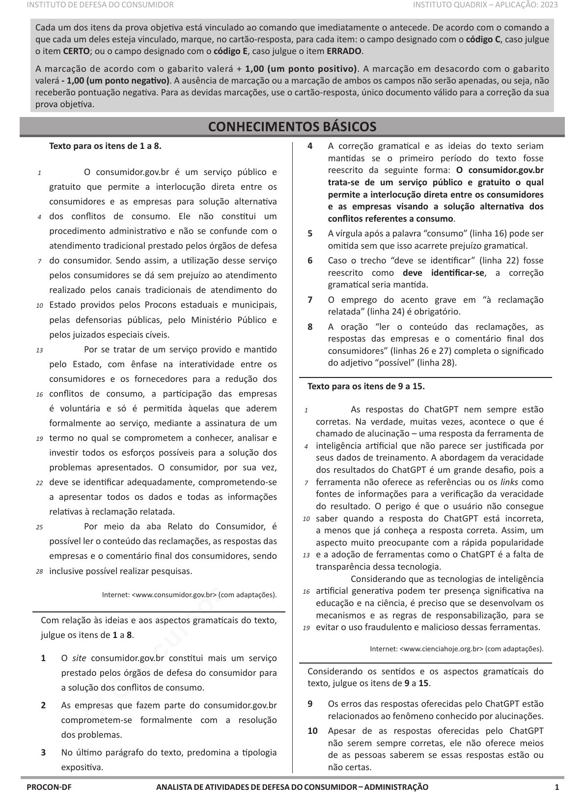 pcimarkpci MDAwMDowMDAwOjAwMDA6MDAwMDowMDAwOmZmZmY6OTU0ZTpiOTcw:VGh1LCAxOSBKdW4gMjAyNSAxMDo1NzowMCAtMDMwMA== www.pciconcursos.com.br ANALISTA DE ATIVIDADES DE DEFESA DO CONSUMIDOR – ADMINISTRAÇÃOPROCON-DF INSTITUTO DE DEFESA DO CONSUMIDOR INSTITUTO QUADRIX – APLICAÇÃO: 2023 1 Cada um dos itens da prova objetiva está vinculado ao comando que imediatamente o antecede. De acordo com o comando a que cada um deles esteja vinculado, marque, no cartão-resposta, para cada item: o campo designado com o código C, caso julgue o item CERTO; ou o campo designado com o código E, caso julgue o item ERRADO. A marcação de acordo com o gabarito valerá + 1,00 (um ponto positivo). A marcação em desacordo com o gabarito valerá - 1,00 (um ponto negativo). A ausência de marcação ou a marcação de ambos os campos não serão apenadas, ou seja, não receberão pontuação negativa. Para as devidas marcações, use o cartão-resposta, único documento válido para a correção da sua prova objetiva. CONHECIMENTOS BÁSICOS Texto para os itens de 1 a 8. O consumidor.gov.br é um serviço público e gratuito que permite a interlocução direta entre os consumidores e as empresas para solução alternativa dos conflitos de consumo. Ele não constitui um procedimento administrativo e não se confunde com o atendimento tradicional prestado pelos órgãos de defesa do consumidor. Sendo assim, a utilização desse serviço pelos consumidores se dá sem prejuízo ao atendimento realizado pelos canais tradicionais de atendimento do Estado providos pelos Procons estaduais e municipais, pelas defensorias públicas, pelo Ministério Público e pelos juizados especiais cíveis. Por se tratar de um serviço provido e mantido pelo Estado, com ênfase na interatividade entre os consumidores e os fornecedores para a redução dos conflitos de consumo, a participação das empresas é voluntária e só é permitida àquelas que aderem formalmente ao serviço, mediante a assinatura de um termo no qual se comprometem a conhecer, analisar e investir todos os esforços possíveis para a solução dos problemas apresentados. O consumidor, por sua vez, deve se identificar adequadamente, comprometendo‑se a apresentar todos os dados e todas as informações relativas à reclamação relatada. Por meio da aba Relato do Consumidor, é possível ler o conteúdo das reclamações, as respostas das empresas e o comentário final dos consumidores, sendo inclusive possível realizar pesquisas. Internet: (com adaptações). Com relação às ideias e aos aspectos gramaticais do texto, julgue os itens de 1 a 8. 1 O site consumidor.gov.br constitui mais um serviço prestado pelos órgãos de defesa do consumidor para a solução dos conflitos de consumo. 2 As empresas que fazem parte do consumidor.gov.br comprometem‑se formalmente com a resolução dos problemas. 3 No último parágrafo do texto, predomina a tipologia expositiva. 4 A correção gramatical e as ideias do texto seriam mantidas se o primeiro período do texto fosse reescrito da seguinte forma: O consumidor.gov.br trata‑se de um serviço público e gratuito o qual permite a interlocução direta entre os consumidores e as empresas visando a solução alternativa dos conflitos referentes a consumo. 5 A vírgula após a palavra “consumo” (linha 16) pode ser omitida sem que isso acarrete prejuízo gramatical. 6 Caso o trecho “deve se identificar” (linha 22) fosse reescrito como deve identificar‑se, a correção gramatical seria mantida. 7 O emprego do acento grave em “à reclamação relatada” (linha 24) é obrigatório. 8 A oração “ler o conteúdo das reclamações, as respostas das empresas e o comentário final dos consumidores” (linhas 26 e 27) completa o significado do adjetivo “possível” (linha 28). Texto para os itens de 9 a 15. As respostas do ChatGPT nem sempre estão corretas. Na verdade, muitas vezes, acontece o que é chamado de alucinação – uma resposta da ferramenta de inteligência artificial que não parece ser justificada por seus dados de treinamento. A abordagem da veracidade dos resultados do ChatGPT é um grande desafio, pois a ferramenta não oferece as referências ou os links como fontes de informações para a verificação da veracidade do resultado. O perigo é que o usuário não consegue saber quando a resposta do ChatGPT está incorreta, a menos que já conheça a resposta correta. Assim, um aspecto muito preocupante com a rápida popularidade e a adoção de ferramentas como o ChatGPT é a falta de transparência dessa tecnologia. Considerando que as tecnologias de inteligência artificial generativa podem ter presença significativa na educação e na ciência, é preciso que se desenvolvam os mecanismos e as regras de responsabilização, para se evitar o uso fraudulento e malicioso dessas ferramentas. Internet: (com adaptações). Considerando os sentidos e os aspectos gramaticais do texto, julgue os itens de 9 a 15. 9 Os erros das respostas oferecidas pelo ChatGPT estão relacionados ao fenômeno conhecido por alucinações. 10 Apesar de as respostas oferecidas pelo ChatGPT não serem sempre corretas, ele não oferece meios de as pessoas saberem se essas respostas estão ou não certas. 1 4 7 10 13 16 19 22 25 28 1 4 7 10 13 16 19 pcimarkpci MDAwMDowMDAwOjAwMDA6MDAwMDowMDAwOmZmZmY6OTU0ZTpiOTcw:VGh1LCAxOSBKdW4gMjAyNSAxMDo1NzowMCAtMDMwMA== www.pciconcursos.com.br ANALISTA DE ATIVIDADES DE DEFESA DO CONSUMIDOR – ADMINISTRAÇÃOPROCON-DF INSTITUTO DE DEFESA DO CONSUMIDOR INSTITUTO QUADRIX – APLICAÇÃO: 2023 2 11 As palavras “muitas” (linha 2) e “muito” (linha 12) pertencem à mesma categoria gramatical. 12 O termo “por seus dados de treinamento” (linhas 4 e 5) funciona como agente da passiva. 13 O termo ChatGPT é retomado ao longo do texto pelas expressões anafóricas “a ferramenta” (linhas 6 e 7) e “dessa tecnologia” (linha 14). 14 As palavras “incorreta” (linha 10) e “