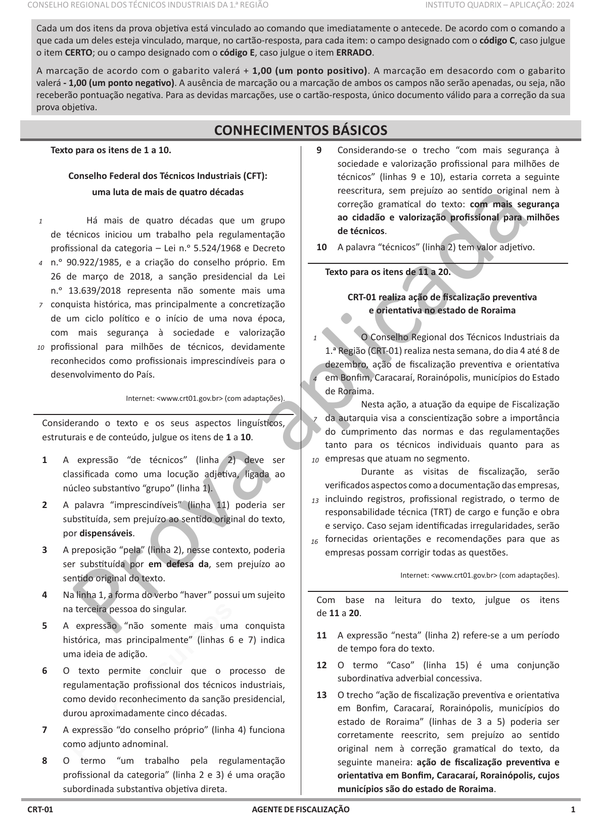 pcimarkpci MDAwMDowMDAwOjAwMDA6MDAwMDowMDAwOmZmZmY6OTU0ZTpiOTcw:VGh1LCAxOSBKdW4gMjAyNSAwOTo1MTowOSAtMDMwMA== www.pciconcursos.com.br Prova ap lica da AGENTE DE FISCALIZAÇÃOCRT-01 CONSELHO REGIONAL DOS TÉCNICOS INDUSTRIAIS DA 1.a REGIÃO INSTITUTO QUADRIX – APLICAÇÃO: 2024 1 Cada um dos itens da prova objetiva está vinculado ao comando que imediatamente o antecede. De acordo com o comando a que cada um deles esteja vinculado, marque, no cartão-resposta, para cada item: o campo designado com o código C, caso julgue o item CERTO; ou o campo designado com o código E, caso julgue o item ERRADO. A marcação de acordo com o gabarito valerá + 1,00 (um ponto positivo). A marcação em desacordo com o gabarito valerá - 1,00 (um ponto negativo). A ausência de marcação ou a marcação de ambos os campos não serão apenadas, ou seja, não receberão pontuação negativa. Para as devidas marcações, use o cartão-resposta, único documento válido para a correção da sua prova objetiva. CONHECIMENTOS BÁSICOS 9 Considerando‑se o trecho “com mais segurança à sociedade e valorização profissional para milhões de técnicos” (linhas 9 e 10), estaria correta a seguinte reescritura, sem prejuízo ao sentido original nem à correção gramatical do texto: com mais segurança ao cidadão e valorização profissional para milhões de técnicos. 10 A palavra “técnicos” (linha 2) tem valor adjetivo. Texto para os itens de 11 a 20. CRT‑01 realiza ação de fiscalização preventiva e orientativa no estado de Roraima O Conselho Regional dos Técnicos Industriais da 1.a Região (CRT‑01) realiza nesta semana, do dia 4 até 8 de dezembro, ação de fiscalização preventiva e orientativa em Bonfim, Caracaraí, Rorainópolis, municípios do Estado de Roraima. Nesta ação, a atuação da equipe de Fiscalização da autarquia visa a conscientização sobre a importância do cumprimento das normas e das regulamentações tanto para os técnicos individuais quanto para as empresas que atuam no segmento. Durante as visitas de fiscalização, serão verificados aspectos como a documentação das empresas, incluindo registros, profissional registrado, o termo de responsabilidade técnica (TRT) de cargo e função e obra e serviço. Caso sejam identificadas irregularidades, serão fornecidas orientações e recomendações para que as empresas possam corrigir todas as questões. Internet: (com adaptações). Com base na leitura do texto, julgue os itens de 11 a 20. 11 A expressão “nesta” (linha 2) refere‑se a um período de tempo fora do texto. 12 O termo “Caso” (linha 15) é uma conjunção subordinativa adverbial concessiva. 13 O trecho “ação de fiscalização preventiva e orientativa em Bonfim, Caracaraí, Rorainópolis, municípios do estado de Roraima” (linhas de 3 a 5) poderia ser corretamente reescrito, sem prejuízo ao sentido original nem à correção gramatical do texto, da seguinte maneira: ação de fiscalização preventiva e orientativa em Bonfim, Caracaraí, Rorainópolis, cujos municípios são do estado de Roraima. Texto para os itens de 1 a 10. Conselho Federal dos Técnicos Industriais (CFT): uma luta de mais de quatro décadas Há mais de quatro décadas que um grupo de técnicos iniciou um trabalho pela regulamentação profissional da categoria – Lei n.o 5.524/1968 e Decreto n.o 90.922/1985, e a criação do conselho próprio. Em 26 de março de 2018, a sanção presidencial da Lei n.o 13.639/2018 representa não somente mais uma conquista histórica, mas principalmente a concretização de um ciclo político e o início de uma nova época, com mais segurança à sociedade e valorização profissional para milhões de técnicos, devidamente reconhecidos como profissionais imprescindíveis para o desenvolvimento do País. Internet: (com adaptações). Considerando o texto e os seus aspectos linguísticos, estruturais e de conteúdo, julgue os itens de 1 a 10. 1 A expressão “de técnicos” (linha 2) deve ser classificada como uma locução adjetiva, ligada ao núcleo substantivo “grupo” (linha 1). 2 A palavra “imprescindíveis” (linha 11) poderia ser substituída, sem prejuízo ao sentido original do texto, por dispensáveis. 3 A preposição “pela” (linha 2), nesse contexto, poderia ser substituída por em defesa da, sem prejuízo ao sentido original do texto. 4 Na linha 1, a forma do verbo “haver” possui um sujeito na terceira pessoa do singular. 5 A expressão “não somente mais uma conquista histórica, mas principalmente” (linhas 6 e 7) indica uma ideia de adição. 6 O texto permite concluir que o processo de regulamentação profissional dos técnicos industriais, como devido reconhecimento da sanção presidencial, durou aproximadamente cinco décadas. 7 A expressão “do conselho próprio” (linha 4) funciona como adjunto adnominal. 8 O termo “um trabalho pela regulamentação profissional da categoria” (linha 2 e 3) é uma oração subordinada substantiva objetiva direta. 1 4 7 10 1 4 7 10 13 16 pcimarkpci MDAwMDowMDAwOjAwMDA6MDAwMDowMDAwOmZmZmY6OTU0ZTpiOTcw:VGh1LCAxOSBKdW4gMjAyNSAwOTo1MTowOSAtMDMwMA== www.pciconcursos.com.br Prova ap lica da AGENTE DE FISCALIZAÇÃOCRT-01 CONSELHO REGIONAL DOS TÉCNICOS INDUSTRIAIS DA 1.a REGIÃO INSTITUTO QUADRIX – APLICAÇÃO: 2024 2 14 O trecho “Caso sejam identificadas irregularidades, serão fornecidas orientações e recomendações para que as empresas possam corrigir todas as questões” (linhas de 15 a 17) apresenta ecos, que são repetições sonoras desagradáveis e, para corrigir esse problema, uma reescritura possível seria: Caso sejam identificadas irregularidades, orientará as empresas e fará recomendações, para que elas possam corrigir todos os problemas. 15 No trecho “Durante as visitas de fiscalização, serão verificados aspectos como a documentação das empresas” (linhas 11 e 12), há uma locução verbal com verbo principal no futuro e n