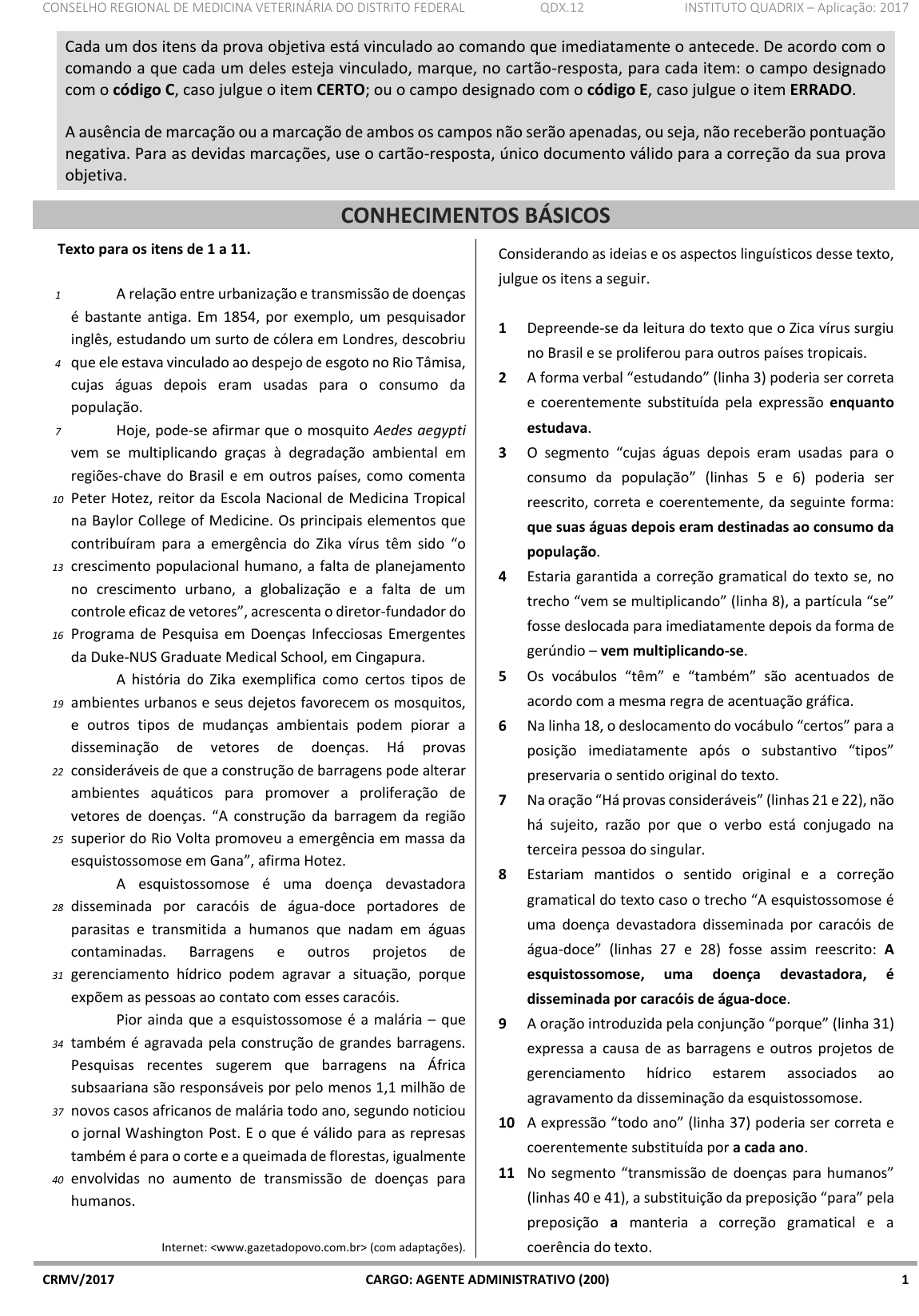 pcimarkpci MDAwMDowMDAwOjAwMDA6MDAwMDowMDAwOmZmZmY6OTU0ZTpiOTcw:VGh1LCAxOSBKdW4gMjAyNSAwOTo0Njo0NiAtMDMwMA== www.pciconcursos.com.br CONSELHO REGIONAL DE MEDICINA VETERINÁRIA DO DISTRITO FEDERAL QDX.12 INSTITUTO QUADRIX – Aplicação: 2017 CRMV/2017 CARGO: AGENTE ADMINISTRATIVO (200) 1 Cada um dos itens da prova objetiva está vinculado ao comando que imediatamente o antecede. De acordo com o comando a que cada um deles esteja vinculado, marque, no cartão-resposta, para cada item: o campo designado com o código C, caso julgue o item CERTO; ou o campo designado com o código E, caso julgue o item ERRADO. A ausência de marcação ou a marcação de ambos os campos não serão apenadas, ou seja, não receberão pontuação negativa. Para as devidas marcações, use o cartão-resposta, único documento válido para a correção da sua prova objetiva. CONHECIMENTOS BÁSICOS Texto para os itens de 1 a 11. 1 4 7 10 13 16 19 22 25 28 31 34 37 40 A relação entre urbanização e transmissão de doenças é bastante antiga. Em 1854, por exemplo, um pesquisador inglês, estudando um surto de cólera em Londres, descobriu que ele estava vinculado ao despejo de esgoto no Rio Tâmisa, cujas águas depois eram usadas para o consumo da população. Hoje, pode-se afirmar que o mosquito Aedes aegypti vem se multiplicando graças à degradação ambiental em regiões-chave do Brasil e em outros países, como comenta Peter Hotez, reitor da Escola Nacional de Medicina Tropical na Baylor College of Medicine. Os principais elementos que contribuíram para a emergência do Zika vírus têm sido “o crescimento populacional humano, a falta de planejamento no crescimento urbano, a globalização e a falta de um controle eficaz de vetores”, acrescenta o diretor-fundador do Programa de Pesquisa em Doenças Infecciosas Emergentes da Duke-NUS Graduate Medical School, em Cingapura. A história do Zika exemplifica como certos tipos de ambientes urbanos e seus dejetos favorecem os mosquitos, e outros tipos de mudanças ambientais podem piorar a disseminação de vetores de doenças. Há provas consideráveis de que a construção de barragens pode alterar ambientes aquáticos para promover a proliferação de vetores de doenças. “A construção da barragem da região superior do Rio Volta promoveu a emergência em massa da esquistossomose em Gana”, afirma Hotez. A esquistossomose é uma doença devastadora disseminada por caracóis de água-doce portadores de parasitas e transmitida a humanos que nadam em águas contaminadas. Barragens e outros projetos de gerenciamento hídrico podem agravar a situação, porque expõem as pessoas ao contato com esses caracóis. Pior ainda que a esquistossomose é a malária – que também é agravada pela construção de grandes barragens. Pesquisas recentes sugerem que barragens na África subsaariana são responsáveis por pelo menos 1,1 milhão de novos casos africanos de malária todo ano, segundo noticiou o jornal Washington Post. E o que é válido para as represas também é para o corte e a queimada de florestas, igualmente envolvidas no aumento de transmissão de doenças para humanos. Internet: (com adaptações). Considerando as ideias e os aspectos linguísticos desse texto, julgue os itens a seguir. 1 Depreende-se da leitura do texto que o Zica vírus surgiu no Brasil e se proliferou para outros países tropicais. 2 A forma verbal “estudando” (linha 3) poderia ser correta e coerentemente substituída pela expressão enquanto estudava. 3 O segmento “cujas águas depois eram usadas para o consumo da população” (linhas 5 e 6) poderia ser reescrito, correta e coerentemente, da seguinte forma: que suas águas depois eram destinadas ao consumo da população. 4 Estaria garantida a correção gramatical do texto se, no trecho “vem se multiplicando” (linha 8), a partícula “se” fosse deslocada para imediatamente depois da forma de gerúndio – vem multiplicando-se. 5 Os vocábulos “têm” e “também” são acentuados de acordo com a mesma regra de acentuação gráfica. 6 Na linha 18, o deslocamento do vocábulo “certos” para a posição imediatamente após o substantivo “tipos” preservaria o sentido original do texto. 7 Na oração “Há provas consideráveis” (linhas 21 e 22), não há sujeito, razão por que o verbo está conjugado na terceira pessoa do singular. 8 Estariam mantidos o sentido original e a correção gramatical do texto caso o trecho “A esquistossomose é uma doença devastadora disseminada por caracóis de água-doce” (linhas 27 e 28) fosse assim reescrito: A esquistossomose, uma doença devastadora, é disseminada por caracóis de água-doce. 9 A oração introduzida pela conjunção “porque” (linha 31) expressa a causa de as barragens e outros projetos de gerenciamento hídrico estarem associados ao agravamento da disseminação da esquistossomose. 10 A expressão “todo ano” (linha 37) poderia ser correta e coerentemente substituída por a cada ano. 11 No segmento “transmissão de doenças para humanos” (linhas 40 e 41), a substituição da preposição “para” pela preposição a manteria a correção gramatical e a coerência do texto. pcimarkpci MDAwMDowMDAwOjAwMDA6MDAwMDowMDAwOmZmZmY6OTU0ZTpiOTcw:VGh1LCAxOSBKdW4gMjAyNSAwOTo0Njo0NiAtMDMwMA== www.pciconcursos.com.br CONSELHO REGIONAL DE MEDICINA VETERINÁRIA DO DISTRITO FEDERAL QDX.12 INSTITUTO QUADRIX – Aplicação: 2017 CRMV/2017 CARGO: AGENTE ADMINISTRATIVO (200) 2 Texto para os itens de 12 a 18. 1 4 7 10 13 16 19 O modelo presente de desenvolvimento do mundo não é sustentável. Mudanças do clima, perda de diversidade ecológica e cultural, pobreza e desigualdade tendem a aumentar a vulnerabilidade da vida humana e dos ecossistemas do planeta. Necessitamos de uma melhor compreensão das interações complexas e dinâmicas entre sociedade e natureza. Pesquisas recentes nas áreas da biologia, astrofísica e computação evidencia