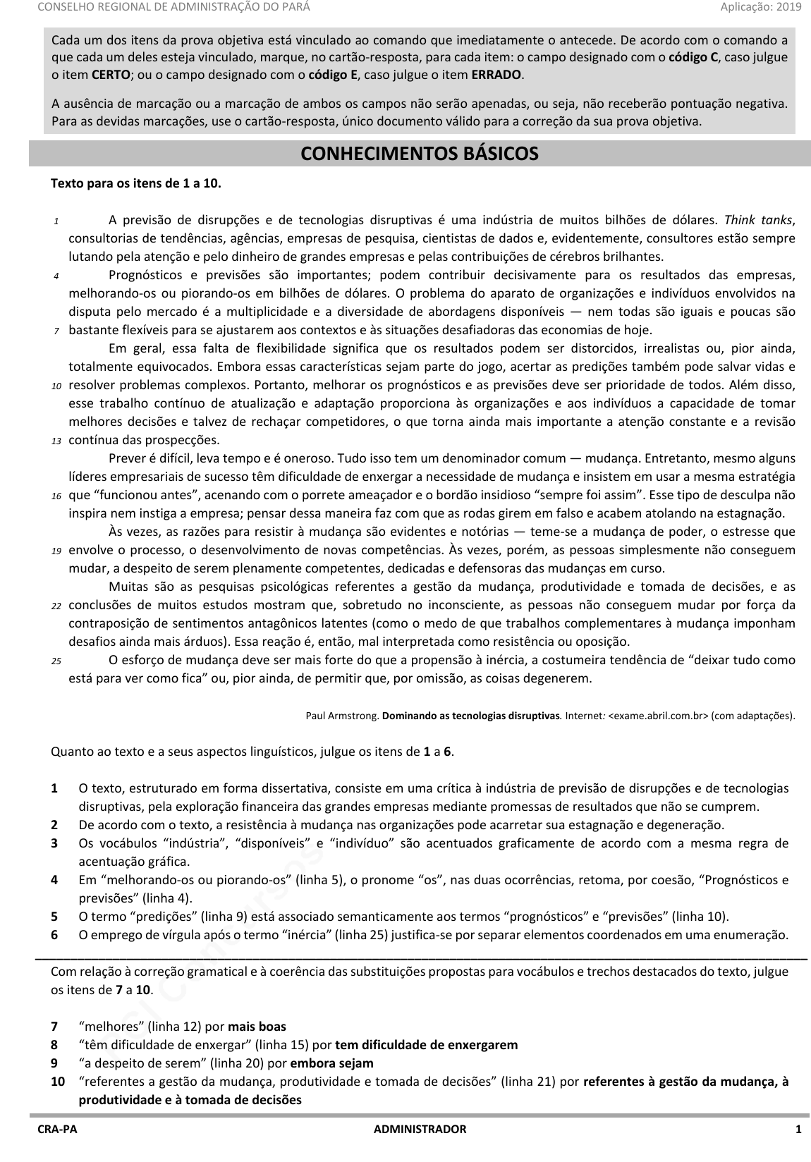 pcimarkpci MDAwMDowMDAwOjAwMDA6MDAwMDowMDAwOmZmZmY6OTU0ZTpiOTcw:VGh1LCAxOSBKdW4gMjAyNSAwOTozNjoxMCAtMDMwMA== www.pciconcursos.com.br CONSELHO REGIONAL DE ADMINISTRAÇÃO DO PARÁ Aplicação: 2019 CRA‐PA ADMINISTRADOR 1 Cada um dos itens da prova objetiva está vinculado ao comando que imediatamente o antecede. De acordo com o comando a que cada um deles esteja vinculado, marque, no cartão‐resposta, para cada item: o campo designado com o código C, caso julgue o item CERTO; ou o campo designado com o código E, caso julgue o item ERRADO. A ausência de marcação ou a marcação de ambos os campos não serão apenadas, ou seja, não receberão pontuação negativa. Para as devidas marcações, use o cartão‐resposta, único documento válido para a correção da sua prova objetiva. CONHECIMENTOS BÁSICOS Texto para os itens de 1 a 10. 1 4 7 10 13 16 19 22 25 A previsão de disrupções e de tecnologias disruptivas é uma indústria de muitos bilhões de dólares. Think tanks, consultorias de tendências, agências, empresas de pesquisa, cientistas de dados e, evidentemente, consultores estão sempre lutando pela atenção e pelo dinheiro de grandes empresas e pelas contribuições de cérebros brilhantes. Prognósticos e previsões são importantes; podem contribuir decisivamente para os resultados das empresas, melhorando‐os ou piorando‐os em bilhões de dólares. O problema do aparato de organizações e indivíduos envolvidos na disputa pelo mercado é a multiplicidade e a diversidade de abordagens disponíveis — nem todas são iguais e poucas são bastante flexíveis para se ajustarem aos contextos e às situações desafiadoras das economias de hoje. Em geral, essa falta de flexibilidade significa que os resultados podem ser distorcidos, irrealistas ou, pior ainda, totalmente equivocados. Embora essas características sejam parte do jogo, acertar as predições também pode salvar vidas e resolver problemas complexos. Portanto, melhorar os prognósticos e as previsões deve ser prioridade de todos. Além disso, esse trabalho contínuo de atualização e adaptação proporciona às organizações e aos indivíduos a capacidade de tomar melhores decisões e talvez de rechaçar competidores, o que torna ainda mais importante a atenção constante e a revisão contínua das prospecções. Prever é difícil, leva tempo e é oneroso. Tudo isso tem um denominador comum — mudança. Entretanto, mesmo alguns líderes empresariais de sucesso têm dificuldade de enxergar a necessidade de mudança e insistem em usar a mesma estratégia que “funcionou antes”, acenando com o porrete ameaçador e o bordão insidioso “sempre foi assim”. Esse tipo de desculpa não inspira nem instiga a empresa; pensar dessa maneira faz com que as rodas girem em falso e acabem atolando na estagnação. Às vezes, as razões para resistir à mudança são evidentes e notórias — teme‐se a mudança de poder, o estresse que envolve o processo, o desenvolvimento de novas competências. Às vezes, porém, as pessoas simplesmente não conseguem mudar, a despeito de serem plenamente competentes, dedicadas e defensoras das mudanças em curso. Muitas são as pesquisas psicológicas referentes a gestão da mudança, produtividade e tomada de decisões, e as conclusões de muitos estudos mostram que, sobretudo no inconsciente, as pessoas não conseguem mudar por força da contraposição de sentimentos antagônicos latentes (como o medo de que trabalhos complementares à mudança imponham desafios ainda mais árduos). Essa reação é, então, mal interpretada como resistência ou oposição. O esforço de mudança deve ser mais forte do que a propensão à inércia, a costumeira tendência de “deixar tudo como está para ver como fica” ou, pior ainda, de permitir que, por omissão, as coisas degenerem. Paul Armstrong. Dominando as tecnologias disruptivas. Internet: (com adaptações). Quanto ao texto e a seus aspectos linguísticos, julgue os itens de 1 a 6. 1 O texto, estruturado em forma dissertativa, consiste em uma crítica à indústria de previsão de disrupções e de tecnologias disruptivas, pela exploração financeira das grandes empresas mediante promessas de resultados que não se cumprem. 2 De acordo com o texto, a resistência à mudança nas organizações pode acarretar sua estagnação e degeneração. 3 Os vocábulos “indústria”, “disponíveis” e “indivíduo” são acentuados graficamente de acordo com a mesma regra de acentuação gráfica. 4 Em “melhorando‐os ou piorando‐os” (linha 5), o pronome “os”, nas duas ocorrências, retoma, por coesão, “Prognósticos e previsões” (linha 4). 5 O termo “predições” (linha 9) está associado semanticamente aos termos “prognósticos” e “previsões” (linha 10). 6 O emprego de vírgula após o termo “inércia” (linha 25) justifica‐se por separar elementos coordenados em uma enumeração. ______________________________________________________________________________________________________________ Com relação à correção gramatical e à coerência das substituições propostas para vocábulos e trechos destacados do texto, julgue os itens de 7 a 10. 7 “melhores” (linha 12) por mais boas 8 “têm dificuldade de enxergar” (linha 15) por tem dificuldade de enxergarem 9 “a despeito de serem” (linha 20) por embora sejam 10 “referentes a gestão da mudança, produtividade e tomada de decisões” (linha 21) por referentes à gestão da mudança, à produtividade e à tomada de decisões pcimarkpci MDAwMDowMDAwOjAwMDA6MDAwMDowMDAwOmZmZmY6OTU0ZTpiOTcw:VGh1LCAxOSBKdW4gMjAyNSAwOTozNjoxMCAtMDMwMA== www.pciconcursos.com.br CONSELHO REGIONAL DE ADMINISTRAÇÃO DO PARÁ Aplicação: 2019 CRA‐PA ADMINISTRADOR 2 Julgue os itens 11 e 12, considerando a correção gramatical dos trechos apresentados e a adequação da linguagem à correspondência oficial. 11 Solicito que seja encaminhado a e