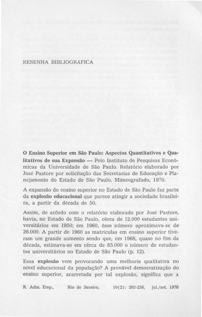 RESENHA BIBLIOGRÁFICA O Ensino Superior em São Paulo: Aspectos Quantitativos e Qua litativos de sua Expansão - Pelo Instituto de Pesquisas Econô micas da Universidade de São Paulo. Relatório elaborado por José Pastare por solicitação d.as Secretarias de Educação e Pla nejamento do Estado de São Paulo. Mimeografado, 1970. A expansão do ensino superior no Estado de São Paulo faz parte da explosão educacional que parece atingir a sociedade brasilei ra, a partir da década de 50. Assim, de acôrdo com o relatório elaborado por José Pastare, havia, no Estado de São Paulo, cêrca de 12.000 estudantes uni versitários em 1950; em 1960, êsse número aproximava-se de 26.000. A partir de 1960 as matrículas em ensino superior tive ram um grande aumento sendo que, em 1968, quase no fim da década, estimava-se em cêrca de 85.000 o número de estudan tes universitários no Estado de São Paulo (p. 12). Essa explosão vem provocando uma melhoria qualitativa no nível educacional da população? A provável democratização do ensino superior, acarretada por tal explosão, significa que a R. Adm. Emp., Rio de Janeiro, 10(2): 203-236, jul./set. 1970 educação vem-se colocando mais e mais à disposição do indi víduo e da comunidade? A leitura do relatório de Pastore deixa a clara impressão de que a resposta a essas perguntas é não. Aquêles que lutarem na so ciedade brasileira pela expansão e democratização do ensino, com a esperança de que isso promovesse a melhoria da qualida de de vida da população, puderam, muito bem, ter tido uma vitória de Pirro ou, como queiram os políticos do velho PSD mineiro, "ganharam mas não levaram". O relatório de Pastore divide-se em três partes principais. Na primeira, o autor examina a evolução do ensino superior em São Paulo. A segunda parte é dedicada ao exame da quantidade e qualidade do ensino superior. Para tanto, Pastore analisa a situação das engenharias, das ciências, da saúde, da economia e administração, das faculdades de filosofia, das faculdades de direito, das escolas de serviço social, das artes e comunica ções e, finalmente, da pós-graduação. A terceira parte é dedi cada à distribuição geográfica do ensino superior no Estado de São Paulo. O relatório de Pastore possui a grande virtude de combinar a descrição cuidadosa da realidade com um texto interpretativo. Tome-se, por exemplo, o caso da economia e administração, que deve interessar mais de perto aos leitores desta revista. tsses cursos contavam, em 1968, com 12.967 estudantes ou 15,2% da população total de alunos de nível superior, em São Paulo. Os cursos eram caracteristicamente masculinos desde que 95% dos alunos eram homens. Um outro traço característico dêsse ramo era o de ser noturno pois 81% dos estudantes freqüenta vam escolas noturnas. Cêrca de 70% das escolas de economia e administração têm menos de 18 anos. A ampliação de matrí culas nesses cursos foi simplesmente espetacular no período 1940-1968. Em 1940 havia apenas 70 alunos matriculados na 1'-' série dêsses cursos; em 1968, êsse montante elevou-se a 5. 654. De 1965 a 1968 o incremento de matrículas foi de 130%! (p. 102). Examinando essa situação, Pastore afirma que o crescimento desproporcional dos cursos dêsse ramo é injustificado do ponto 204 Revista de Administração de Emprêsas de vista econômico; considerando-se simplesmente o incremen to de 1965 para 1968 é fácil imaginar que tais cursos estão oferecendo um excedente profissional fantástico, que tende a se agravar, considerando que as escolas dêsse setor demonstram franca disposição de ampliação de matrícula (p. 103). A simples expansão, que visa a um excedente de profissionais no mercado, não reflete, entretanto, a qualidade do ensino, se bem que não se possa esperar muito de um ramo educacional superior que funciona, pràticamente, à noite. Mas, o relatório de Pastare não termina aí. Afirma êle que a pobreza das bibliotecas das escolas de eco nomia e administração é um fato alarmante. Embora tôdas elas tenham indicado existência de biblioteca, a observação revelou que na maioria dos casos as escolas têm simplesmente um de pósito de livros, em geral poucos e inadequados. Há quatro es colas, que possuem menos de 1.000 livros e 10 que se localizam entre 1.000 e 5.000 volumes. Portanto, quase 50% das escolas têm bibliotecas com um número médio de 2.000 volumes, em sua maioria antiquados e documentos governamentais de dis tribuição gratuita e automática (p. 109). O corpo docente nessas escolas é bastante flutuante. Em 70% das escolas, os professôres são todos contratados por aula e com níveis de remuneração baixíssimos. Há 5 escolas (17%) que remuneram seus professôres na base de Cr$ 5,00 a Cr$ 10,00 por aula; 9 (30%) pagam entre Cr$ 10,00 e Cr$ 15,00; outras de claram pagar entre Cr$ 16,00 e Cr$ 20,00. Apenas 18% dos professôres são de tempo integral (p. 111). Nessas condições, o ensino de economia e administração é uma verdadeira fraude. ~le não existe. A pesquisa científica, então, é inexistente até mesmo nas melhores escolas do ramo. Mas os bacharéis em economia e administração estão aí. São êles que irão gerir as emprê~as particulares e públicas do Brasil. São êles que irão planejar a nossa economia e as nossas reformas administrativas. O Govêrno, cedendo à pressão dos excedentes, recompensa as escolas que expandem suas matrículas de ano para ano. O re- Julho/Setembro 1970 205 sultado é um verdadeiro círculo vicioso, que só o Govêrno será capaz de romper. O relatório de Pastare está aí. Êle é um retrato fiel da nossa pobre realidade educacional. Como irá reagir o Govêrno? MANOEL TOSTA BERLINCK The Social Psychology of Organizations - Por Katz e Kahn, John Wiley and Sons, Inc. Nova Iorque, 1966, 498 páginas. Os nomes de Daniel Katz e Robert L. Kahn já seriam suficientes para recomendar um livro. O público