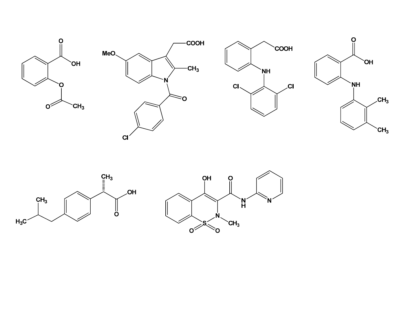 Ác. acetilsalicílico indometacina diclofenaco Ác. mefenâmico ibuprofeno piroxicam COOHfosfolipídeos de membrana celular fosfolipase ácido araquidônico ciclooxigenase (prostaglandina endoperóxido sintase) COOH PGG2 O O OOH COOHCOOH O O OHPGH2 OH COOH HO O PG endoperóxido isomerase PGE2 OH COOH HO HO PGF2α PG endoperóxido redutase OH COOH O HO Glutationa S-transferase PGD2 INIBIDORES SELETIVOS DE COX2 N N S H2N O O H3C CF3 O S H3C O O H3C O O NO2 N H S H3C O O NH H3C COOH ClF Celecoxibe (Celebra®) Rofecoxibe (Vioxx®) nimesulide Lumiracoxibe (Prexige®) N O S N H O O CH3 O N O S H2N O O CH3 N N Cl S OO H3C Parecoxibe (Dynastat®, Bextra IM/IV®) Valdecoxibe (Bextra®) Etoricoxibe (Arcoxia®) InflamaçãoInflamação • A inflamação é uma resposta de proteção do organismo à uma agressão sofrida. • Entretanto, a inflamação pode ser potencialmente nociva à saúde do paciente, pois existem ocasiões em que ocorre a perda do controle homeostático na resposta, assumindo a inflamação um papel destrutivo, maléfico ao organismo – choque anafilático. • Entre as doenças debilitantes mais comuns que atingem os seres humanos, a artrite acomete mais de 200 milhões de pessoas no mundo todo. Anti-inflamatórios / HistóricoAnti-inflamatórios / Histórico • 1763: na Inglaterra, o reverendo Edmund Stone publica os efeitos benéficos dos extratos da casca do salgueiro no alivio de dores em geral e redução da febre. • 1875: Felix Hoffman, da Bayer Company, sintetizou o ácido acetilsalicílico - tentativa de diminuir os efeitos irritantes da mucosa • 1763: na Inglaterra, o reverendo Edmund Stone publica os efeitos benéficos dos extratos da casca do salgueiro no alivio de dores em geral e redução da febre. • 1875: Felix Hoffman, da Bayer Company, sintetizou o ácido acetilsalicílico - tentativa de diminuir os efeitos irritantes da mucosa Salix alba OH O de diminuir os efeitos irritantes da mucosa gástrica atribuídos ao ácido salicílico. • 1949 - fenilbutazona e 1963 – indometacina: fármacos com efeitos clínicos similares aos da aspirina levam farmacologistas e bioquímicos a procurar por um modo de ação comum a estes fármacos. de diminuir os efeitos irritantes da mucosa gástrica atribuídos ao ácido salicílico. • 1949 - fenilbutazona e 1963 – indometacina: fármacos com efeitos clínicos similares aos da aspirina levam farmacologistas e bioquímicos a procurar por um modo de ação comum a estes fármacos. OH O Glc salicina O O OH AAS N MeO COOH Me O Cl indometacina N N O O fenilbutazona HistóricoHistórico • 1969: Piper e Vane demonstraram pela primeira vez a associação entre a produção de prostaglandinas e as ações de fármacos tipo aspirina, conhecidas como fármacos anti- inflamatórios não-esteroidais (NSAIDs – nonsteroidal anti-inflammatory drugs). • 1971: J. R. Vane – Nature: publicou que o mecanismo de ação das AINEs (NSAIDs) envolvia a inibição da biossíntese de prostaglandinas. “INHIBITION OF PROSTAGLANDIN SYNTHESIS AS A MECHANISM OF ACTION FOR ASPIRIN-LIKE DRUGS” J. R. Vane • 1969: Piper e Vane demonstraram pela primeira vez a associação entre a produção de prostaglandinas e as ações de fármacos tipo aspirina, conhecidas como fármacos anti- inflamatórios não-esteroidais (NSAIDs – nonsteroidal anti-inflammatory drugs). • 1971: J. R. Vane – Nature: publicou que o mecanismo de ação das AINEs (NSAIDs) envolvia a inibição da biossíntese de prostaglandinas. “INHIBITION OF PROSTAGLANDIN SYNTHESIS AS A MECHANISM OF ACTION FOR ASPIRIN-LIKE DRUGS” J. R. Vane Nature-New Biology 1971, 231 (25), p. 232 times cited (ISI Web of Science): 6473 (24/08/2009) 6521 (07/06/2010) 6548 (17/11/2010) 6724 (07/06/2011) 6778 (05/06/2012) 6847 (05/06/2013) 7032 (08/06/2014) 7068 (31/05/2015) Nature-New Biology 1971, 231 (25), p. 232 times cited (ISI Web of Science): 6473 (24/08/2009) 6521 (07/06/2010) 6548 (17/11/2010) 6724 (07/06/2011) 6778 (05/06/2012) 6847 (05/06/2013) 7032 (08/06/2014) 7068 (31/05/2015) Sir John Robert Vane (1927 –2004) was an English pharmacologist who was instrumental in the understanding of how aspirin produces pain-relief and anti-inflammatory effects and his work led to new treatments for heart and blood vessel disease. He was awarded the Nobel Prize in Physiology or Medicine in 1982 along with Sune K. Bergström and Bengt I. Samuelsson for "their discoveries concerning prostaglandins and related biologically active substances” ANTI-INFLAMATÓRIOS NÃO ESTEROIDAISANTI-INFLAMATÓRIOS NÃO ESTEROIDAIS Ações dos fármacos: analgésica, anti-inflamatória, anti-pirética Protótipo: AAS O O OH Inflamação: • Lesão tecidual causa liberação de mediadores da inflamação (histamina, serotonina, prostaglandinas, etc); • Vasodilatação; • Aumento da permeabilidade vascular; • migração de leucócitos, quimiotaxia, fagocitose; • proliferação do tecido conectivo O COOH 13 8 Estrutura geral das prostaglandinas Anel ciclopentanoAnel ciclopentano Derivadas de ácidos graxos poli-insaturados (fosfolipídeos de membrana) Cadeia α OH 12 13 15 2020 átomos de C Cadeia β COOH OH 13 8 12 13 15 20 Nomenclatura (PGA-PGI): PGE - cetona em C-9; α-OH em C-11 PGF - α-OH em C-9 e C-11PGF - α-OH em C-9 e C-11 PGG e PGH - ciclo endoperóxidos na biossíntese de PGs números subscritos: número de ligações duplas nas cadeias laterais (PGG2) no 1 - ligação dupla trans entre C13-C14 no 2 - ligação dupla adicional cis entre C5-C6 no 3 - ligação dupla adicional cis entre C17-C18 COOHfosfolipídeos de membrana celular fosfolipase ácido araquidônico ciclooxigenase (prostaglandina endoperóxido sintase) COOH PGG2 O O OOH COOH Interleucina aumenta a atividade Alvo para AINS instáveis COOH O O OHPGH2 OH COOH HO O PG endoperóxido isomerase PGE2 OH COOH HO HO PGF2α PG endoperóxido redutase OH COOH O HO Glutationa S-transferase PGD2 PGs Injúria primária Devido ao caráter ácid