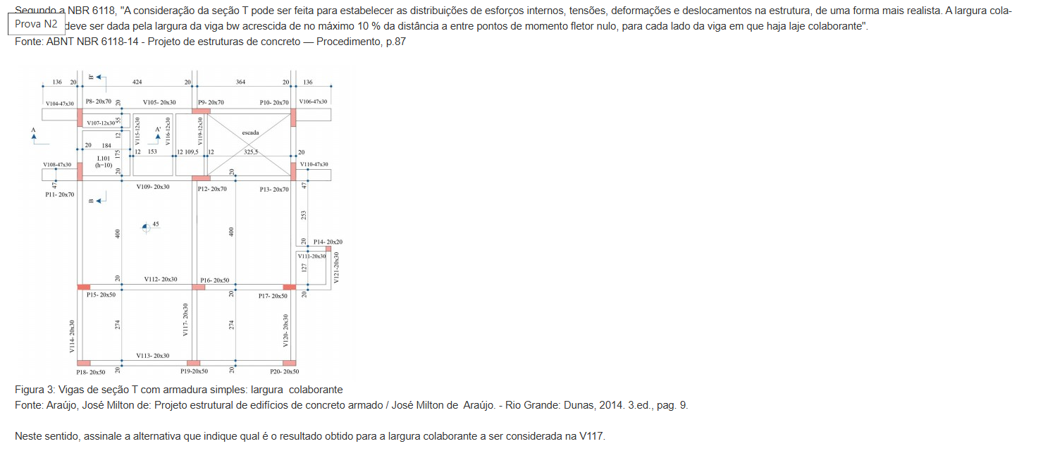 Segundo a NBR 6118, "A consideração da seção T pode ser feita para estabelecer as distribuições de esforços internos, tensões, deformações e deslocamentos na estrutura, de uma forma mais realista. A largura cola- Prova N2 deve ser dada pela largura da viga bw acrescida de no máximo 10% da distância a entre pontos de momento fletor nulo, para cada lado da viga em que haja laje colaborante". Fonte: ABNT NBR 6118-14 Projeto de estruturas de concreto Procedimento, p.87 B' 136 20 424 20 364 20 136 V104-47x30 P8-20x70 V105-20x30 P9-20x70 P10-20x70 V106-47x30 A V115-12x30 12 V116-12x30 V119-12x30 escada 20 184 175 12 153 12 325.5 20 L101 V108-47x30 (h-10) V110-47x30 20 47 V109-20x30 47 P12-20x70 P13-20x70 P11-20x70 253 45 400 400 P14-20x20 127 20 V121-20x30 V112-20x30 P16-20x50 P15-20x50 20 P17-20x50 20 20x30 274 20x30 V117-20x30 274 V120- 20x30 V120-20x30 V113-20x30 P18- 20x50 20 P19-20x50 20 P20-20x50 Figura 3: Vigas de seção T com armadura simples: largura colaborante Fonte: Araújo, José Milton de: Projeto estrutural de edifícios de concreto armado / José Milton de Araújo. Rio Grande: Dunas, 2014. 3.ed., pag. 9. Neste sentido, assinale a alternativa que indique qual é 0 resultado obtido para a largura colaborante a ser considerada na V117.