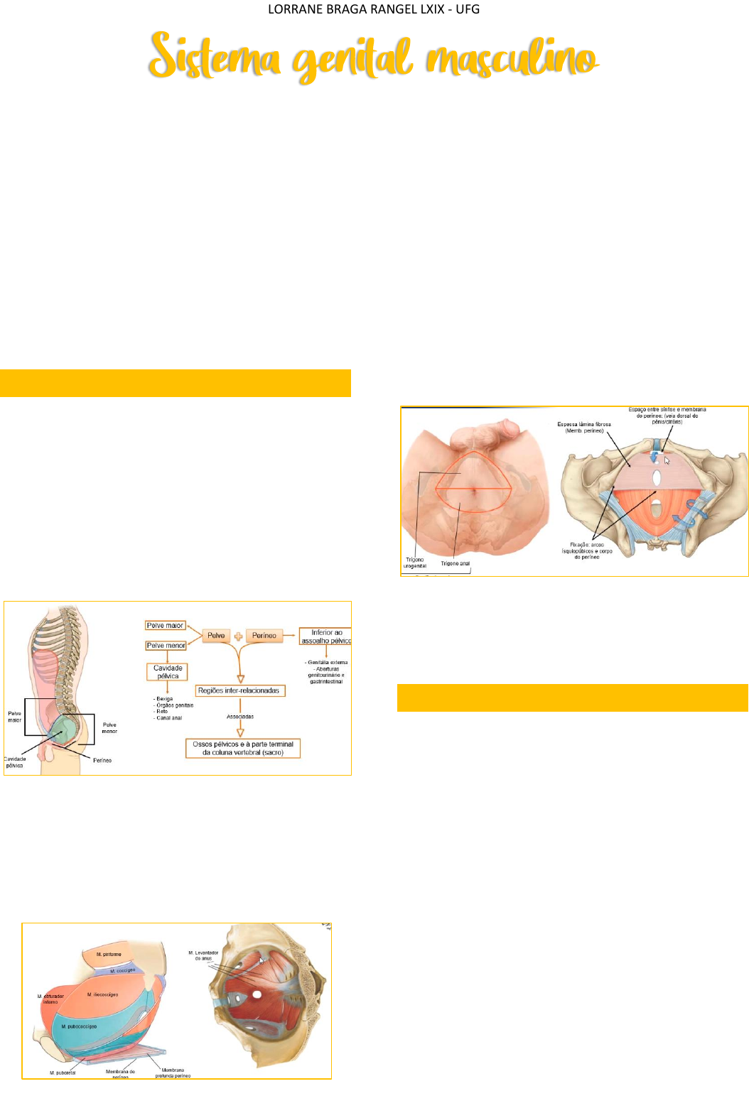 LORRANE BRAGA RANGEL LXIX - UFG Conjunto de órgãos responsáveis pela reprodução • Produção, condução e introdução dos espermatozoides nas vias genitais femininas • Produção de hormônios sexuais Órgãos do sistema: • Testículos: produz espermatozoides e hormônios • Ductos de transportes (epidídimo, ducto deferente, ejaculatórios e uretra) • Órgão copulador – pênis • Glândulas acessórias – próstata, vesículas seminais e glândulas bulbouretrais Pelve e períneo • Pelve maior: parte final da cavidade abdominal – começa na crista ilíaca até o púbis • Pelve menor: onde fica os órgãos genitais – vai do ísquio ate o sacro • O períneo fica inferior ao assoalho pélvico – contém a região anal e genital • Os ossos pélvicos formam a parede lateral e anterior da pelve e o sacro a parede posterior. Além disso, eles permitem a fixação dos músculos Músculo levantador do ânus – forma o assoalho pélvico • Iliococcigeo • Puboccigeo • Puborretal • Coccígeo e Piriforme • Hiato anal, abertura urogenital • O assoalho da pelve também pode ser chamado de diafragma da pelve Períneo • Vai do cóccix até o púbis inferiormente ao diafragma da pelve • Inclui o ânus e os órgãos genitais externos: pênis e escroto • O trígono urogenital tem uma membrana formada por tecido fibroso – membrana do períneo • O períneo é divido em duas regiões: urogenital e anal Músculo isquiocarvenoso: envolve o clitóris ou o ramo do pênis • Os músculos do períneo são inervados nervo pudendo Escroto • É a bolsa externa de pele e músculos, localizado entre o pênis e o ânus, inferior a sínfise púbica • Auxilia na manutenção adequada da pressão • Contém os testículos Compartimentos: • O septo do escroto o divide internamente em dois compartimentos • O escroto é uma bolsa ímpar separada em duas porções por uma crista mediana chamada de rafe do escroto Camadas do escroto 1- Pele pigmentada 2- Túnica dartos com músculo liso 3- Músculo cremáster – fibras do músculo oblíquo interno do abdome Funículo espermático – é sustentado pelo cremáster LORRANE BRAGA RANGEL LXIX - UFG Termorregulação dos testículos • Localização em uma bolsa cutânea pendulosa • Quando a temperatura está fria, os músculos cremaster e dartos se contraem • Ausência de gordura subcutânea • Presença de glândulas sudoríparas • Presença de músculos escrotais • Plexo pampiniforme → resfria o sangue que vem do corpo pela artéria testicular Testículos • Órgãos ovóides suspensos pelo funículo espermático no escroto • Testículo direito é mais superior Os testículos se desenvolvem perto dos rins, na parede posterior do abdome, e durante a segunda metade do sétimo mês de desenvolvimento eles começam a sua descida por meio dos canais inguinais. Ligamento gubernáculo → promove a decídua dos testículos ➔ O testículo arrasta consigo uma evaginação do peritônio → irá formar o processo vaginal, que se converterá em uma túnica vaginal Uma coleção de líquido seroso na túnica vaginal é chamada de hidrocele → lesões Estrutura interna ➔ Túnica albugínea: é uma cápsula fibrosa branca composta por tecido conjuntivo denso irregular que reveste os testículos interiormente à túnica vaginal ➔ Parênquima testicular ➔ Septos da túnica albugínea dividem o testículo em lóbulos ➔ Mediastino do testículo O parênquima testicular é todo tubular: • Túbulos seminíferos • Túbulos retos • Rede do testículo • Dúctulos eferentes Túbulos seminíferos • Produzem espermatozoides • Espermatogônias → na puberdade se diferenciam em espermatozoides • Células de sertoli → apoiam e protegem as células espermatogênicas • Células de Leydig → secretam testosterona Espermatogênese • Leva de 65 a 75 dias • Começa com espermatogônias (2n) → espermatócito primário (2n) • Os espermatócitos primários replicam seu DNA e entram na meiose I → crossing-over → espermatócitos secundários (n, com 23 cromossomos duplicados) LORRANE BRAGA RANGEL LXIX - UFG • Os espermatócitos secundários entram na meiose II e originam as espermátides A fase final da espermatogênese é a espermiogênese, que consiste no desenvolvimento de espermátides haploides em espermatozoides Espermatozoide Cabeça: contém o núcleo e o acrossomo (vesícula com proteases e a hialuronidase) • O colo: é a região imediatamente atrás da cabeça, que contém os centríolos Cauda • Peça intermediária: contém as mitocôndrias • Pela principal • Peça terminal Túnicas do testículo 1- Pele 2- Túnica dartos 3- Fáscia cremastérica 4- Músculo cremaster 5- Fáscia espermática interna 6- Lâmina parietal da túnica vaginal 7- Cavidade escrotal 8- Lâmina visceral da TV 9- Túnica albugínea Ductos • Os primeiros são os túbulos retos → rede do testículo → ductos eferentes → ducto do epidídimo Epidídimo • Localizado ao longo da margem posterior de cada testículo • Cabeça, corpo, caída • Revestidos por epitélio pseudoestratificado e circundado por músculo liso • Local de maturação dos espermatozoides → motilidade Ducto deferente • Ascende ao longo da margem posterior do epidídimo através do funículo espermático e depois entra na cavidade pélvica LORRANE BRAGA RANGEL LXIX - UFG • Contorna o ureter e passa lateralmente e desce pela face posterior da bexiga urinária • Parte terminal mais dilatada = ampola • Revestidos por epitélio pseudoestratificado e circundado por músculo liso em 3 camadas • Transporta os espermatozoides do epidídimo em direção à uretra Funículo espermático • É uma estrutura de suporte do sistema genital masculino que ascende a partir do escroto • Ducto deferente + artéria testicular + plexo pampiniforme + nervos + vasos linfáticos + cremaster • Atravessa o canal inguinal junto com o ner