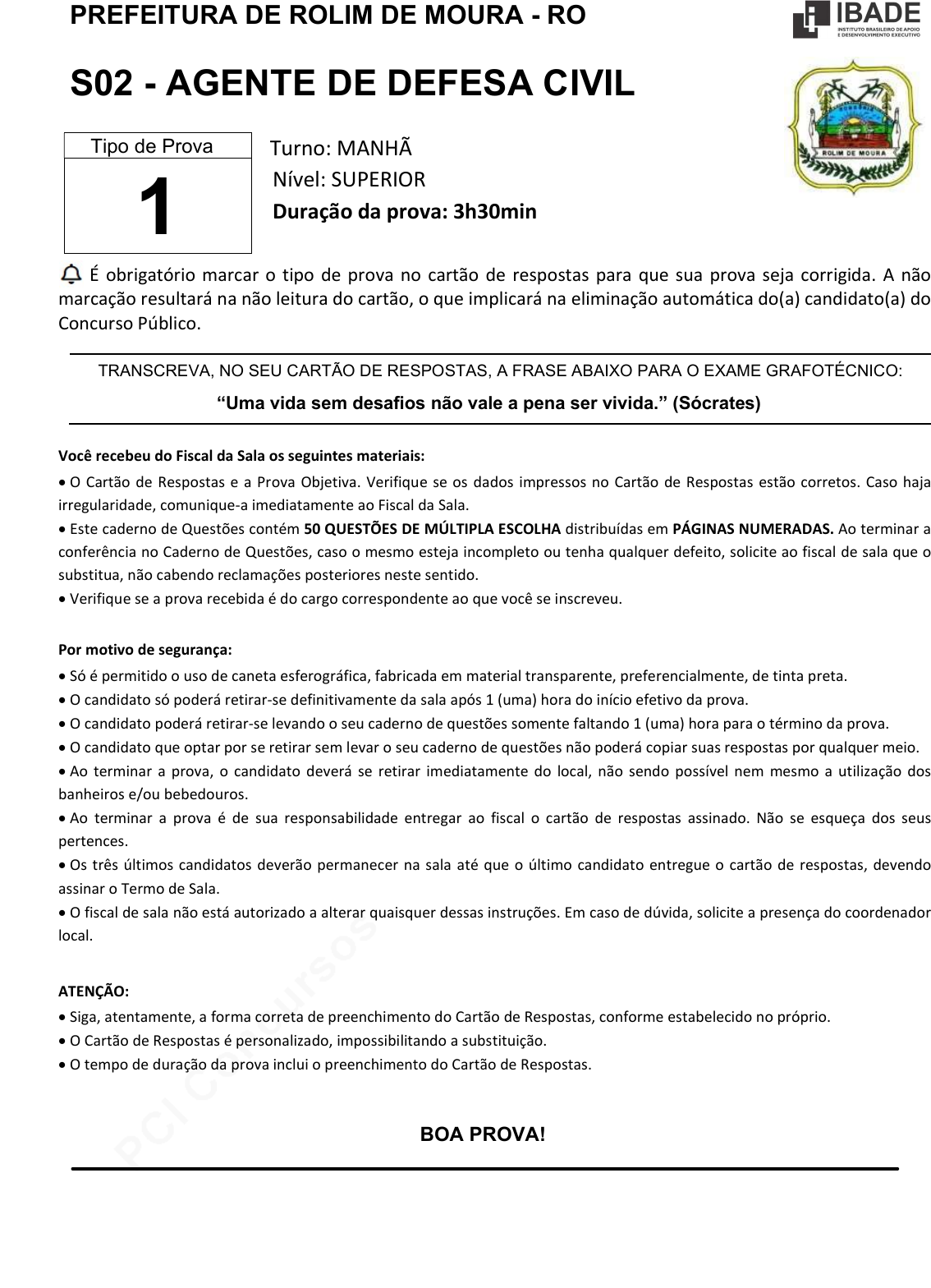 pcimarkpci MDAwMDowMDAwOjAwMDA6MDAwMDowMDAwOmZmZmY6YmZiYjo5OTlj:U2F0LCAyMSBKdW4gMjAyNSAxOTo1ODowNyAtMDMwMA== www.pciconcursos.com.br PREFEITURA DE ROLIM DE MOURA - RO S02 - AGENTE DE DEFESA CIVIL Turno: MANHÃ Nível: SUPERIOR Duração da prova: 3h30min É obrigatório marcar o tipo de prova no cartão de respostas para que sua prova seja corrigida. A não marcação resultará na não leitura do cartão, o que implicará na eliminação automática do(a) candidato(a) do Concurso Público. TRANSCREVA, NO SEU CARTÃO DE RESPOSTAS, A FRASE ABAIXO PARA O EXAME GRAFOTÉCNICO: “Uma vida sem desafios não vale a pena ser vivida.” (Sócrates) Você recebeu do Fiscal da Sala os seguintes materiais: O Cartão de Respostas e a Prova Objetiva. Verifique se os dados impressos no Cartão de Respostas estão corretos. Caso haja irregularidade, comunique-a imediatamente ao Fiscal da Sala. Este caderno de Questões contém 50 QUESTÕES DE MÚLTIPLA ESCOLHA distribuídas em PÁGINAS NUMERADAS. Ao terminar a conferência no Caderno de Questões, caso o mesmo esteja incompleto ou tenha qualquer defeito, solicite ao fiscal de sala que o substitua, não cabendo reclamações posteriores neste sentido. Verifique se a prova recebida é do cargo correspondente ao que você se inscreveu. Por motivo de segurança: Só é permitido o uso de caneta esferográfica, fabricada em material transparente, preferencialmente, de tinta preta. O candidato só poderá retirar-se definitivamente da sala após 1 (uma) hora do início efetivo da prova. O candidato poderá retirar-se levando o seu caderno de questões somente faltando 1 (uma) hora para o término da prova. O candidato que optar por se retirar sem levar o seu caderno de questões não poderá copiar suas respostas por qualquer meio. Ao terminar a prova, o candidato deverá se retirar imediatamente do local, não sendo possível nem mesmo a utilização dos banheiros e/ou bebedouros. Ao terminar a prova é de sua responsabilidade entregar ao fiscal o cartão de respostas assinado. Não se esqueça dos seus pertences. Os três últimos candidatos deverão permanecer na sala até que o último candidato entregue o cartão de respostas, devendo assinar o Termo de Sala. O fiscal de sala não está autorizado a alterar quaisquer dessas instruções. Em caso de dúvida, solicite a presença do coordenador local. ATENÇÃO: Siga, atentamente, a forma correta de preenchimento do Cartão de Respostas, conforme estabelecido no próprio. O Cartão de Respostas é personalizado, impossibilitando a substituição. O tempo de duração da prova inclui o preenchimento do Cartão de Respostas. BOA PROVA! Tipo de Prova 1 pcimarkpci MDAwMDowMDAwOjAwMDA6MDAwMDowMDAwOmZmZmY6YmZiYjo5OTlj:U2F0LCAyMSBKdW4gMjAyNSAxOTo1ODowNyAtMDMwMA== www.pciconcursos.com.br PREFEITURA DE ROLIM DE MOURA - RO IBADE AGENTE DE DEFESA CIVIL Tipo 1 – Página 2 LÍNGUA PORTUGUESA TEXTO I Explicar não é justificar Os gregos e os romanos aceitavam a escravidão porque não imaginavam que uma sociedade pudesse funcionar sem escravos. Como o filósofo Sêneca, insistiam apenas em que se reconhecessem alguns direitos aos escravos: que fosse, por exemplo, proibido utilizá-los com finalidades sexuais. Estamos na mesma posição quando se trata da pobreza. Estamos convencidos de que uma sociedade justa deve procurar erradicá-la. Mas, como não conseguimos conceber os meios que permitem atingir esse objetivo, aceitamos que uma sociedade comporte grandes bolsões de pobreza. Em contrapartida, não hesitamos em condenar a prática da escravidão. (Raymond Boudon, O relativismo. Trad. de Edson Bini. São Paulo: Loyola, 2010. p. 41) Questão 1 O texto I apresenta dois enfoques: (A) o dos gregos e o dos romanos. (B) o dos romanos e dos escravos. (C) o da escravidão e o da pobreza. (D) o dos romanos e dos escravos pobres. (E) o da escravidão e das finalidades sexuais. Questão 2 Pode-se afirmar, no texto I, que o autor faz uma comparação com o excerto: (A) “Os gregos e os romanos aceitavam a escravidão...”. (B) “Estamos na mesma posição quando se trata de pobreza”. (C) “... não hesitamos em condenar a prática da escravidão”. (D) “Estamos convencidos de que uma sociedade justa deve procurar erradicá-la”. (E) “... que fosse, por exemplo, proibido utilizá-los com finalidades sexuais.” Questão 3 No trecho “Os gregos e os romanos aceitavam a escravidão porque não imaginavam que uma sociedade pudesse funcionar sem escravos”, o termo em destaque é uma conjunção coordenativa: (A) conclusiva. (B) explicativa. (C) adversativa. (D) aditiva. (E) alternativa. Questão 4 Considerando as diretrizes da gramática normativa, faz sentido o seguinte comentário: (A) “Os gregos e os romanos aceitavam a escravidão...”. (O verbo concorda apenas com “romanos”) (B) “(...) que fosse, por exemplo, proibido...”. (As vírgulas podem ser suprimidas.) (C) “(...) alguns direitos aos escravos: que fosse...”. (Os dois pontos introduzem uma fala) (D) “(...) que fosse, por exemplo, proibido utilizá-los (...)”. (“utilizá-los” refere-se ao termo “direitos”) (E) “Mas, como não conseguimos conceber os meios...”. (“Mas” pode ser substituído por “Porém”) Questão 5 No texto I, o trecho “Estamos convencidos de que uma sociedade justa deve procurar erradicá-la.”, o termo destacado refere-se: (A) à pobreza. (B) à escravidão. (C) à sociedade. (D) a direitos. (E) a finalidades sexuais. Questão 6 As regras de concordância nominal são totalmente cumpridas na frase: (A) era novo o carro e a casa. (B) permaneciam simpáticas tia e sobrinho. (C) as milhares de crianças cantavam alegremente. (D) é proibido as entradas. (E) o caso foi bastante vezes estudado. pcimarkpci MDAwMDowMDAwOjAwMDA6MDAwMDowMDAwOmZmZmY6YmZiYjo5OTlj:U2F0LCAyMSBKdW4gMjAyNSAxOTo1ODowNyAtMDMwMA== www.pciconcursos.com.br PREFEITURA DE ROLIM DE MOURA - RO IBADE AGENTE DE DEFESA CIVIL Tipo 1 – Pág