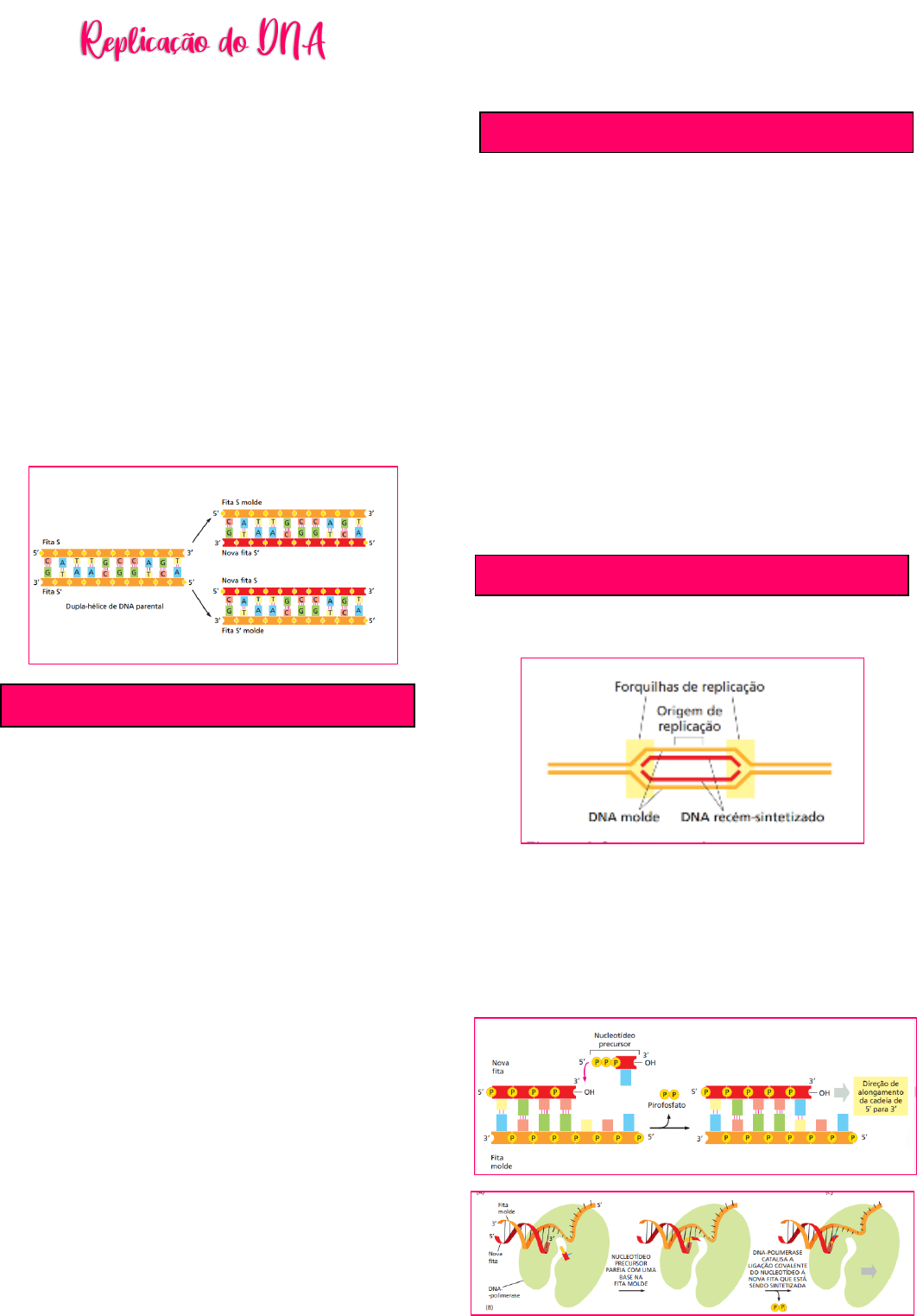 LORRANE BRAGA RANGEL LXIX - UFG • Cada fita de uma dupla-hélice de DNA contém uma sequência de nucleotídeos que é exatamente complementar à sequência de nucleotídeos da sua fita parceira. Cada fita, portanto, pode servir como um molde para a síntese de uma nova fita complementar. • A capacidade de cada fita de uma molécula de DNA de agir como um molde para produzir uma fita complementar possibilita à célula copiar, ou replicar, seus genes antes de passá-los para suas descendentes • A replicação do DNA produz duas duplas- hélices completas a partir da molécula de DNA original, com cada uma das novas hélices de DNA sendo idêntica em sequência nucleotídica à dupla-hélice de DNA original • O estilo de replicação é semiconservativo • A síntese de DNA inicia-se nas origens de replicação O processo de síntese de DNA é iniciado por proteínas iniciadoras que se ligam a sequências de DNA específicas denominadas origens de replicação • Proteínas inicializadoras afastam as duas fitas, quebrando as ligações de hidrogênio • Existem lugares do DNA com sítios de ligação para a proteína DnaA, chamados de sequências-consenso → região DUE → regiões com predominância de A-T, ou seja, pouco resistentes • A DnaA se liga nessas sequências → torções que provocam a abertura da fita na região DUE • A unidade de DNA na qual ocorre um evento individual de replicação é chamada replicon. Cada replicon é ativado uma vez, e somente uma vez, em cada ciclo celular. O replicon é definido por possuir os elementos de controle necessários à replicação. Ele possui uma origem na qual a replicação será iniciada e pode também conter uma região terminal, onde a replicação termina Em células simples, tais como bactérias ou leveduras, as origens de replicação compreendem aproximadamente 100 pares de nucleotídeos. Elas são compostas de sequências de DNA que atraem proteínas iniciadoras e são especialmente fáceis de serem abertas • DNA rico em A-T → origens de replicação Genoma bacteriano → única origem Genoma humano → múltiplas origens • Ao iniciar a replicação do DNA em muitos pontos diferentes de uma só vez, o tempo que uma célula necessita para copiar seu genoma inteiro é grandemente diminuído • São junções na forma de Y • Duas forquilhas são formadas em cada origem de replicação • Em cada forquilha, uma máquina de replicação move-se ao longo do DNA, abrindo as duas fitas da dupla-hélice e usando cada fita como um molde para produzir uma nova fita-filha • Replicação bidirecional DNA-polimerase: Essa enzima catalisa a adição de nucleotídeos à extremidade 3’ de uma fita de DNA em crescimento, usando uma das fitas de DNA parentais como um molde. Origens de replicação Forquilhas de replicação Maquinaria de replicação LORRANE BRAGA RANGEL LXIX - UFG • A reação de polimerização envolve a formação de uma ligação fosfodiéster entre a extremidade 3’ de uma cadeia de DNA crescente e o grupo 5’-fosfato do nucleotídeo a ser incorporado, que entra na reação como um trifosfato de desoxirribonucleosídeo. A energia para a polimerização é fornecida pelo próprio trifosfato de desoxirribonucleosídeo: a hidrólise de uma de suas ligações de fosfato de alta energia abastece a reação que acopla os monômeros de nucleotídeos à cadeia, liberando pirofosfato. A direção 5’-3’ da reação de polimerização do DNA cria um problema na forquilha de replicação • Fitas antiparalelas • Como consequência, em cada forquilha de replicação, uma nova fita de DNA está sendo produzida sobre um molde que segue em uma direção (3’ para 5’), enquanto a outra nova fita está sendo produzida em um molde que segue na direção oposta (5’ para 3’). A célula possuirá dois tipos de DNA-polimerase, um para cada direção? A resposta é não: todas as DNA- polimerases adicionam novas subunidades somente à extremidade 3’ de uma fita de DNA. Assim, uma nova cadeia de DNA só pode ser sintetizada de 5’ → 3’ • A fita de DNA que parece crescer na direção 3’- 5’ incorreta é de fato produzida descontinuamente, em pequenas porções, separadas e sucessivas – com a DNA- polimerase movendo-se para trás com respeito à direção do movimento da forquilha de replicação, de tal modo que cada novo fragmento de DNA possa ser polimerizado na direção 5’-3’ • As pequenas porções de DNA resultantes são denominadas fragmentos de Okazaki e são posteriormente unidas para formar uma fita contínua • Fita retardada e fita líder A DNA polimerase é autocorretiva • A enzima monitora cuidadosamente o pareamento de bases entre o nucleotídeo a ser incorporado e a fita molde. Somente quando a correspondência for correta a DNA-polimerase irá catalisar a reação de adição do nucleotídeo. • Quando a DNA-polimerase comete um raro engano e adiciona um nucleotídeo errado, ela pode corrigir o erro por meio de uma atividade denominada autocorreção (proofreading). o Realizada por uma nuclease que cliva a cadeia fosfodiéster • Se fosse 3’ → 5’ essa atividade não seria possível Pequenos trechos de RNA atuam como iniciadores para a síntese de DNA • Precisa de uma enzima que possa iniciar uma nova fita polinucleotídica simplesmente unindo dois nucleotídeos → sem a exigência de uma extremidade com bases pareadas • Pequeno fragmento de RNA → fornece a extremidade 3’ • Esse iniciador é sintetizado por uma primase (RNA-polimerase) • Para a fita líder, um iniciador de RNA é necessário somente para iniciar a replicação na origem de replicação • Na fita retardada precisa de novos inicializadores A DNA-polimerase adiciona um desoxirribonucleotídeo à extremidade 3’ de cada iniciador para iniciar um novo fragmento de Okazaki, e ela continuará a alongar esse fragmento até encontrar o próximo iniciador de RNA previamente adiciona