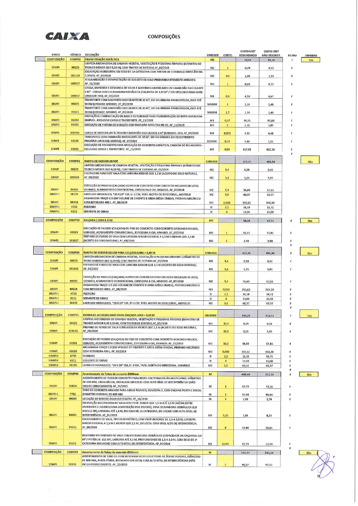 CAIXA COMPOSIÇÕES CUSTO UNIT CUSTO UNIT FONTE CÓDIGO DESCRIÇÃO UNIDADE COEFIC. DESONERADO NÃO DESONER. FILTRO IMPRIMIR COMPOSIÇÃO COMP01 PAVIMENTAÇÃO ASFÁLTICA M2 54,69 55,30 F Sim LIMPEZA MECANIZADA DE CAMADA VEGETAL, VEGETAÇÃO PEQUENAS ÁRVORES (DIÂMETRO DE SINAPI 98525 TRONCO MENOR QUE 0,20 M), COM TRATOR DE ESTEIRAS.AF_05/2018 M2 1 0,29 0,32 F ESCAVAÇÃO HORIZONTAL EM SOLO DE 1A CATEGORIA COM TRATOR DE ESTEIRAS (170HP/LÂMINA: SINAPI 101116 5,20M3). AF 07/2020 M3 0,4 1,45 1,53 F REGULARIZAÇÃO COMPACTAÇÃO DE SUBLEITO DE SOLO PREDOMINANTEMENTE ARENOSO. SINAPI 100577 AF 11/2019 M2 1 0,69 0,72 F CARGA, MANOBRA E DESCARGA DE SOLOS E MATERIAIS GRANULARES EM CAMINHÃO BASCULANTE 6 CARGA COM ESCAVADEIRA HIDRÁULICA (CAÇAMBA DE 1,20 / 155 HP) E DESCARGA LIVRE SINAPI 100977 (UNIDADE: AF_07/2020 M3 0,4 4,50 4,67 F TRANSPORTE COM CAMINHÃO BASCULANTE DE 10 EM VIA URBANA DMT ATÉ SINAPI 95875 30 KM (UNIDADE: M3XKM). AF 07/2020 2 1,36 1,40 F TRANSPORTE COM CAMINHÃO BASCULANTE DE 10 EM VIA URBANA PAVIMENTADA, DMT ATÉ SINAPI 95875 30 KM (UNIDADE: M3XKM). AF 07/2020 1,7 1,36 1,40 F EXECUÇÃO COMPACTAÇÃO DE BASE E OU SUB BASE PARA PAVIMENTAÇÃO DE BRITA GRADUADA SINAPI 96396 SIMPLES EXCLUSIVE CARGA E TRANSPORTE. AF 11/2019 M3 0,17 96,95 97,60 F SINAPI 96402 EXECUÇÃO DE PINTURA DE LIGAÇÃO COM EMULSÃO ASFÁLTICA RR-2C. AF_11/2019 M2 1 1,76 1,82 F SINAPI 100985 CARGA DE MISTURA ASFÁLTICA EM CAMINHÃO BASCULANTE 6 (UNIDADE: AF_07/2020 M3 0,072 4,32 4,48 F TRANSPORTE COM CAMINHÃO BASCULANTE DE 10 EM VIA URBANA EM REVESTIMENTO SINAPI 93589 PRIMÁRIO (UNIDADE: M3XKM). 07/2020 0,15 1,48 1,51 F EXECUÇÃO DE PAVIMENTO COM APLICAÇÃO DE CONCRETO ASFÁLTICO, CAMADA DE ROLAMENTO SINAPI 95995 EXCLUSIVE CARGA E TRANSPORTE. AF_11/2019 M3 0,03 917,93 922,26 F COMPOSIÇÃO COMP02 RAMPA DE ACESSIBILIDADE UNIDADE 471,05 495,34 Não LIMPEZA MECANIZADA DE CAMADA VEGETAL, VEGETAÇÃO PEQUENAS ÁRVORES (DIÂMETRO DE SINAPI 98525 TRONCO MENOR QUE 0,20 M), COM TRATOR DE ESTEIRAS.AF 05/2018 M2 5,4 0,29 0,32 PREPARO DE FUNDO DE VALA COM LARGURA MENOR QUE 1,5 M (ACERTO DO SOLO NATURAL). SINAPI 101616 AF_08/2020 M2 5,4 5,25 5,85 EXECUÇÃO DE PASSEIO (CALÇADA) OU PISO DE CONCRETO COM CONCRETO MOLDADO IN LOCO, SINAPI 94993 USINADO, ACABAMENTO ESPESSURA 6 ARMADO. AF 07/2016 M2 5,4 56,65 57,81 SINAPI-I 38135 LADRILHO HIDRAULICO, *20 20* E=2 CM, TATIL ALERTA OU AMARELO M2 0,6 60,37 60,37 ARGAMASSA TRAÇO 1:3 (EM VOLUME DE CIMENTO E AREIA MÉDIA ÚMIDA), PREPARO MECÂNICO SINAPI 88628 COM BETONEIRA 400 AF 08/2019 M3 0,018 355,62 364,20 SINAPI-I 4750 PEDREIRO H 2,5 16,18 18,71 SINAPI-I 6111 SERVENTE DE OBRAS H 4 13,04 15,08 COMPOSIÇÃO COMP03 CALÇADA 1,50M 6CM M2 59,24 60,71 F Sim EXECUÇÃO DE PASSEIO (CALÇADA) OU PISO DE CONCRETO COM CONCRETO MOLDADO IN LOCO, SINAPI 94993 USINADO, ACABAMENTO CONVENCIONAL, ESPESSURA 6 CM, ARMADO. AF 07/2016 M2 1 56,65 57,81 F PREPARO DE FUNDO DE VALA COM LARGURA MAIOR OU IGUAL A 1,5 M E MENOR QUE 2,5 M SINAPI 101617 (ACERTO DO SOLO NATURAL). AF 08/2020 M2 1 2,59 2,90 F F COMPOSIÇÃO COMP04 RAMPA DE ACESSIBILIDADE PARA CALÇADA LARG 3,00 UNIDADE 471,05 495,34 F Sim LIMPEZA MECANIZADA DE CAMADA VEGETAL, VEGETAÇÃO E PEQUENAS ÁRVORES (DIÂMETRO DE SINAPI 98525 TRONCO MENOR QUE M), COM TRATOR DE ESTEIRAS.AF 05/2018 M2 5,4 0,29 0,32 F PREPARO DE FUNDO DE VALA COM LARGURA MENOR QUE 1,5 M (ACERTO DO SOLO NATURAL). SINAPI 101616 AF 08/2020 M2 5,4 5,25 5,85 F EXECUÇÃO DE PASSEIO (CALÇADA) OU PISO DE CONCRETO COM CONCRETO MOLDADO IN LOCO, SINAPI 94993 USINADO, ACABAMENTO CONVENCIONAL, ESPESSURA 6 ARMADO. AF 07/2016 M2 5,4 56,65 57,81 F ARGAMASSA TRAÇO 1:3 (EM VOLUME DE CIMENTO AREIA MÉDIA ÚMIDA), PREPARO MECÂNICO SINAPI 88628 COM BETONEIRA 400 08/2019 M3 0,018 355,62 364,20 F SINAPI-I 4750 PEDREIRO H 2,5 16,18 18,71 F SINAPI-I 6111 SERVENTE DE OBRAS H 4 13,04 15,08 F SINAPI-I 38135 LADRILHO HIDRAULICO, *20 20* CM, CM, TATIL ALERTA OU AMARELO M2 0,6 60,37 60,37 F F COMPOSIÇÃO RAMPA DE ACESSIBILIDADE PARA CALÇADA LARG 3,00 M UNIDADE 883,22 916,52 F Sim LIMPEZA MECANIZADA DE CAMADA VEGETAL, VEGETAÇÃO E PEQUENAS ÁRVORES (DIÂMETRO DE SINAPI 98525 TRONCO MENOR QUE COM TRATOR DE ESTEIRAS.AF 05/2018 M2 10,2 0,29 0,32 F PREPARO DE FUNDO DE VALA COM LARGURA MENOR QUE 1,5 M (ACERTO DO SOLO NATURAL). SINAPI 101616 AF_08/2020 M2 10,2 5,25 5,85 F EXECUÇÃO DE PASSEIO (CALÇADA) OU PISO DE CONCRETO COM CONCRETO MOLDADO IN LOCO, SINAPI 94993 USINADO, ACABAMENTO CONVENCIONAL, ESPESSURA 6 ARMADO. AF 07/2016 M2 10,2 56,65 57,81 F ARGAMASSA TRAÇO 1:3 (EM VOLUME DE CIMENTO E AREIA MÉDIA ÚMIDA), PREPARO SINAPI 88628 COM BETONEIRA AF 08/2019 M3 0,066 355,62 364,20 F SINAPI-I 4750 PEDREIRO H 2,5 16,18 18,71 F SINAPI-I 6111 SERVENTE DE OBRAS H 4 13,04 15,08 F SINAPI-I 38135 LADRILHO HIDRAULICO, *20 20* E=2 CM, TATIL ALERTA OU DIRECIONAL, AMARELO M2 2,2 60,37 60,37 F F COMPOSIÇÃO COMP06 Assentamento de Tubos de concreto 0600mm M 400,40 422,24 F Sim ASSENTAMENTO DE TUBO DE CONCRETO PARA REDES COLETORAS DE ÁGUAS PLUVIAIS, DIÂMETRO DE 600 MM, JUNTA RÍGIDA, INSTALADO EM LOCAL COM ALTO NÍVEL DE INTERFERÊNCIAS (NÃO SINAPI 92824 INCLUI FORNECIMENTO). AF_12/2015 M 1 67,73 73,16 F TUBO DE CONCRETO ARMADO PARA AGUAS PLUVIAIS, CLASSE PA-2, COM ENCAIXE PONTA E BOLSA, SINAPI-I 7762 DIAMETRO NOMINAL DE 600 MM M 1 95,44 95,44 F SINAPI 99063 LOCAÇÃO DE REDE DE ÁGUA OU ESGOTO. AF_10/2018 M 1 3,48 3,78 F ESCAVAÇÃO MECANIZADA DE VALA COM PROF. MAIOR QUE 1,5 M ATÉ 3,0 M (MÉDIA ENTRE MONTANTE E JUSANTE/UMA COMPOSIÇÃO POR TRECHO), COM ESCAVADEIRA HIDRÁULICA (0,8 M3/111 HP), LARGURA ATÉ 1,5 M, EM SOLO DE 1A CATEGORIA, EM LOCAIS COM ALTO NÍVEL DE SINAPI 90084 INTERFERÊNCIA. AF 01/2015 M3 5,15 7,84 8,24 F ESCORAMENTO DE VALA, TIPO DESCONTÍNUO, COM PROFUNDIDADE DE 1,5 A 3,0 M, LARGURA MAIOR OU IGUAL A 1,5 M E MENOR QUE 2,5 M, EM LOCAL COM NÍVEL ALTO DE INTERFERÊNCIA. SINAPI 94052 AF_06/2016 M2 4 33,40 36,01 F REATERRO MECANIZADO DE VALA COM ESCAVADEIRA HIDRÁULICA (CAPACIDADE DA C