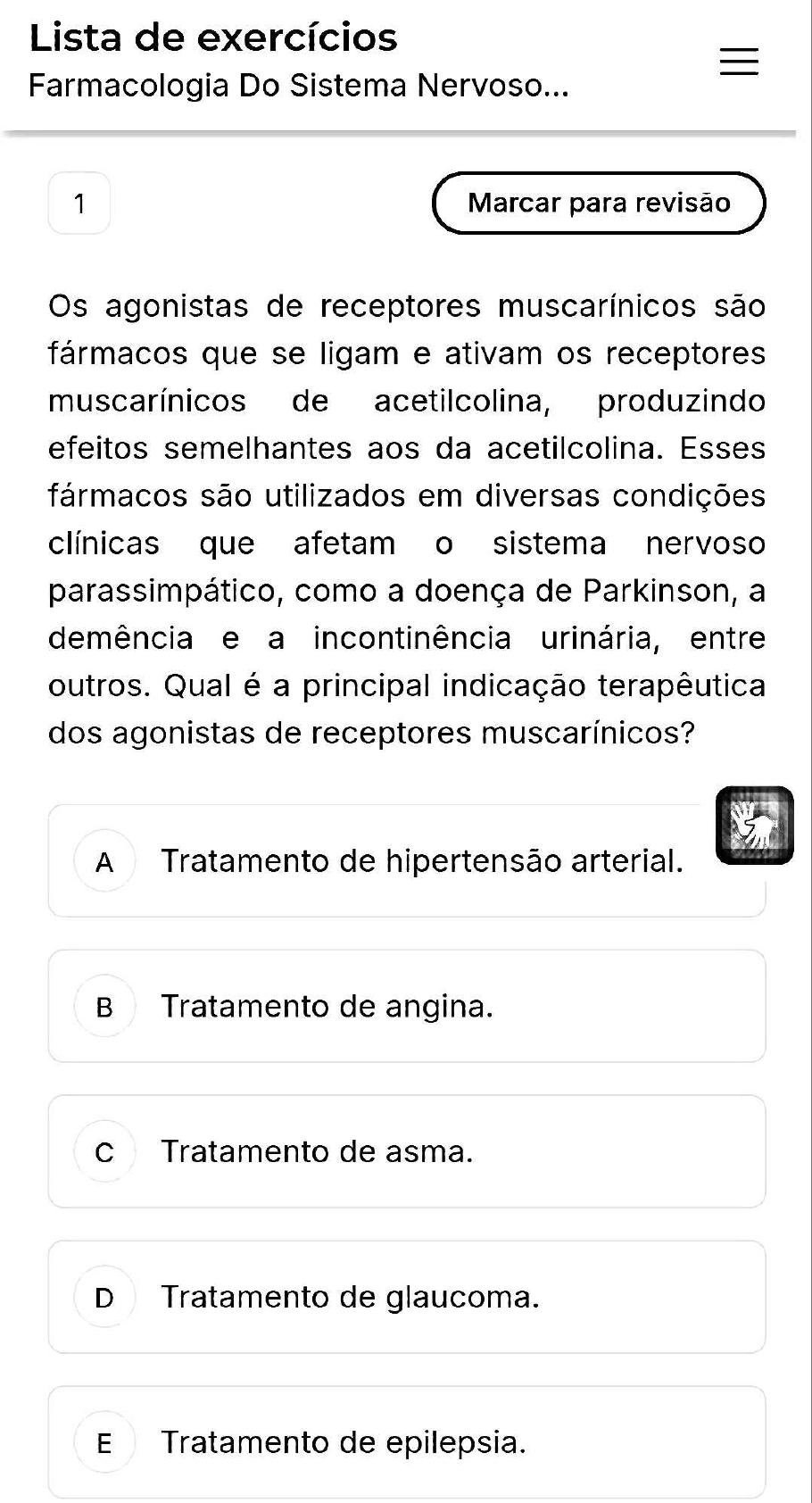 Lista de exercícios Farmacologia Do Sistema Nervoso... 1 Marcar para revisão Os agonistas de receptores muscarínicos são fármacos que se ligam e ativam os receptores muscarínicos de acetilcolina, produzindo efeitos semelhantes aos da acetilcolina. Esses fármacos são utilizados em diversas condições clínicas que afetam o sistema nervoso parassimpático, como a doença de Parkinson, a demência e a incontinência urinária, entre outros. Qual é a principal indicação terapêutica dos agonistas de receptores muscarínicos? A Tratamento de hipertensão arterial. Tratamento de angina. c Tratamento de asma. D Tratamento de glaucoma. E Tratamento de epilepsia.Lista de exercícios Farmacologia Do Sistema Nervoso... 2 Marcar para revisão A variação do potencial de membrana é responsável por diversos processos celulares, como a transmissão nervosa, a contração muscular e a secreção glandular. Esses mecanismos podem levar a distúrbios patológicos, como arritmias cardíacas, epilepsia e doenças neuromusculares. O que é o potencial de membrana? A concentração de íons dentro da A célula. A concentração de íons fora da célula. A diferença de carga elétrica entre o interior e exterior da célula. A velocidade de transmissão de sinais D elétricos pela membrana. A força exercida pelos íons na E membrana.07:18 LTE 37% Lista de exercícios Farmacologia Do Sistema Nervoso... 3 Marcar para revisão A neostigmina é um fármaco que interfere no sistema nervoso parassimpático e pode ser utilizado em situações nas quais há comprometimento da ativação da junção neuromuscular como na miastenia gravis. Esse fármaco é utilizado, pois: A Bloqueia a ação da acetilcolina Age como agonista de receptores nicotínicos c Tem ação anticolinesterásica Mimetiza a ação da acetilcolina D ligando-se aos receptores muscarínicos Aumenta número de receptores de E acetilcolinaLista de exercícios Farmacologia Do Sistema Nervoso... 5 Marcar para revisão Relacione os receptores adrenérgicos com sua localização e mecanismo de ação. I) Receptores Alfa-1 II) Receptores Alfa-2 III) Receptores Beta-1 IV) Receptores Beta-2 Atuam mediando a broncodilatação e relaxamento uterino. Estão envolvidos nos efeitos dos simpaticomiméticos sobre o coração. Localizados nas terminações nervosas pr sinápticas, envolvidos com o mecanismo de feedback, na inibição da liberação de noradrenalina. Localizados, predominantemente, nas pós- sinapses dos músculos lisos e glândulas e são envolvidos nas ações vasoconstritoras dos simpaticomiméticos. Marque a opção com a correlação correta:Lista de exercícios Farmacologia Do Sistema Nervoso... 6 Marcar para revisão A sobredosagem com drogas de abuso, como anfetaminas e cocaína, pode levar a hipertensão grave por causa de suas ações simpaticomiméticas. Esta hipertensão pode ser controlada pelo uso de qual medicamento? A Dobutamina Prazosina c Ipatrópio D Pralidoxima E PiridostigminaLista de exercícios Farmacologia Do Sistema Nervoso... propranolol é uma droga indicada para controle da hipertensão; controle de angina pectoris; controle das arritmias cardíacas; profilaxia da enxaqueca; controle do tremor essencial; controle da ansiedade e taquicardia por ansiedade; controle adjuvante da tireotoxicose e crise tireotóxica; controle da cardiomiopatia hipertrófica obstrutiva e controle de feocromocitoma. Analisando as indicações terapêuticas do propranolol, assinale a alternativa referente a sua classificação farmacológica: Agonista dos receptores adrenérgico A alfa-1 seletivos Antagonista dos receptores adrenérgicos alfa-1 seletivos Antagonista dos receptores c adrenérgicos beta não seletivos Agonista dos receptores adrenérgicos D beta-1 seletivos Agonista dos receptores adrenérgicosLista de exercícios Farmacologia Do Sistema Nervoso... 8 Marcar para revisão Os antagonistas dos receptores ß adrenérgicos, também conhecidos como beta-bloqueadores, são um tipo de medicamento que bloqueia a ação dos neurotransmissores adrenérgicos, como a adrenalina e a noradrenalina, nos receptores beta-1 e beta-2. Qual é a principal indicação terapêutica dos antagonistas dos receptores ß adrenérgicos? A Tratamento de hipertensão arterial. Tratamento de asma. c Tratamento de insuficiência cardíaca. D Tratamento de disfunção erétil. E Tratamento de ansiedade.Lista de exercícios Farmacologia Do Sistema Nervoso... potencial de membrana é uma diferença de carga elétrica que existe entre o interior e exterior de uma célula, em virtude da distribuição de íons em ambos os lados da membrana plasmática. Qual é o principal processo responsável pela manutenção do potencial de membrana em uma célula? A A bomba de sódio e potássio. A difusão de íons através da membrana. c A síntese de ATP pela célula. D A atividade metabólica da célula. E A absorção de nutrientes pela célula.Lista de exercícios Farmacologia Do Sistema Nervoso... A adrenalina tem um efeito poderoso no corpo, aumentando a frequência cardíaca, a pressão arterial, o fluxo sanguíneo para os músculos e nível de glicose no sangue, enquanto ao mesmo tempo diminui a atividade do sistema digestivo. Isso prepara o corpo para enfrentar situações de perigo iminente, permitindo que ele lide com as ameaças de forma mais eficaz. Qual é o principal receptor ativado pela adrenalina nos tecidos efetores? A Receptor beta-1. Receptor beta-2. c Receptor alfa-1. D Receptor alfa-2. E Receptor nicotínico.