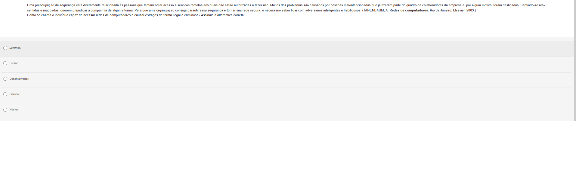 Uma preocupação da segurança diretamente relacionada às pessoas que tentam obter acesso a serviços remotos aos quais não estão autorizadas a fazer uso. Muitos dos problemas são causados por pessoas mal-intencionadas que já fizeram parte do quadro de colaboradores da empresa e, por algum motivo, foram desligadas. Sentindo-se res- sentidas e magoadas, querem prejudicar a companhia de alguma forma. Para que uma organização consiga garantir essa segurança e tornar sua rede segura, necessário saber lidar com adversários inteligentes e (TANENBAUM, A. Redes de Rio de Janeiro: Elsevier, 2003.) Como se chama indivíduo capaz de acessar redes de computadores e causar estragos de forma ilegal e criminosa? Assinale a alternativa Espião. Cracker. Hacker.