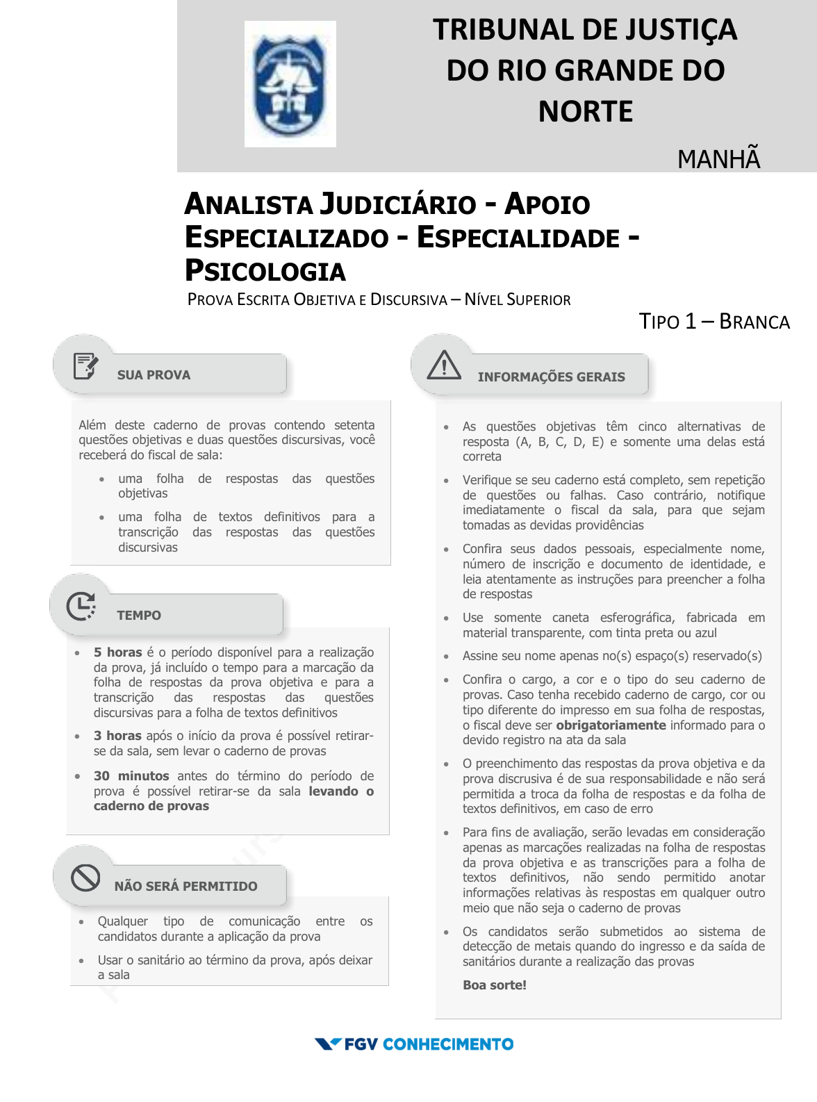 pcimarkpci MjgwNDowMTRjOmRhYTc6ODMzZjo1ODA0OmY5Mzg6MGEwODo0NzEy:U3VuLCAyMiBKdW4gMjAyNSAxMTo0MzozMiAtMDMwMA== www.pciconcursos.com.br TRIBUNAL DE JUSTIÇA DO RIO GRANDE DO NORTE MANHÃ ANALISTA JUDICIÁRIO - APOIO ESPECIALIZADO - ESPECIALIDADE - PSICOLOGIA PROVA ESCRITA OBJETIVA E DISCURSIVA – NÍVEL SUPERIOR TIPO 1 – BRANCA Além deste caderno de provas contendo setenta questões objetivas e duas questões discursivas, você receberá do fiscal de sala: uma folha de respostas das questões objetivas uma folha de textos definitivos para a transcrição das respostas das questões discursivas As questões objetivas têm cinco alternativas de resposta (A, B, C, D, E) e somente uma delas está correta Verifique se seu caderno está completo, sem repetição de questões ou falhas. Caso contrário, notifique imediatamente o fiscal da sala, para que sejam tomadas as devidas providências Confira seus dados pessoais, especialmente nome, número de inscrição e documento de identidade, e leia atentamente as instruções para preencher a folha de respostas Use somente caneta esferográfica, fabricada em material transparente, com tinta preta ou azul Assine seu nome apenas no(s) espaço(s) reservado(s) Confira o cargo, a cor e o tipo do seu caderno de provas. Caso tenha recebido caderno de cargo, cor ou tipo diferente do impresso em sua folha de respostas, o fiscal deve ser obrigatoriamente informado para o devido registro na ata da sala O preenchimento das respostas da prova objetiva e da prova discrusiva é de sua responsabilidade e não será permitida a troca da folha de respostas e da folha de textos definitivos, em caso de erro Para fins de avaliação, serão levadas em consideração apenas as marcações realizadas na folha de respostas da prova objetiva e as transcrições para a folha de textos definitivos, não sendo permitido anotar informações relativas às respostas em qualquer outro meio que não seja o caderno de provas Os candidatos serão submetidos ao sistema de detecção de metais quando do ingresso e da saída de sanitários durante a realização das provas Boa sorte! 5 horas é o período disponível para a realização da prova, já incluído o tempo para a marcação da folha de respostas da prova objetiva e para a transcrição das respostas das questões discursivas para a folha de textos definitivos 3 horas após o início da prova é possível retirar- se da sala, sem levar o caderno de provas 30 minutos antes do término do período de prova é possível retirar-se da sala levando o caderno de provas Qualquer tipo de comunicação entre os candidatos durante a aplicação da prova Usar o sanitário ao término da prova, após deixar a sala SUA PROVA TEMPO NÃO SERÁ PERMITIDO INFORMAÇÕES GERAIS pcimarkpci MjgwNDowMTRjOmRhYTc6ODMzZjo1ODA0OmY5Mzg6MGEwODo0NzEy:U3VuLCAyMiBKdW4gMjAyNSAxMTo0MzozMiAtMDMwMA== www.pciconcursos.com.br pcimarkpci MjgwNDowMTRjOmRhYTc6ODMzZjo1ODA0OmY5Mzg6MGEwODo0NzEy:U3VuLCAyMiBKdW4gMjAyNSAxMTo0MzozMiAtMDMwMA== www.pciconcursos.com.br Tribunal de Justiça do Rio Grande do Norte FGV Conhecimento Analista Judiciário - Apoio Especializado - Especialidade - Psicologia Tipo 1 ̶ Branca – Página 3 Língua Portuguesa 1 No romance Dom Casmurro, o narrador faz uma descrição de um personagem do seguinte modo: “Levantou-se para ir buscar o gamão, que estava no interior da casa. Cosi-me muito à parede, e vi-o passar com as suas calças brancas engomadas, presilhas, rodaque e gravata de mola. Foi dos últimos que usaram presilhas no Rio de Janeiro, e talvez neste mundo. Trazia as calças curtas para que lhe ficassem bem esticadas. A gravata de cetim preto, com um arco de aço por dentro, imobilizava-lhe o pescoço; era então moda (....). Era magro, chupado, com um princípio de calva; teria os seus cinquenta e cinco anos”. A descrição desse personagem tem base: (A) predominantemente física, com traços psicológicos; (B) predominantemente psicológica, com traços físicos; (C) sociológica, explorando sua atividade profissional; (D) física, psicológica e sociológica; (E) predominantemente sociológica, com traços físicos. 2 Observe a tradução de um fragmento textual francês: “Na origem, a casa tinha sido acoplada a um computador, como tantas outras, a um computador previsional encarregado de a fazer evoluir em função dos cálculos de probabilidade de que se alimentava a máquina. A eventualidade de um inverno frio fazia com que surgisse um engrossamento progressivo das paredes, num isolamento reforçado. Uma dupla camada de telhas crescia lentamente sobre o teto, uma lareira suplementar emergia do solo como um legume perfurando a terra de um jardim.” Trata-se, no caso, de uma narrativa de ficção científica; a característica desse gênero narrativo que se aplica a esse segmento textual, é: (A) localização em um tempo futuro, que é visto como passado, a ponto de ser narrado; (B) narrativa que envolve um mundo cujos elementos são completamente desconhecidos do leitor atual; (C) apresentação de uma visão pessimista do mundo futuro, governado por máquinas incontroláveis; (D) sugestão de uma tecnologia avançada, não criada pelos humanos, mas por seres superdotados; (E) narrativa em que o próprio narrador mostra desconhecimento da realidade narrada. 3 Um escritor espanhol, conhecido por sua preocupação com o idioma, produziu a seguinte frase: “Estudar latim é como colocar as palavras para fazer ginástica”. Isso significa que: (A) o estudo de latim é hoje uma tarefa inútil, pois os estudos históricos perderam valor; (B) o conhecimento do latim melhora a qualidade redacional de nossos textos; (C) estudar a língua latina faz com que se acrescentem muitos novos vocábulos aos dicionários; (D) o aprendizado da língua latina é indispensável para o conhecimento de nosso próprio idioma; (E) estudar latim faz com que aprofundemos o conhecimento das palavras. 4 “Por que você escreve? A essa pergunt