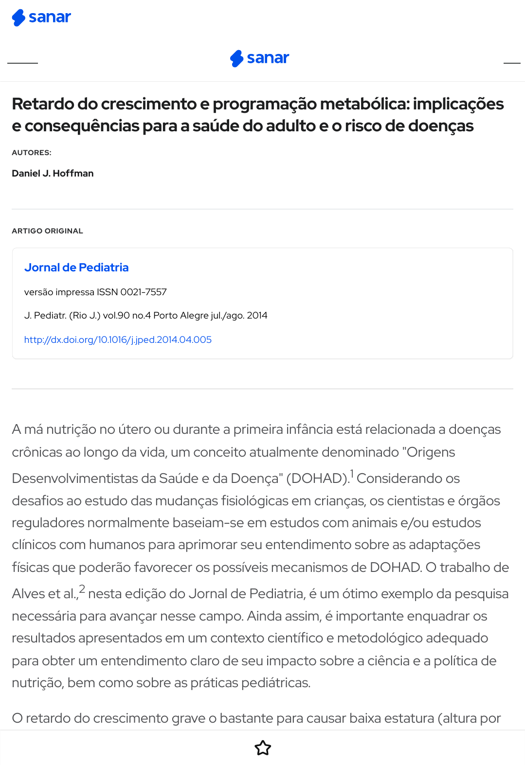 24/02/2024, 12:59 Retardo do crescimento e programação metabólica: implicações e consequências para a saúde do adulto e o risco de doen… https://www.sanarmed.com/artigos-cientificos/retardo-do-crescimento-e-programacao-metabolica-implicacoes-e-consequencias-para-a-saude-d… 1/10 Retardo do crescimento e programação metabólica: implicações e consequências para a saúde do adulto e o risco de doenças AUTORES: Daniel J. Hoffman ARTIGO ORIGINAL Jornal de Pediatria versão impressa ISSN 0021-7557 J. Pediatr. (Rio J.) vol.90 no.4 Porto Alegre jul./ago. 2014 http://dx.doi.org/10.1016/j.jped.2014.04.005 A má nutrição no útero ou durante a primeira infância está relacionada a doenças crônicas ao longo da vida, um conceito atualmente denominado "Origens Desenvolvimentistas da Saúde e da Doença" (DOHAD).1 Considerando os desafios ao estudo das mudanças fisiológicas em crianças, os cientistas e órgãos reguladores normalmente baseiam-se em estudos com animais e/ou estudos clínicos com humanos para aprimorar seu entendimento sobre as adaptações físicas que poderão favorecer os possíveis mecanismos de DOHAD. O trabalho de Alves et al.,2 nesta edição do Jornal de Pediatria, é um ótimo exemplo da pesquisa necessária para avançar nesse campo. Ainda assim, é importante enquadrar os resultados apresentados em um contexto científico e metodológico adequado para obter um entendimento claro de seu impacto sobre a ciência e a política de nutrição, bem como sobre as práticas pediátricas. O retardo do crescimento grave o bastante para causar baixa estatura (altura por idade inferior a dois desvios-padrão de uma população de referência, escore-z de Menu P Residência Artigos Científicos P sairEtapas da carreira Materiais gratuitos Sobre a Sanar Produtos da Sanar http://dx.doi.org/10.1016/j.jped.2014.04.005 http://dx.doi.org/10.1016/j.jped.2014.04.005 http://dx.doi.org/10.1016/j.jped.2014.04.005 https://www.sanarmed.com/ciclos-da-medicina/residencia-medica https://www.sanarmed.com/artigos-cientificos https://www.sanarmed.com/ https://www.sanarmed.com/ https://sanar.com.br/ 24/02/2024, 12:59 Retardo do crescimento e programação metabólica: implicações e consequências para a saúde do adulto e o risco de doen… https://www.sanarmed.com/artigos-cientificos/retardo-do-crescimento-e-programacao-metabolica-implicacoes-e-consequencias-para-a-saude-d… 2/10 altura por idade (HAZ) < -2,0) é o principal resultado da desnutrição crônica e ocorre mais frequentemente no útero e/ou nos primeiros dois anos de vida, a "janela crítica" de crescimento.3 Nos primeiros 30 meses de crescimento e desenvolvimento, células, órgãos e sistemas específicos poderão ser afetados de forma diferente pela desnutrição, dependendo do ponto específico e do tamanho da restrição de energia e/ou nutrientes. De fato, o ambiente nutricional nessa "janela crítica" é o principal determinante do crescimento, ao passo que o ambiente nutricional após os dois anos de idade influencia principalmente a composição corporal, mais que os parâmetros de crescimento e desenvolvimento. Basicamente, uma criança na idade de dois anos encontra-se em um momento em que a energia e os nutrientes que anteriormente eram direcionados ao crescimento são, agora, direcionados ao peso e à composição corporal, criando, assim, o ambiente alimentar que permitirá que possíveis adaptações da restrição de energia anterior se manifestem. Os estudos sobre a relação entre baixa estatura e doenças crônicas iniciaram na metade dos anos 1990, quando Popkin et al.4 relataram que adultos que tiveram baixa estatura quando adolescentes tinham mais chances de estarem acima do peso que seus pares com estatura normal. Os dados de duas coortes longitudinais sugerem que o retardo do crescimento na infância predispõe uma criança a desenvolver obesidade ou ficar acima do peso na segunda infância ou na vida adulta.5 and 6 Contudo, alguns estudos constataram que a baixa estatura não está relacionada à adiposidade em um período posterior da vida.7 and 8 Apesar de esses estudos parecerem contraditórios, é importante considerar que as adaptações biológicas nem sempre se manifestam sem algum estímulo ambiental, como o consumo de açúcar refinado cada vez maior ou o balanço energético positivo crônico, condições mais comumente associadas à "transição nutricional" que acompanha o desenvolvimento econômico.9 As diferenças no nível de desenvolvimento socioeconômico que causam um ambiente "obesogênico" poderão limitar as adaptações fisiológicas e fazer com que se manifestem como massa de gordura em excesso ou obesidade. Mesmo assim, ainda existe a falta de um mecanismo biológico para explicar a relação entre a baixa estatura e doenças crônicas. 24/02/2024, 12:59 Retardo do crescimento e programação metabólica: implicações e consequências para a saúde do adulto e o risco de doen… https://www.sanarmed.com/artigos-cientificos/retardo-do-crescimento-e-programacao-metabolica-implicacoes-e-consequencias-para-a-saude-d… 3/10 Um possível mecanismo, conforme mencionado no trabalho de Alves et al.,2 é uma adaptação no metabolismo lipídico. Em 2000, relatamos que as crianças com baixa estatura das favelas de São Paulo, Brasil, metabolizavam lipídios a uma taxa menor em comparação a crianças com estatura normal do mesmo ambiente socioeconômico, independentemente da alimentação e de outros fatores de confusão.10 Um estudo semelhante realizado com homens do Hertfordshire Cohort, na Inglaterra, constatou que os homens que sofreram restrição do crescimento intrauterino tinham uma taxa menor de oxidação de lipídios em comparação aos homens nascidos com peso normal.11 Por fim, um estudo que combinou nutrição humana e antropologia foi realizado com adultos buriatas, no sul da Sibéria, que sofriam de desnutrição sazonal após o colapso da União Soviética.12 