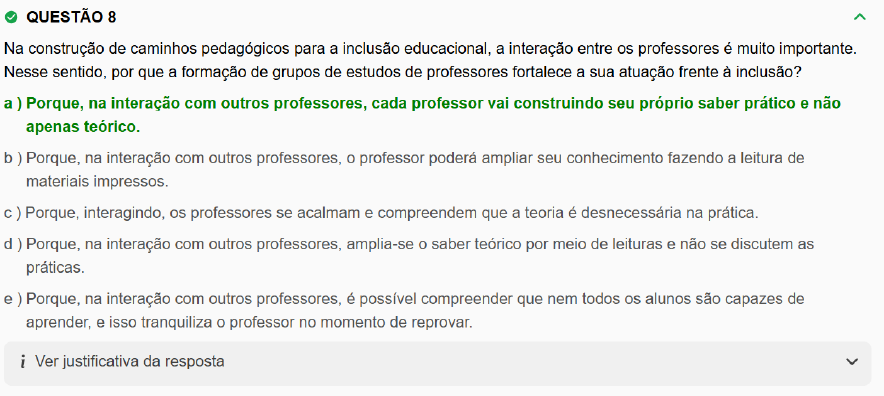 QUESTÃO 8 Na construção de caminhos pedagógicos para a inclusão educacional, a interação entre os professores é muito importante. Nesse sentido, por que a formação de grupos de estudos de professores fortalece a sua atuação frente à inclusão? a) Porque, na interação com outros professores, cada professor vai construindo seu próprio saber prático e não apenas teórico. b) Porque, na interação com outros professores, professor poderá ampliar seu conhecimento fazendo a leitura de materiais impressos. c) Porque, interagindo, professores se acalmam e compreendem que a teoria é desnecessária na prática. d) Porque, na interação com outros professores, amplia-se saber teórico por meio de leituras e não se discutem as práticas. e ) Porque, na interação com outros professores, é possível compreender que nem todos os alunos são capazes de aprender, e isso tranquiliza o professor no momento de reprovar. i Ver justificativa da resposta